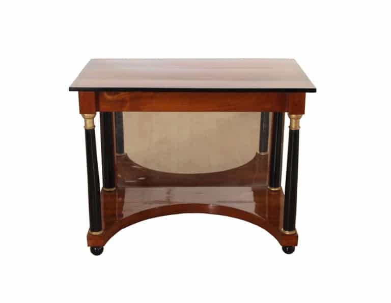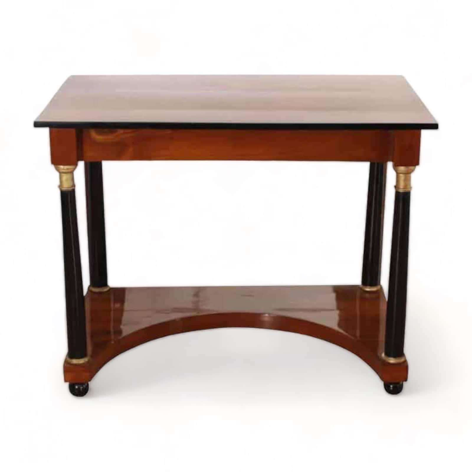 This Biedermeier console table is from Germany, circa 1820. The concave base veneered in cherrywood has a mirror in the back. The plate is also cherry solid wood with ebonized parts and ink line running circumferentially around the edges. All the wood is also hand-polished with shellac (French Polish). The Biedermeier console table has two black half columns and two black full columns with gold-painted capitals and bases. Overall a wonderful piece of antique furniture that is ready for your home today.