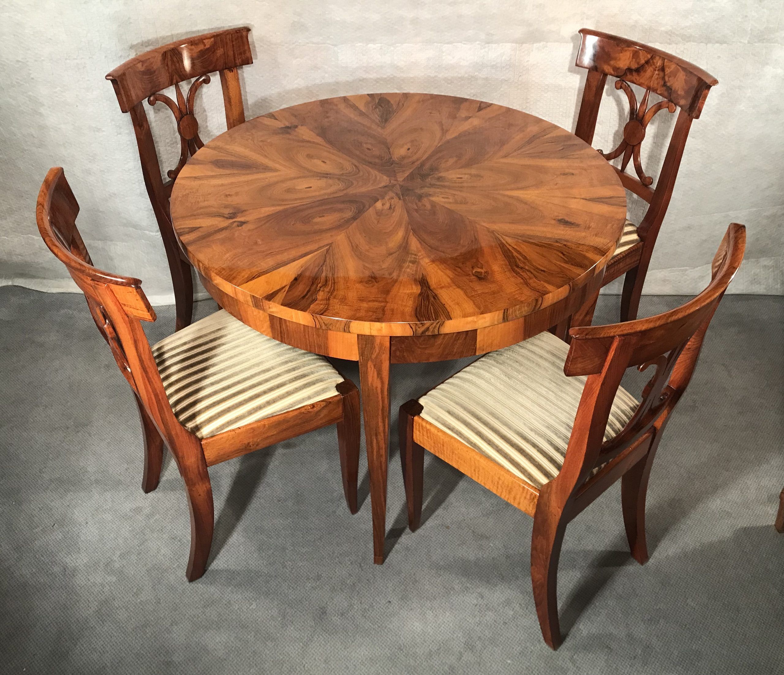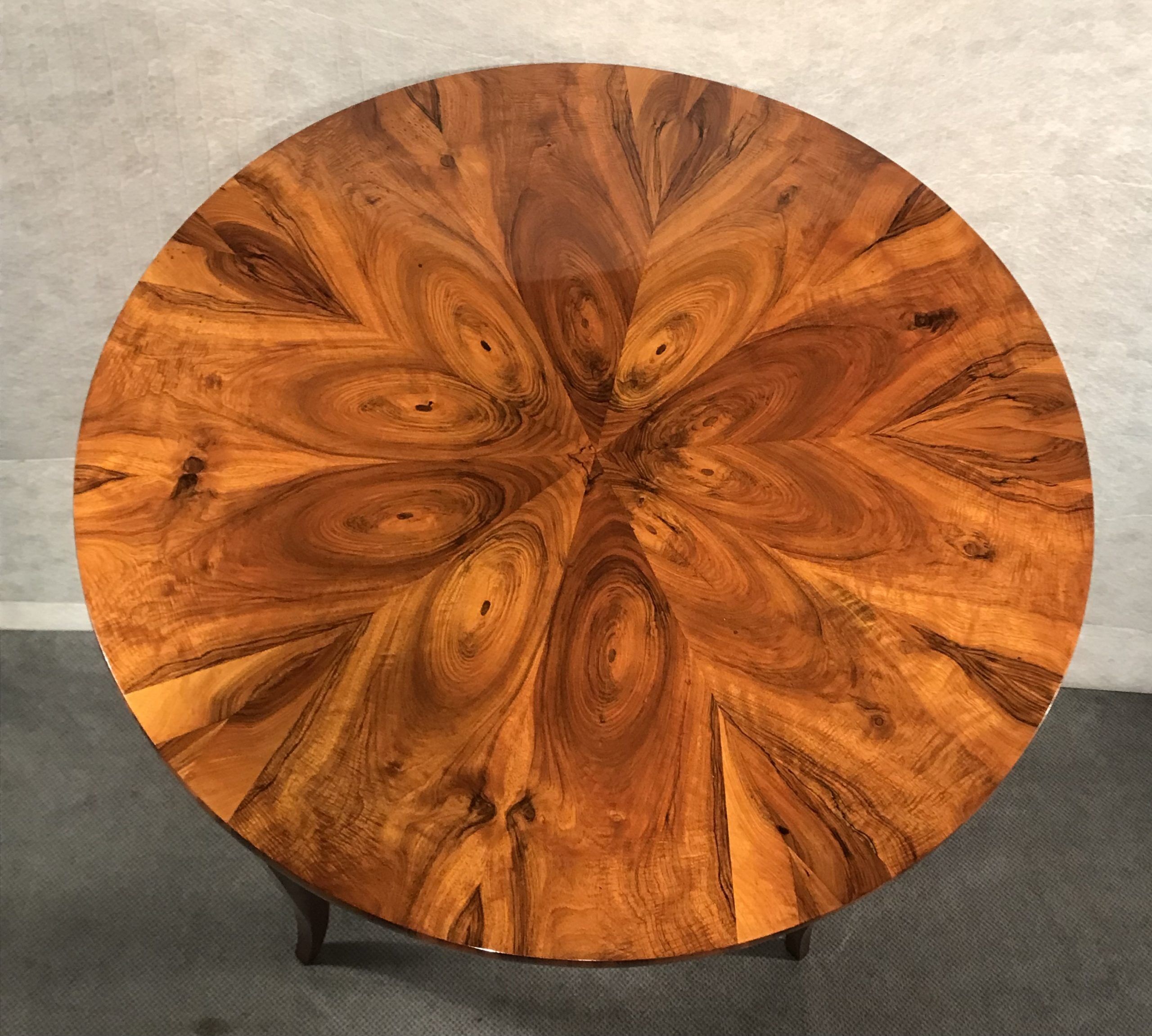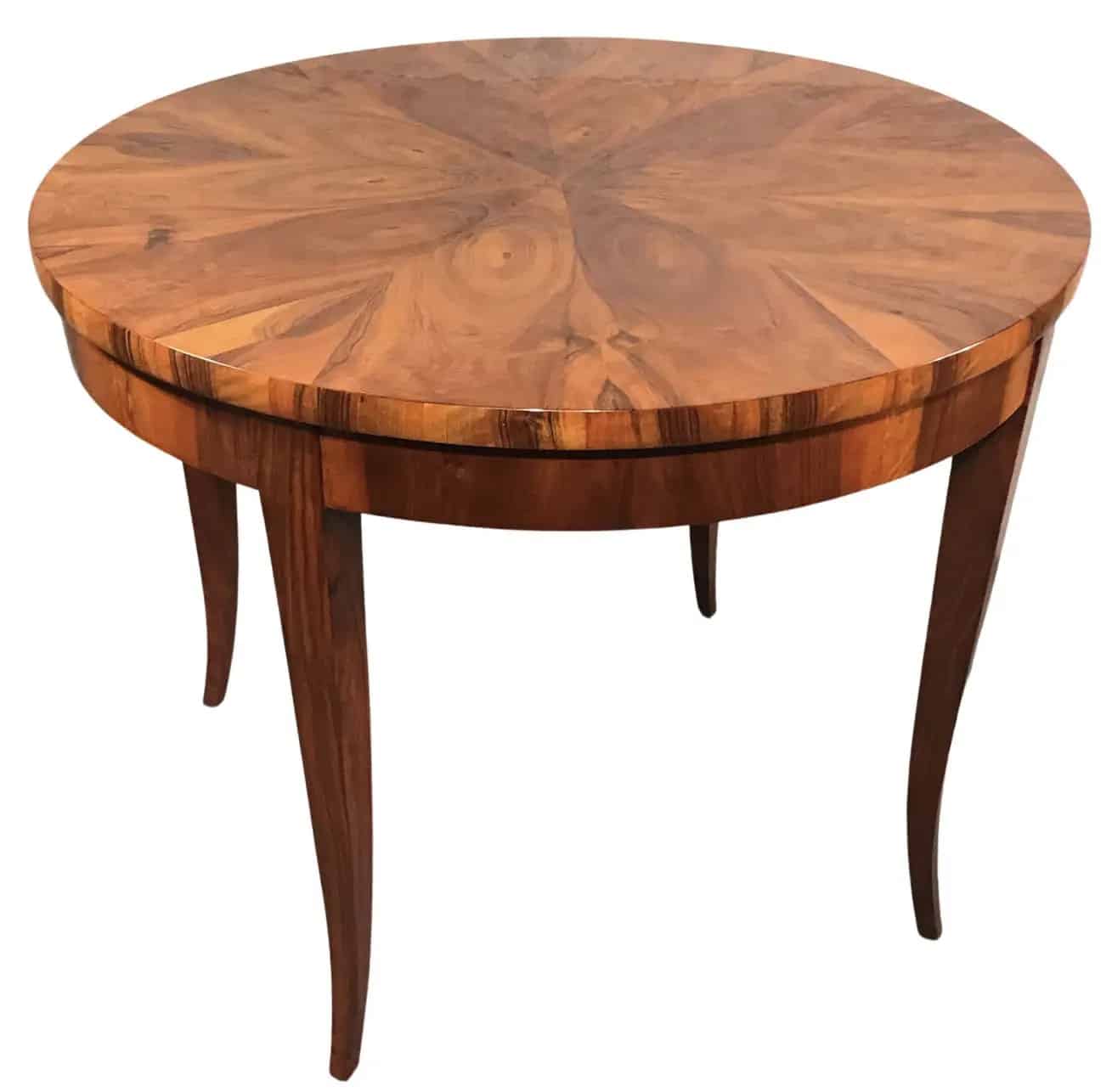 This original 1820’s Biedermeier table comes from Southern Germany. The table stands on four slender legs. The sleek design of the Biedermeier table makes it suitable for any interior design style. You could combine it very well with modern, as well as with antique chairs. Or just use it as center table in your entry way. The top has an exquisite piecrust walnut veneer.