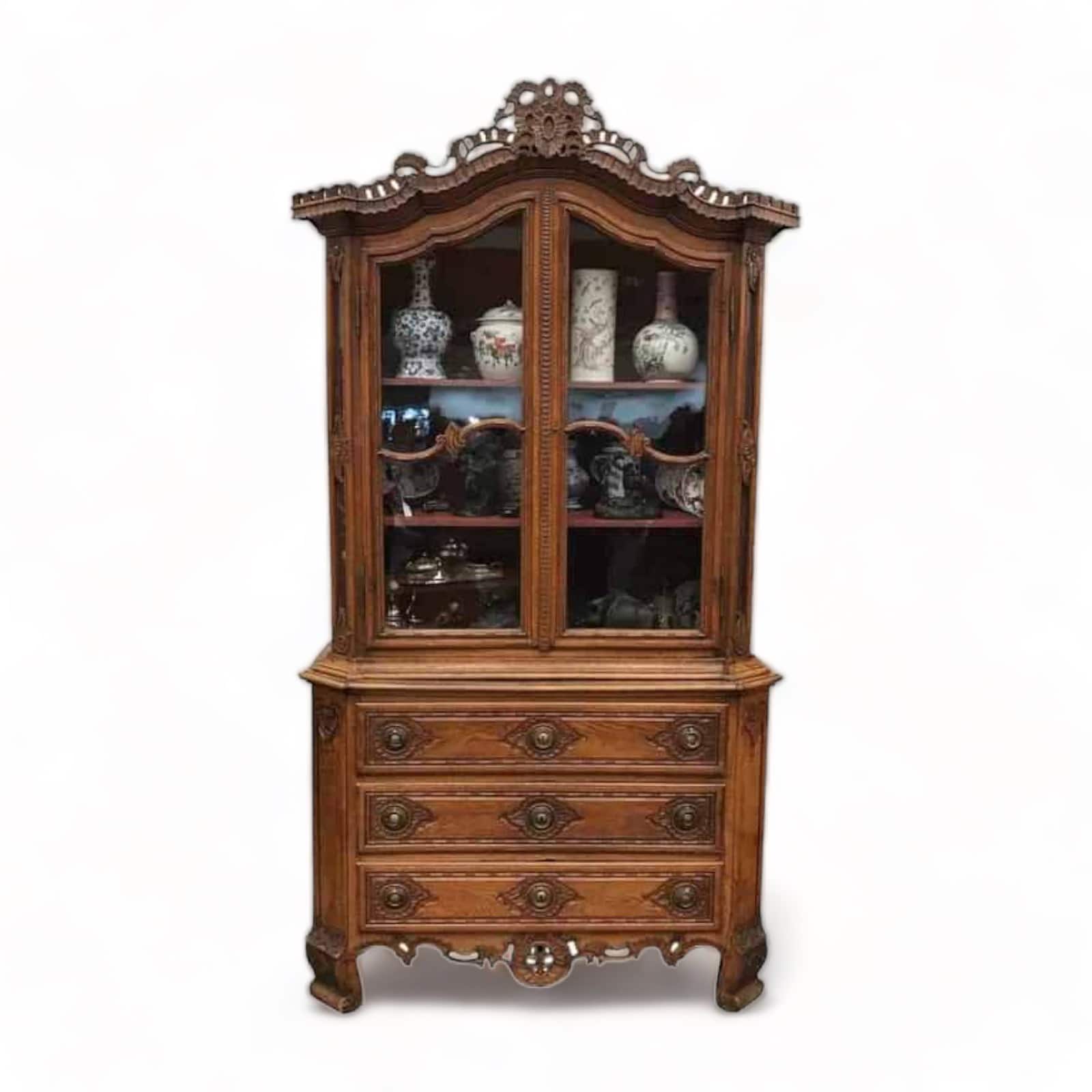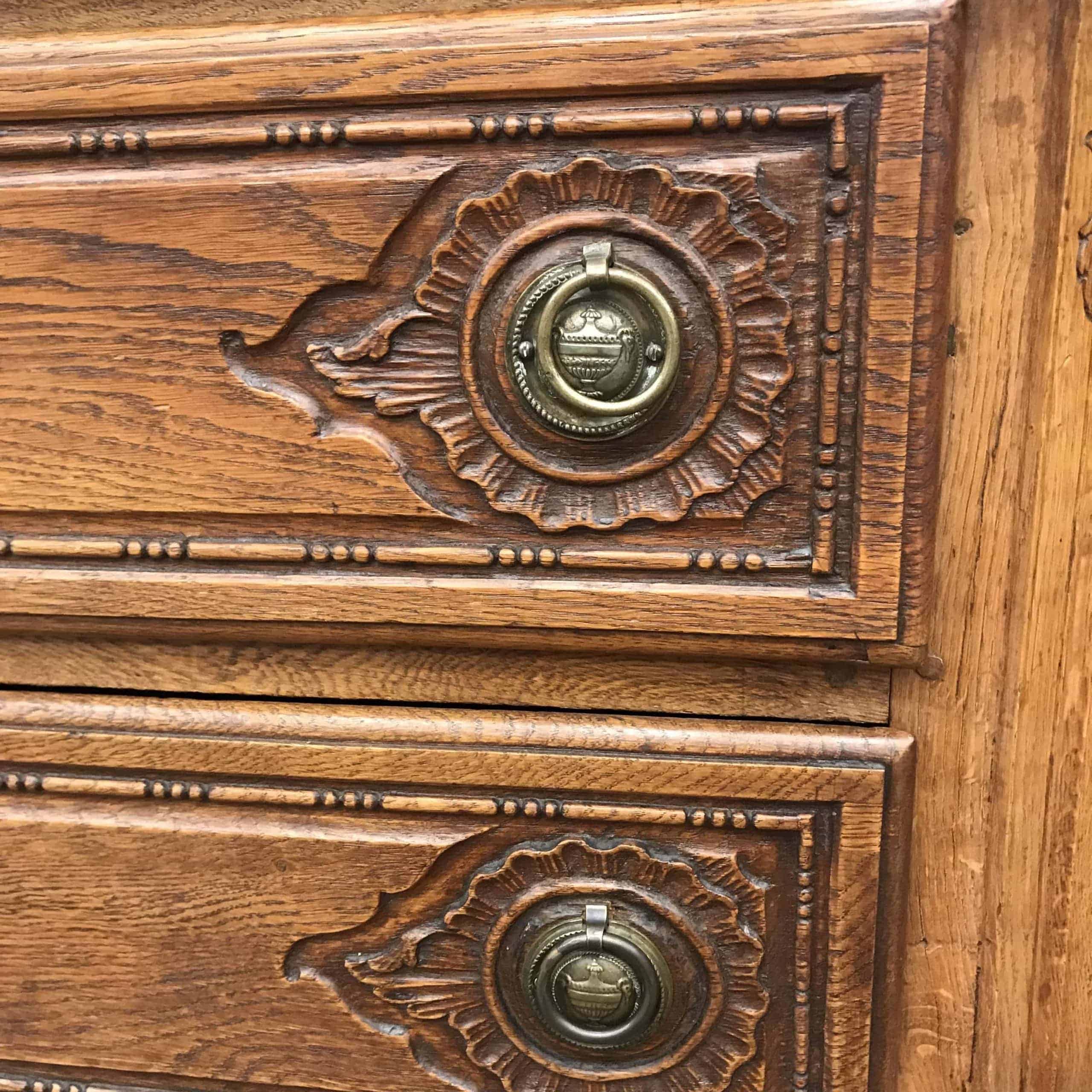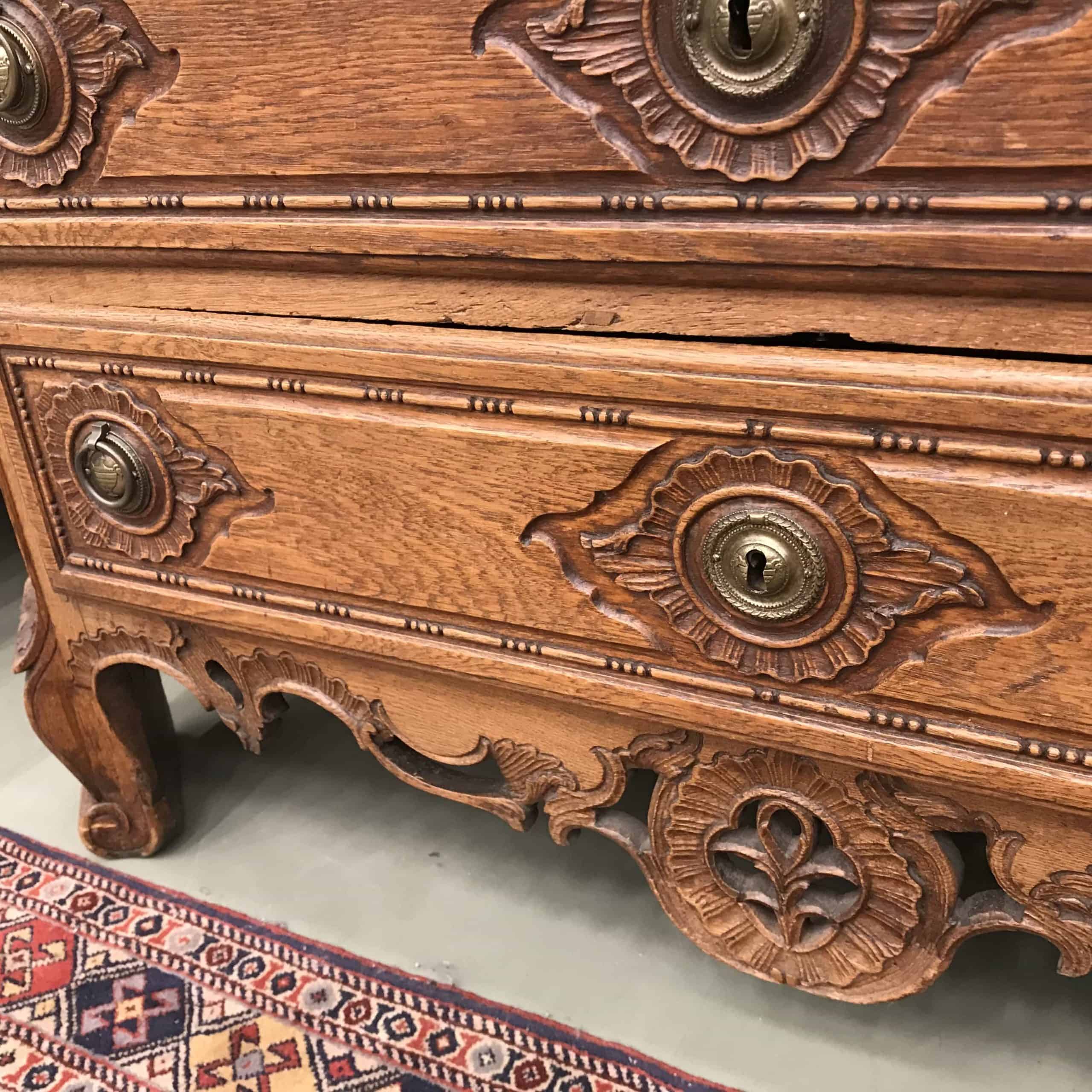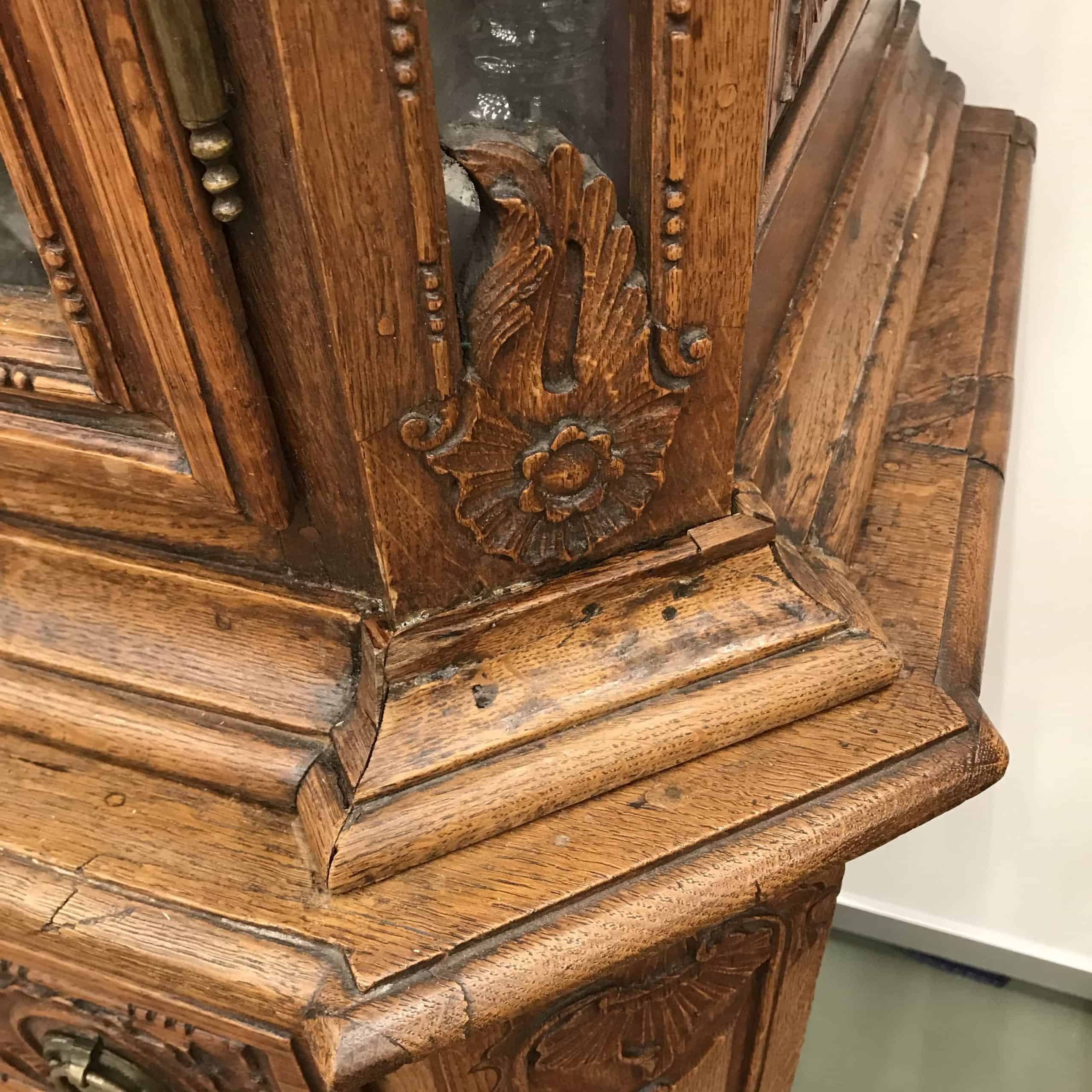 18th century baroque cabinet, Aachen (Germany) 1770, oak exquisitely carved. Top section with glass doors and interior shelves. Bottom section with three large drawers.