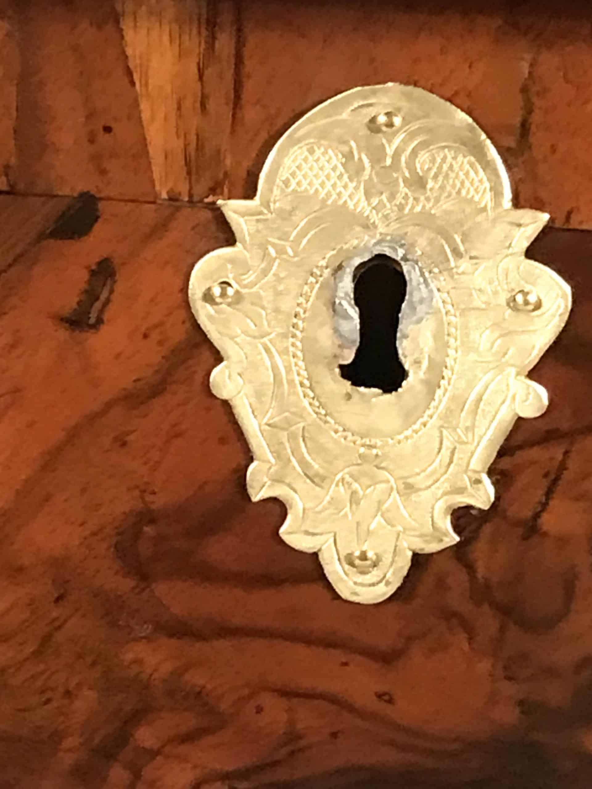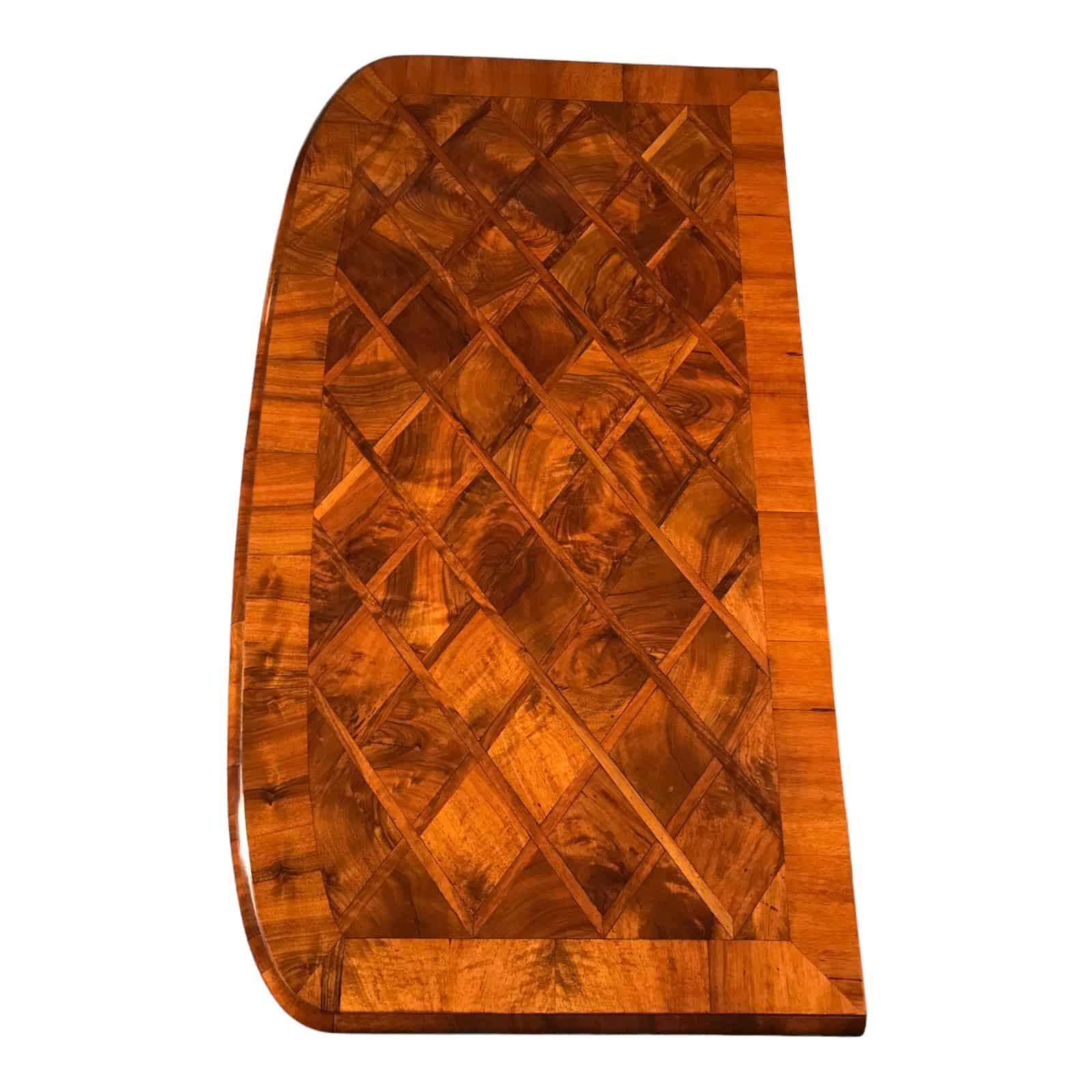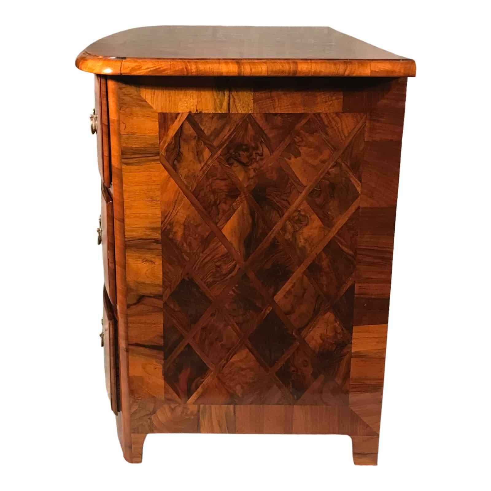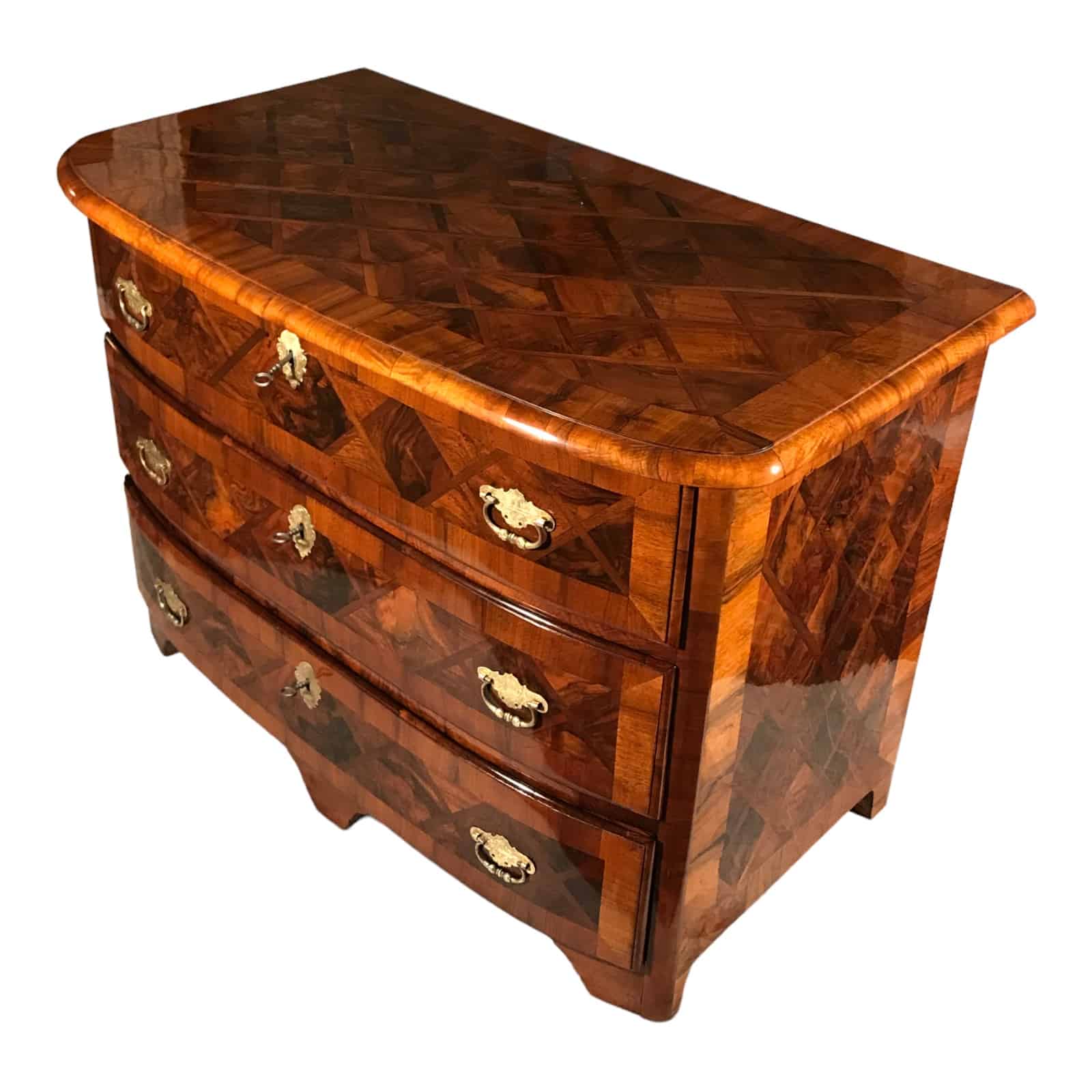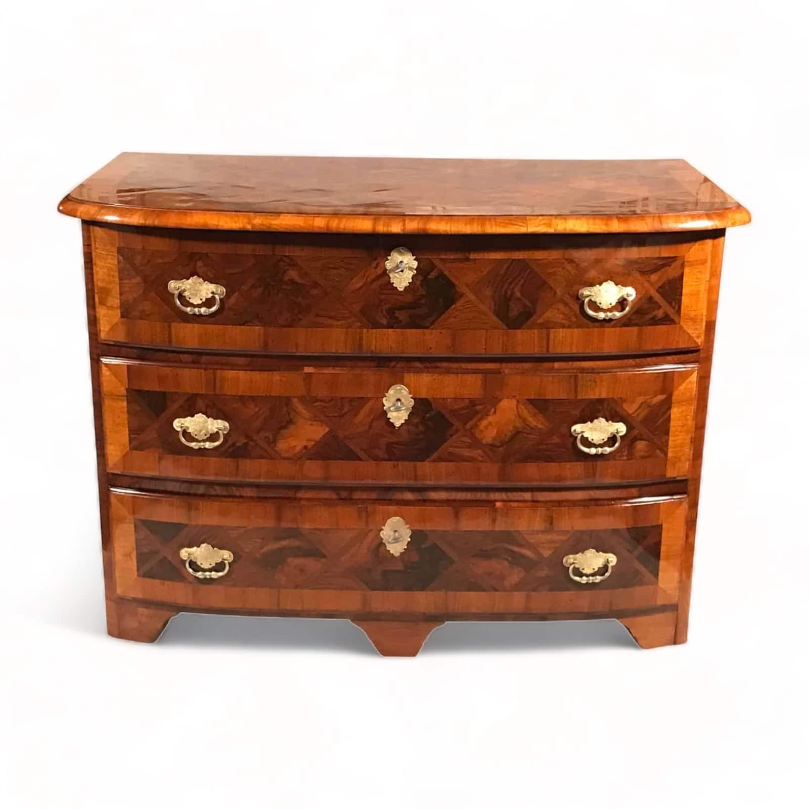 This original 18th century baroque chest of drawers comes from Switzerland. It dates back to around 1760. The slightly convex three drawer chest has a very pretty walnut veneer pattern with diamond shaped inlays. The chest has been expertly refinished in Germany and has a shellac hand polish. It has its original fittings.