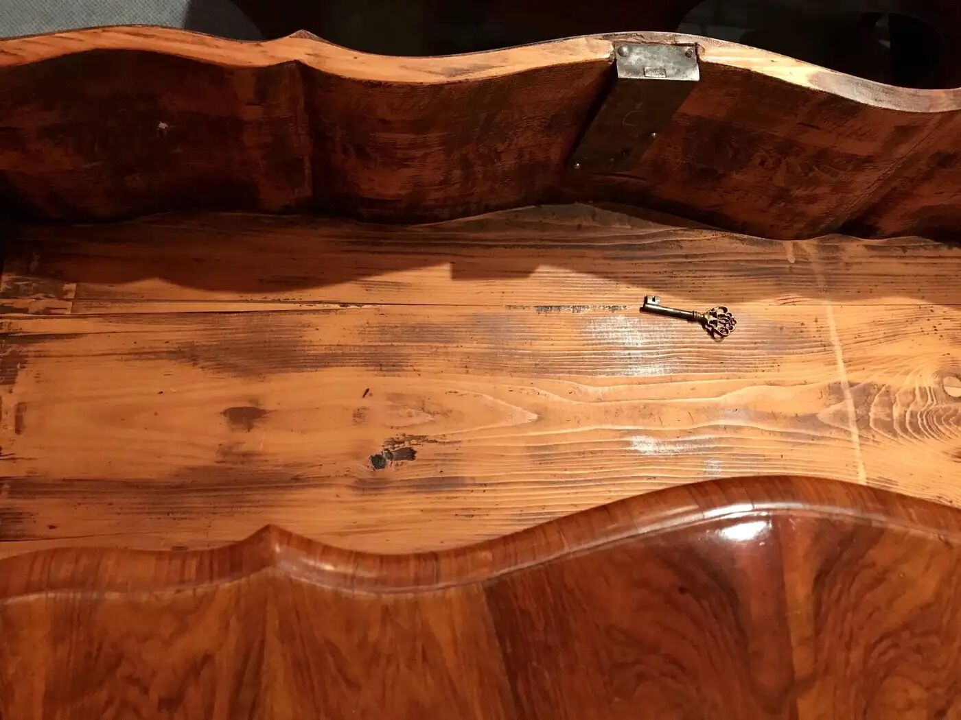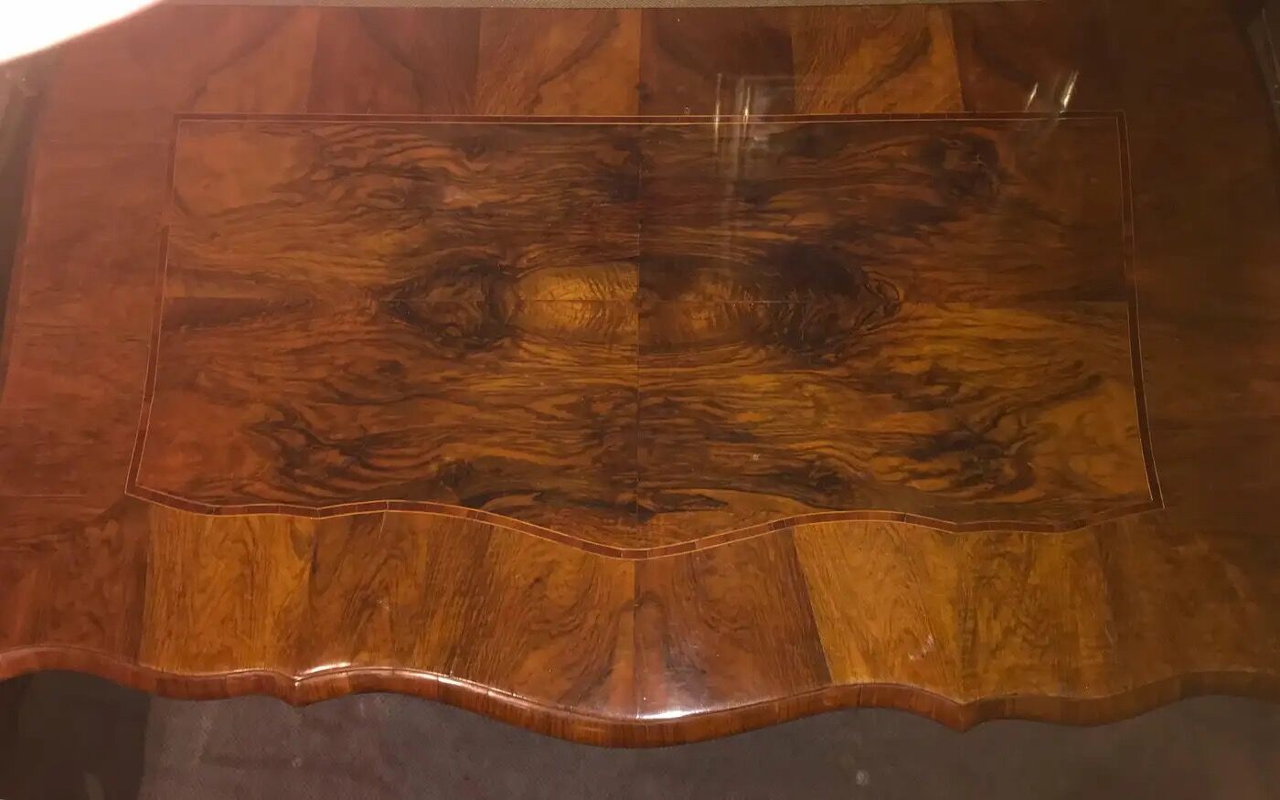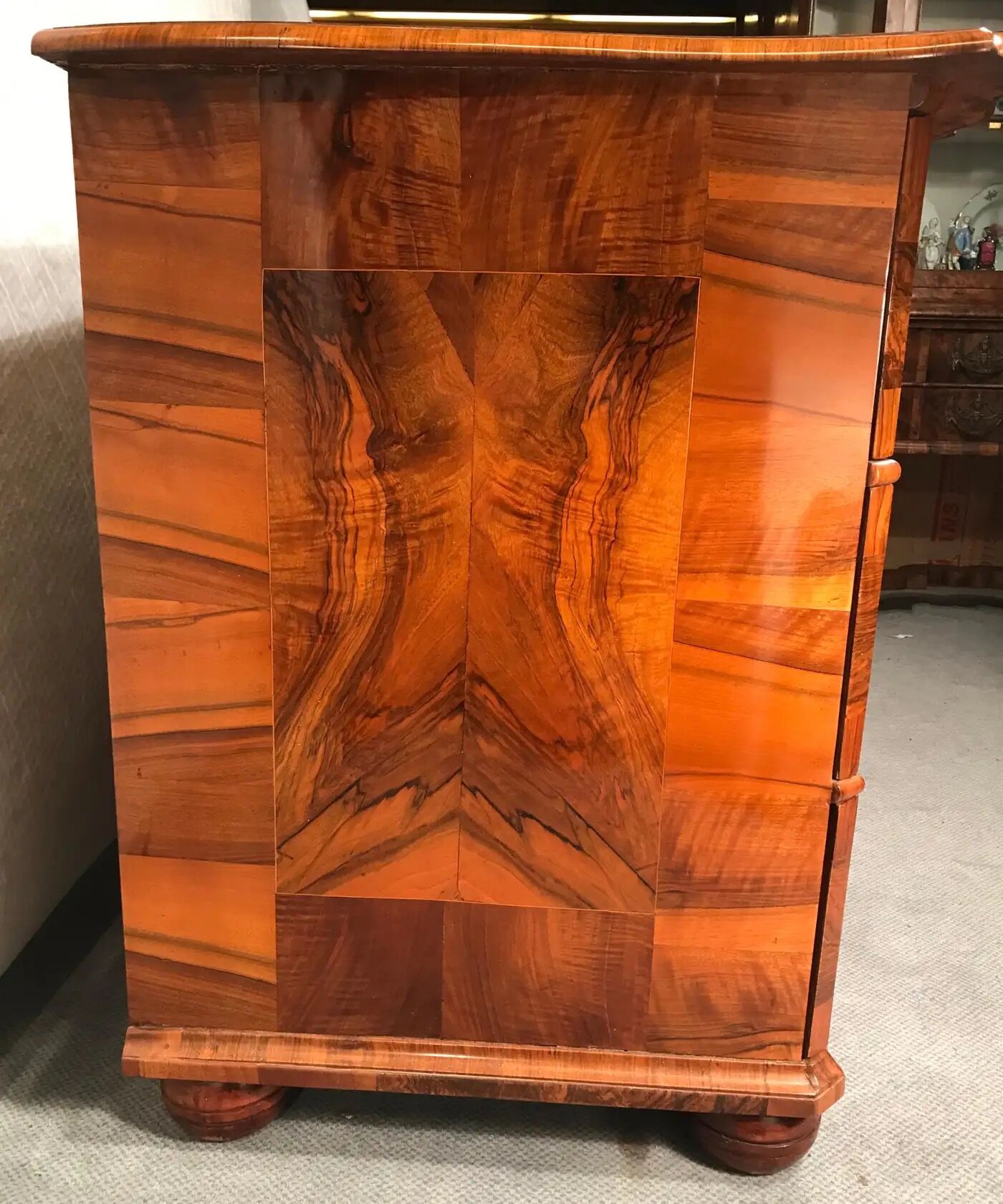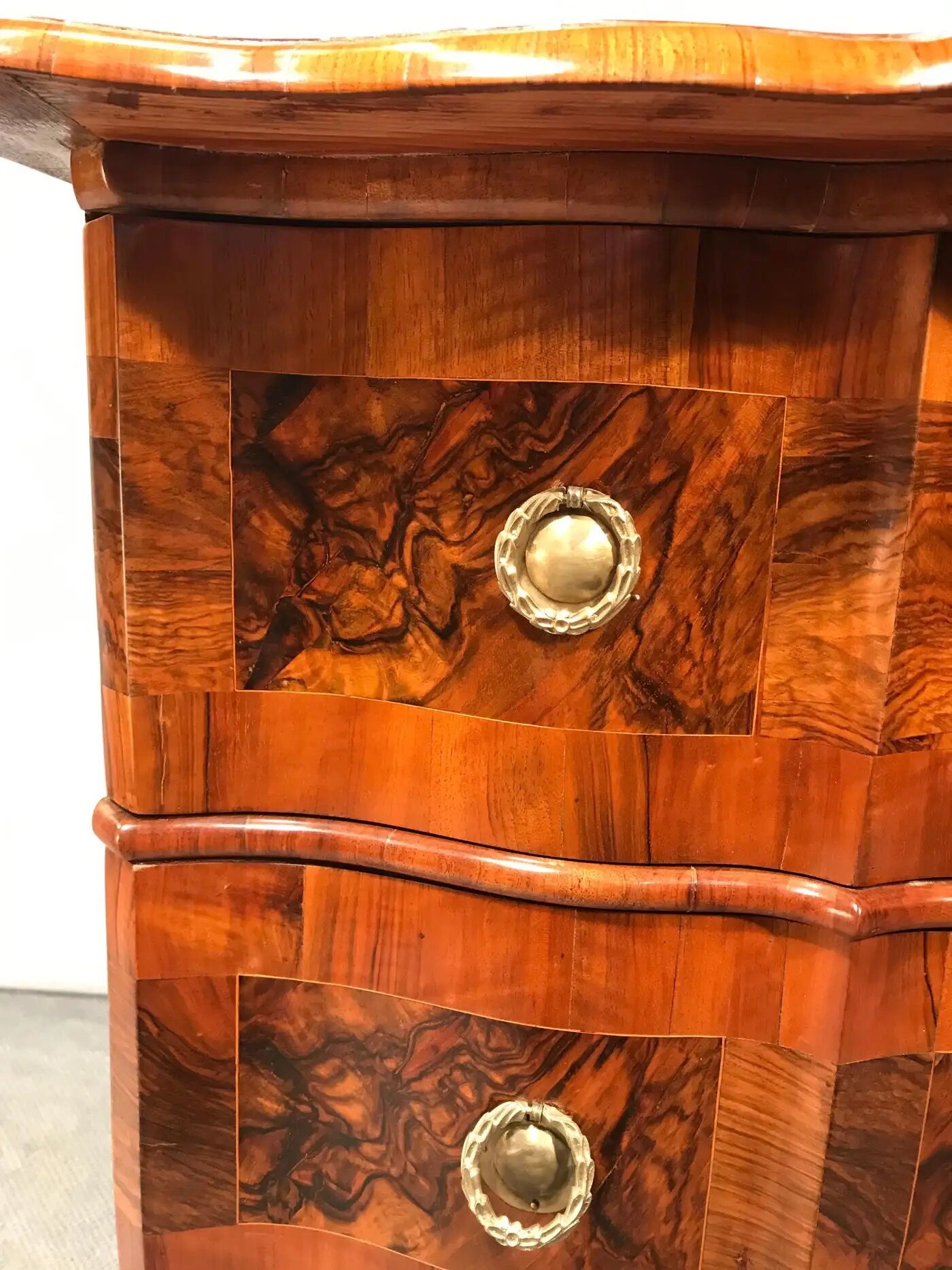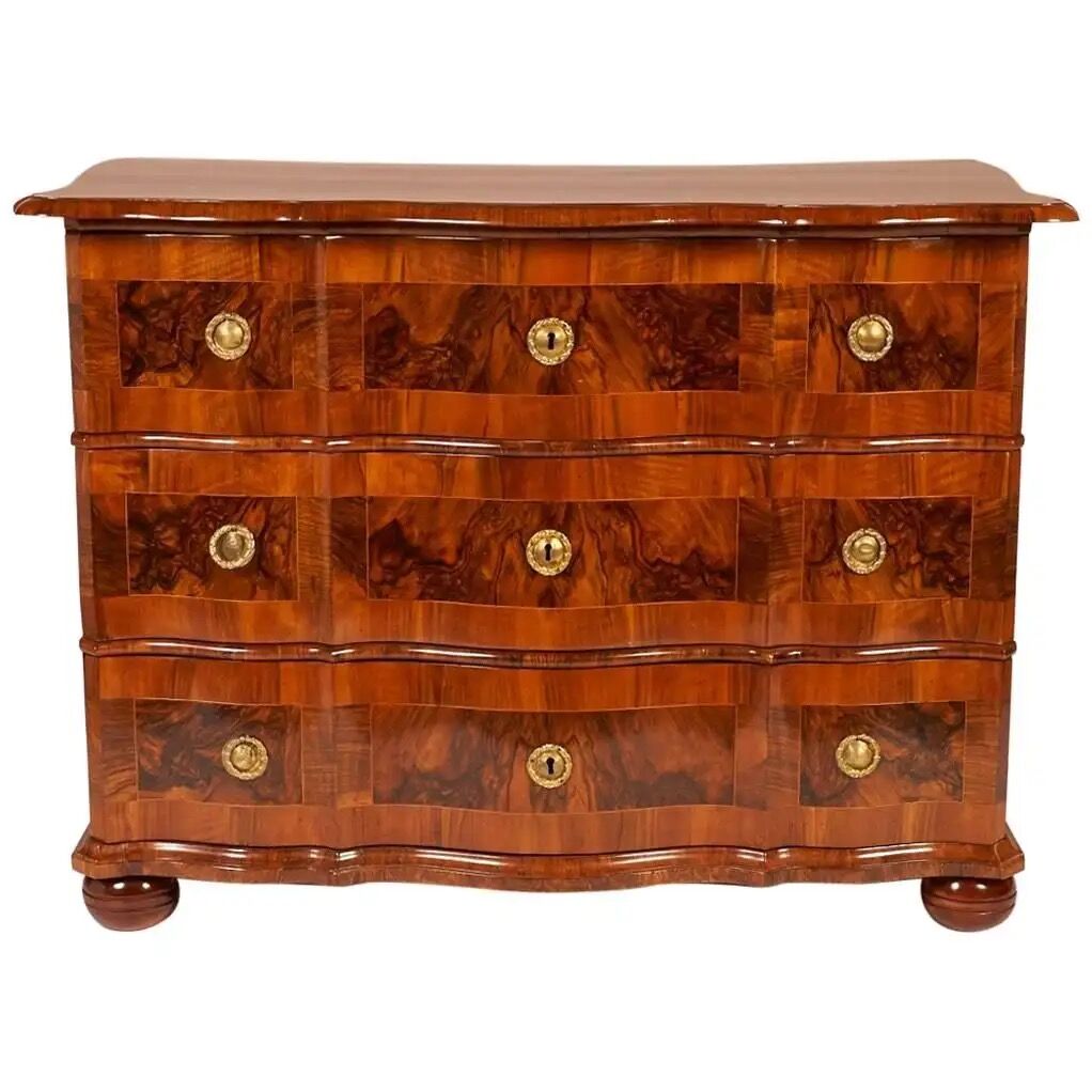18th century Baroque commode, probably Mainz (Germany), 1750. Body on flattened ball feet, serpentine front with three drawers, each of them with escutcheons and ring handles. Molded and overhanging top. Walnut veneer with plum inlays. The Baroque chest of drawers is in very good condition, it has been professionally refinished. It will be shipped from Germany, standard shipping costs to Boston are included. US customs tariffs are not included.