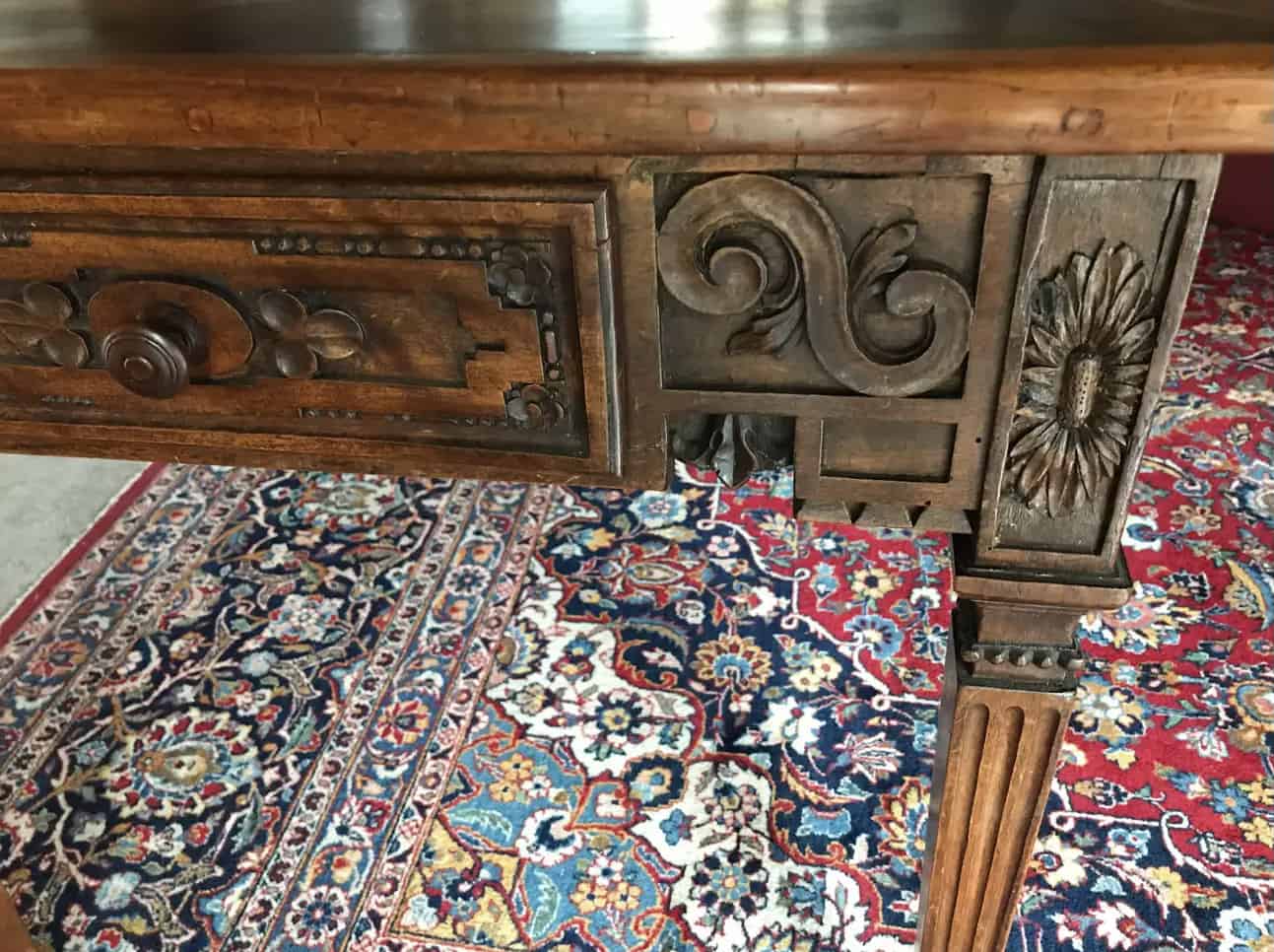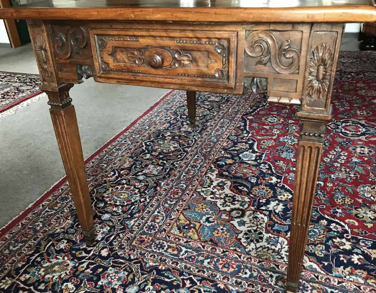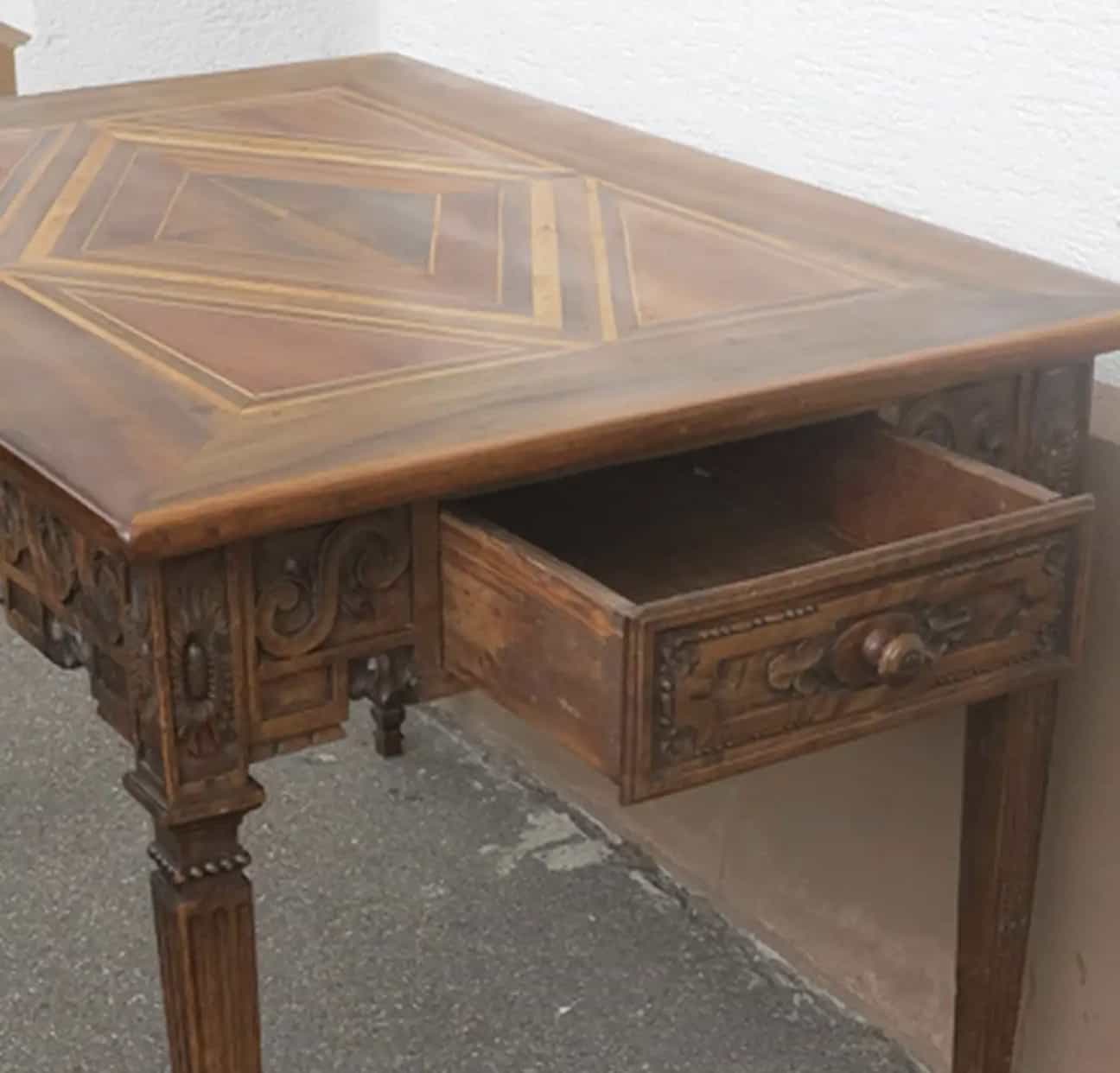 This unique 18th century farm table has a beautifully veneered top. The central diamond shaped walnut and elm wood inlay gives the top a very unique touch. Additionally, the exquisitely carved apron and legs bear witness of the high quality craftsmanship. Elegant with a rustic touch, this would be the perfect table for a dine in kitchen or it could embellish your rustic cabin.