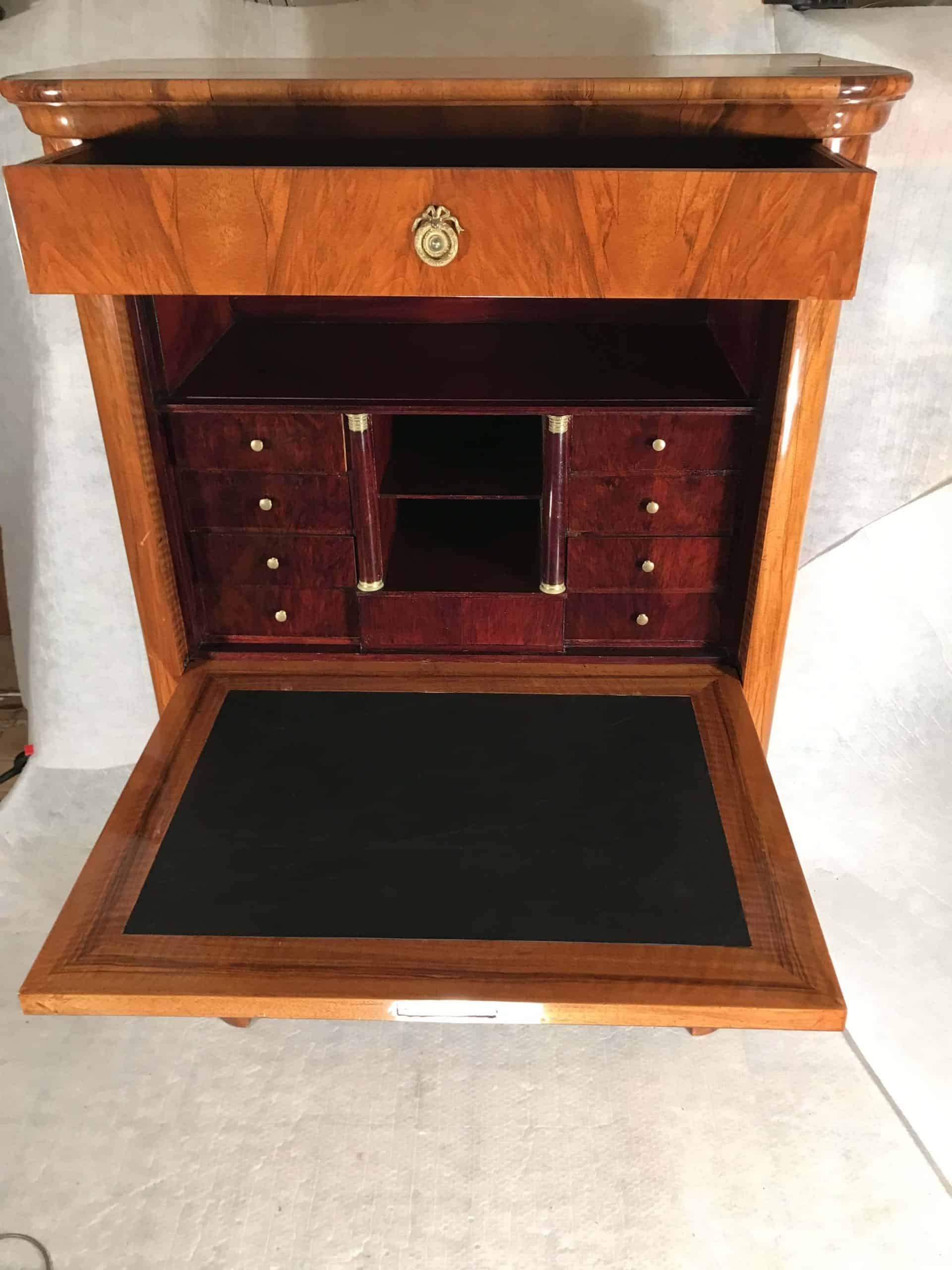 The cabinet maker used beautiful walnut veneer on the outside of the 19th century Biedermeier desk. The interior opens with a fall top to a central compartment and is embellished with mahogany veneer. Furthermore, two Doric columns with brass bases and capitals frame the central compartment, and eight drawers surround it.