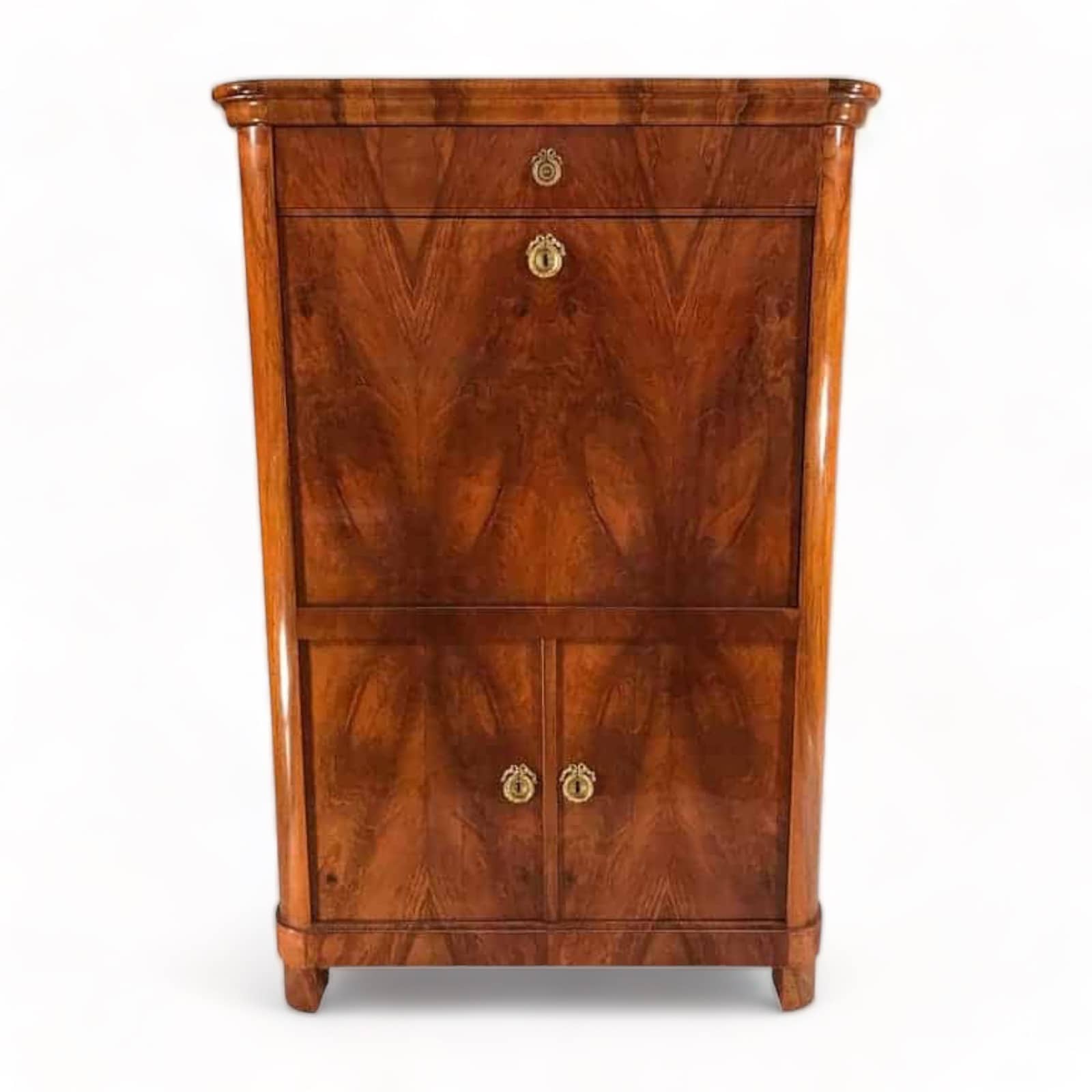 The secretaire offered here, is in very good condition. It has been refinished a couple of years ago. There is one shrinkage veneer crack on the outside of the writing flap.