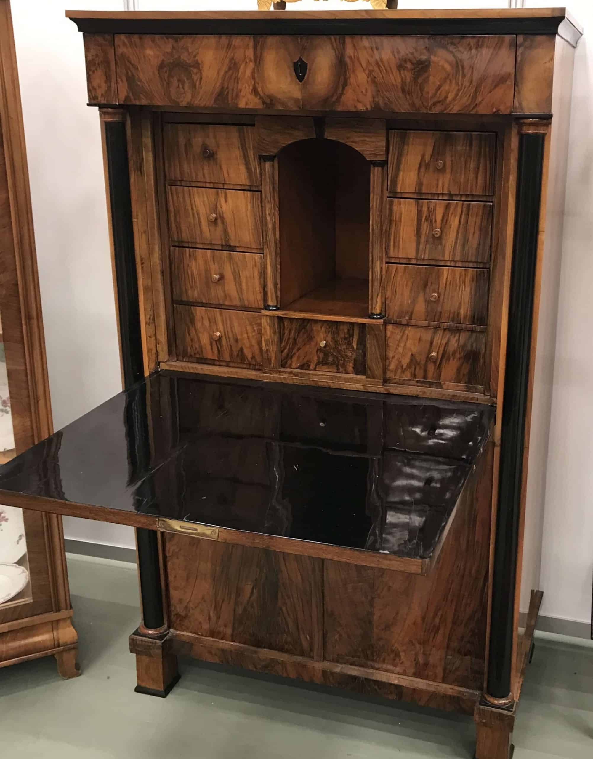 19th century Biedermeier Fall Top Desk, classic Biedermeier Design, made in Austria around 1820. Walnut veneer with ebonized details and writing top. The secretaire will be shipped from Germany, shipping costs to Boston are included.