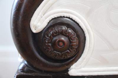 Whether placed in a study, salon, or living room, this antique armchair blends timeless sophistication with comfort. A perfect example of French Empire furniture, it offers both decorative value and everyday usability. In good condition with new upholstery, one minor stain on the fabric.