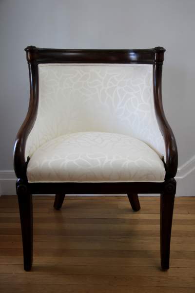 This rare and elegant Empire tub chair from France, dating to around 1820, is crafted in rich mahogany and newly upholstered in refined cream-colored fabric. The finely carved details showcase the artistry of early 19th-century French Empire furniture, making it a distinctive accent chair for both classic and contemporary interiors.