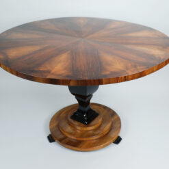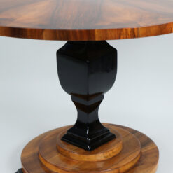 This antique walnut table represents the pinnacle of Viennese Biedermeier design. The round, book-matched walnut-veneered top glows with a deep amber tone and a rich, natural patina developed over two centuries. Finished in traditional French polish, the surface displays a soft, luminous sheen that enhances the beauty of the wood grain. The top rests elegantly on an ebonized vase-shaped pedestal, anchored by a distinctive three-disc walnut-veneered base — a perfect balance of proportion and refinement.