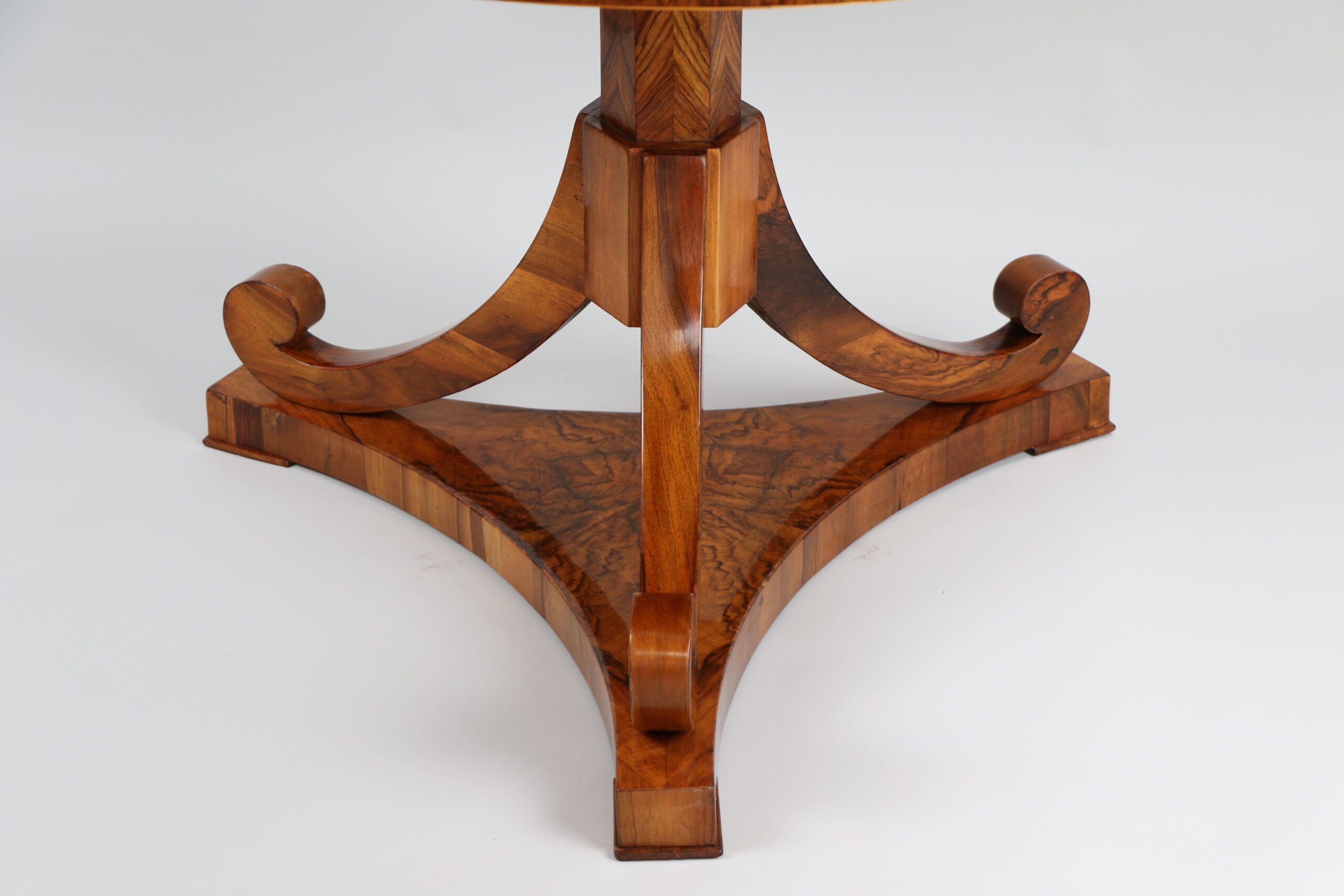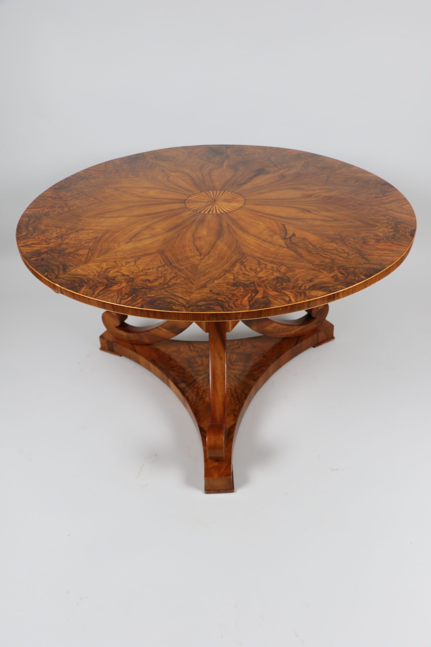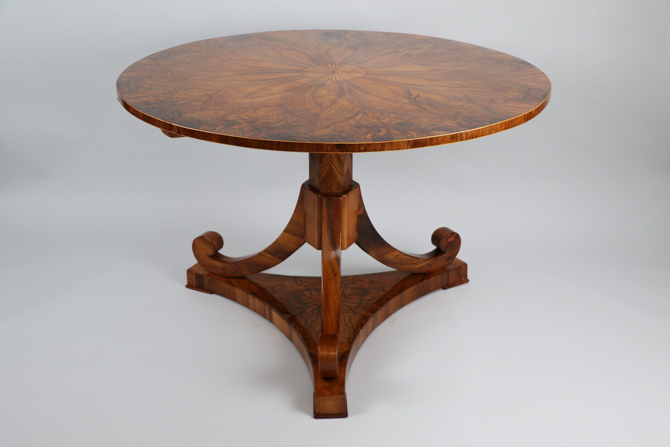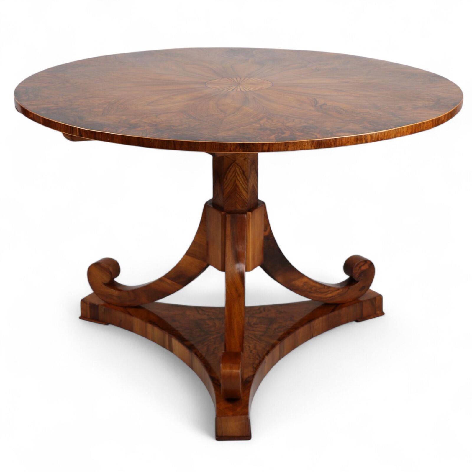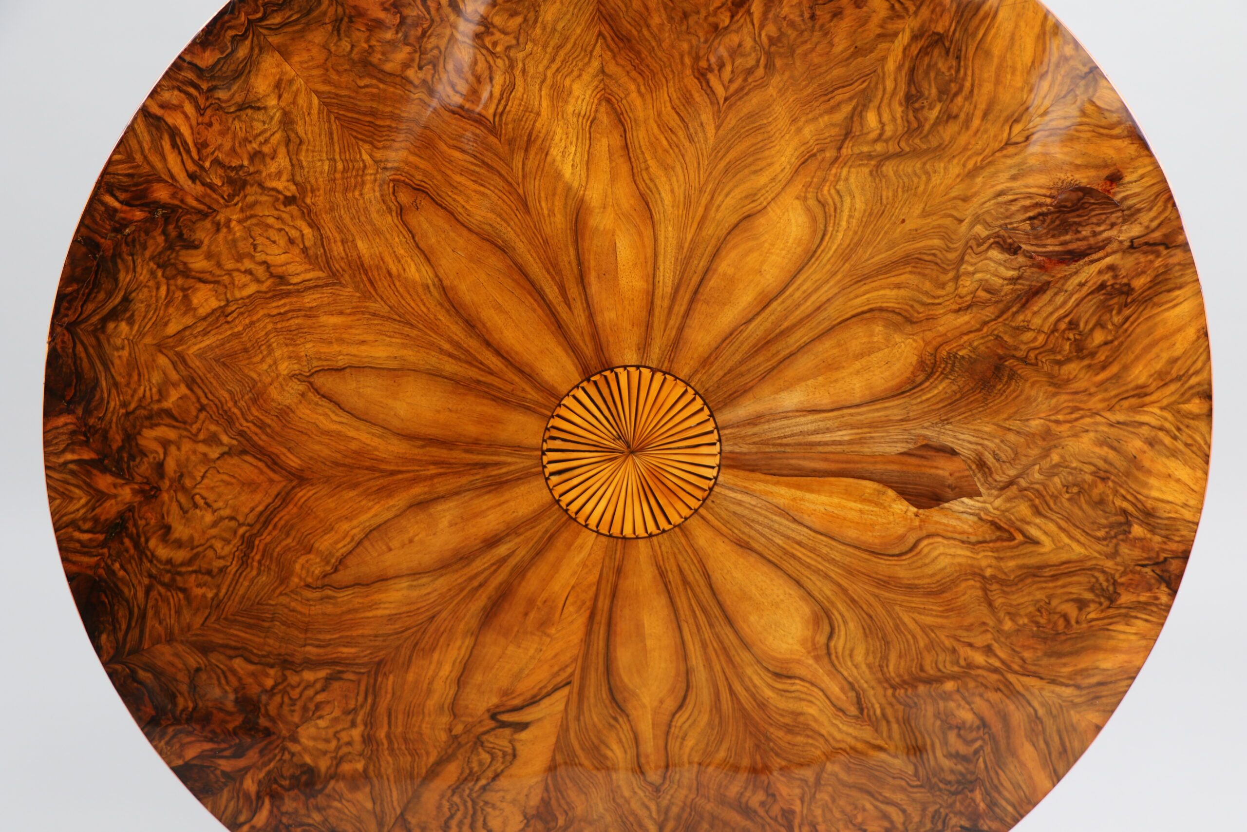The walnut veneer displays a beautifully book-matched grain with a warm amber tone, enriched by a natural 200-year-old patina. At the center of the tabletop, a finely executed marquetry rosette adds a sophisticated focal point, crafted with exceptional precision by the master artisans of the Biedermeier era.