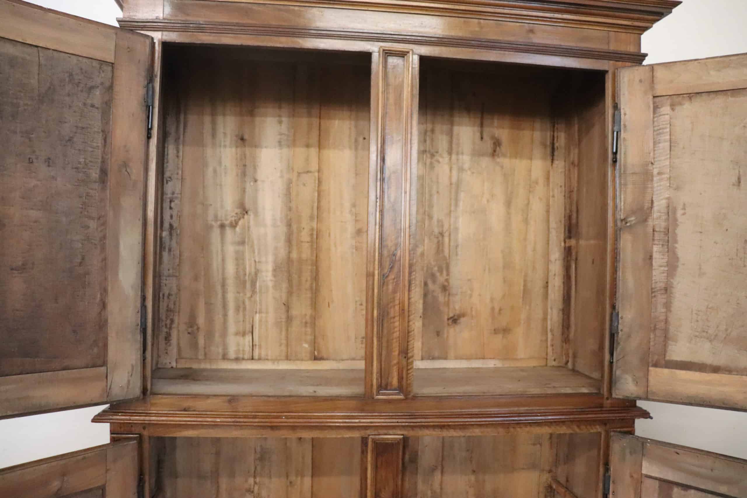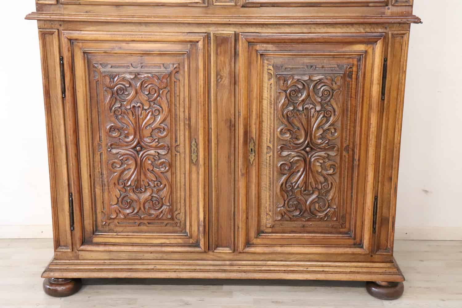 A rare 19th century Italian cabinet made from solid walnut. This beautiful antique is characterized by hand carved wood decorations on the front doors. The fine walnut wood features a charming vintage patina. The cabinet features a large interior equipped with shelves that will be custom made according to the buyer’s need after purchase. This majestic and elegant piece will surely be admired as a work of art in your home.