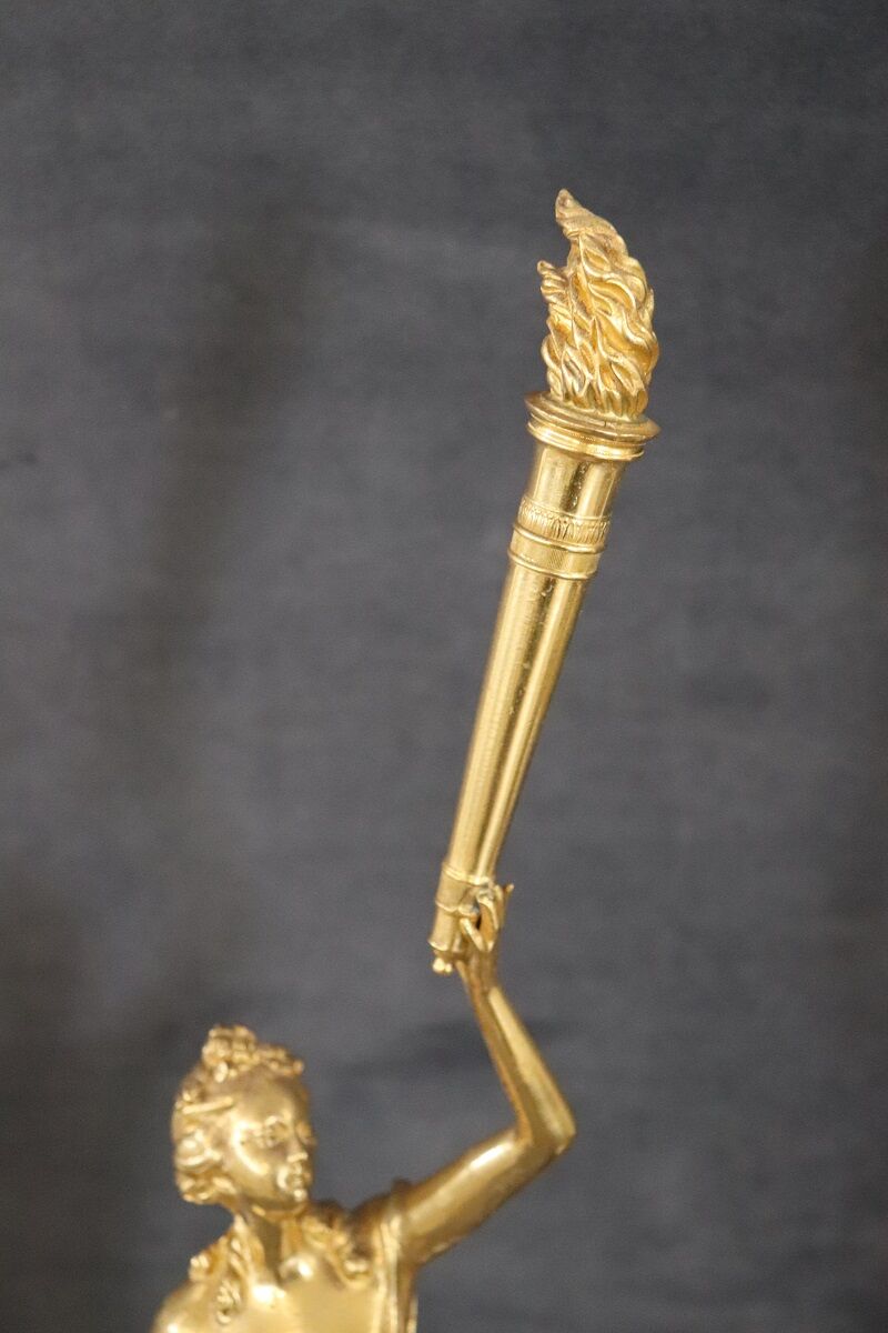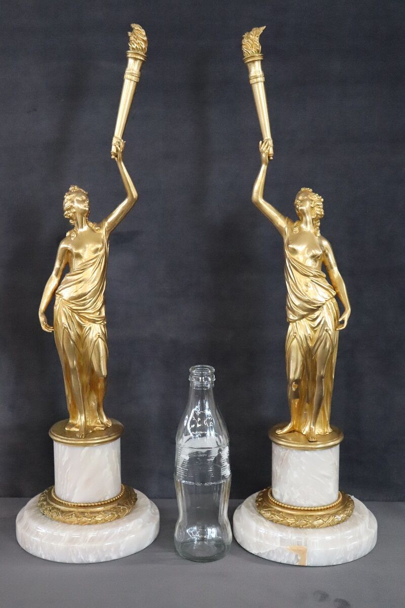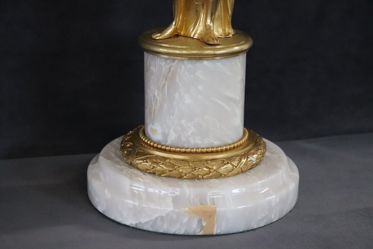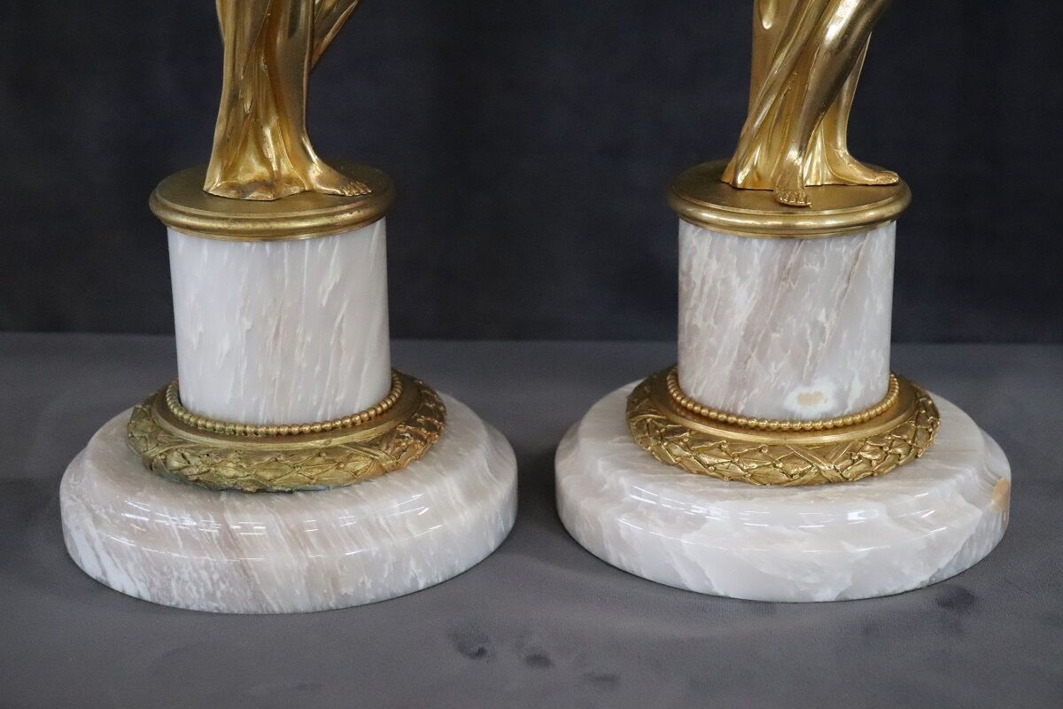 This exquisite pair of 20th-century Italian gilt bronze sculptures showcases two female figures, embodying allegories of freedom. Each sculpture is mounted on a circular alabaster base, adding a touch of elegance and stability. The classic taste and refined artistry of these pieces highlight their high artistic quality. Perfect for enhancing any interior space, these sculptures offer a timeless appeal and serve as a testament to exceptional craftsmanship. Their allegorical significance and intricate detailing make them a standout addition to any collection.