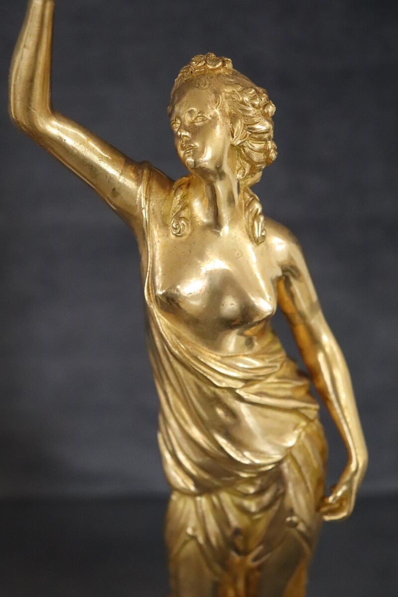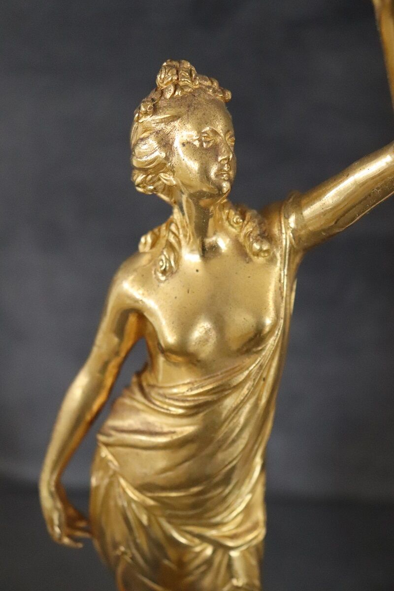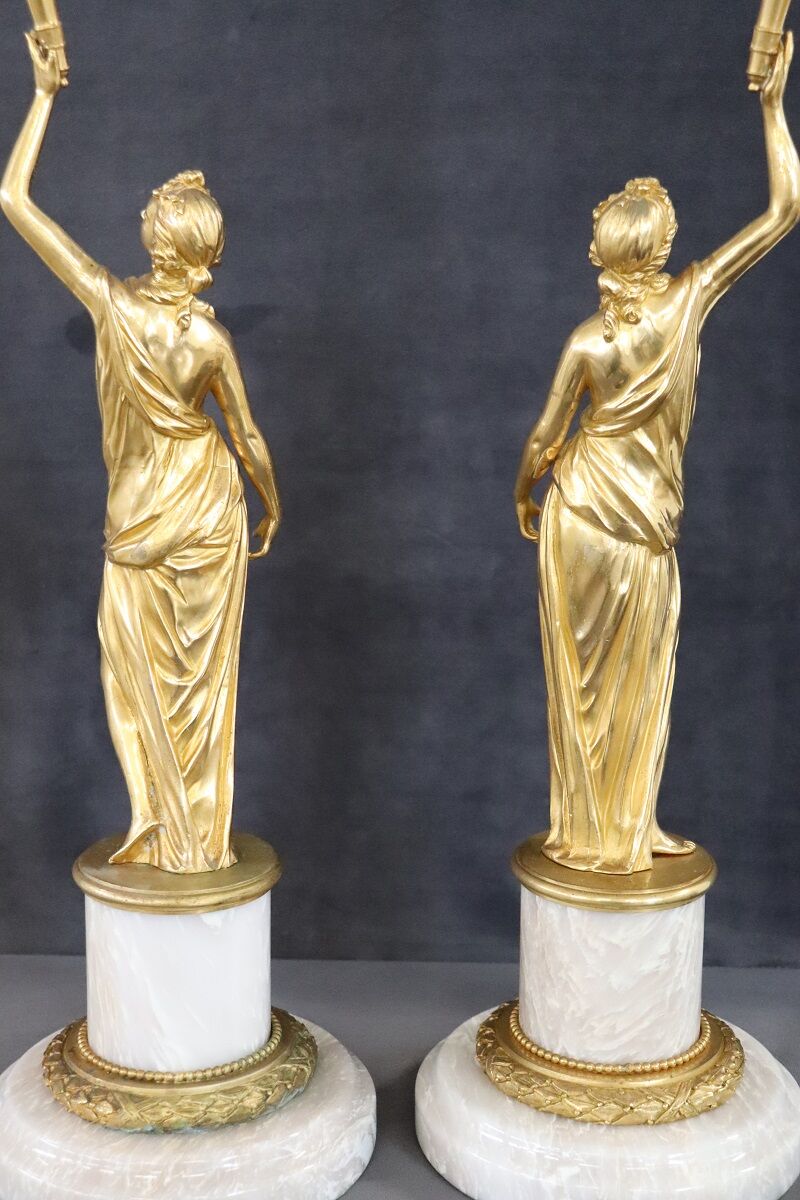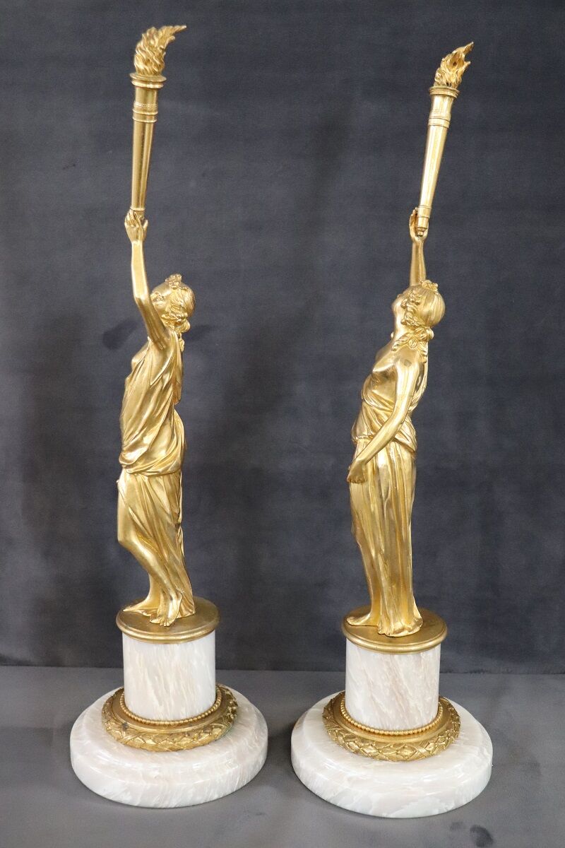 This exquisite pair of 20th-century Italian gilt bronze sculptures showcases two female figures, embodying allegories of freedom. Each sculpture is mounted on a circular alabaster base, adding a touch of elegance and stability. The classic taste and refined artistry of these pieces highlight their high artistic quality. Perfect for enhancing any interior space, these sculptures offer a timeless appeal and serve as a testament to exceptional craftsmanship. Their allegorical significance and intricate detailing make them a standout addition to any collection.