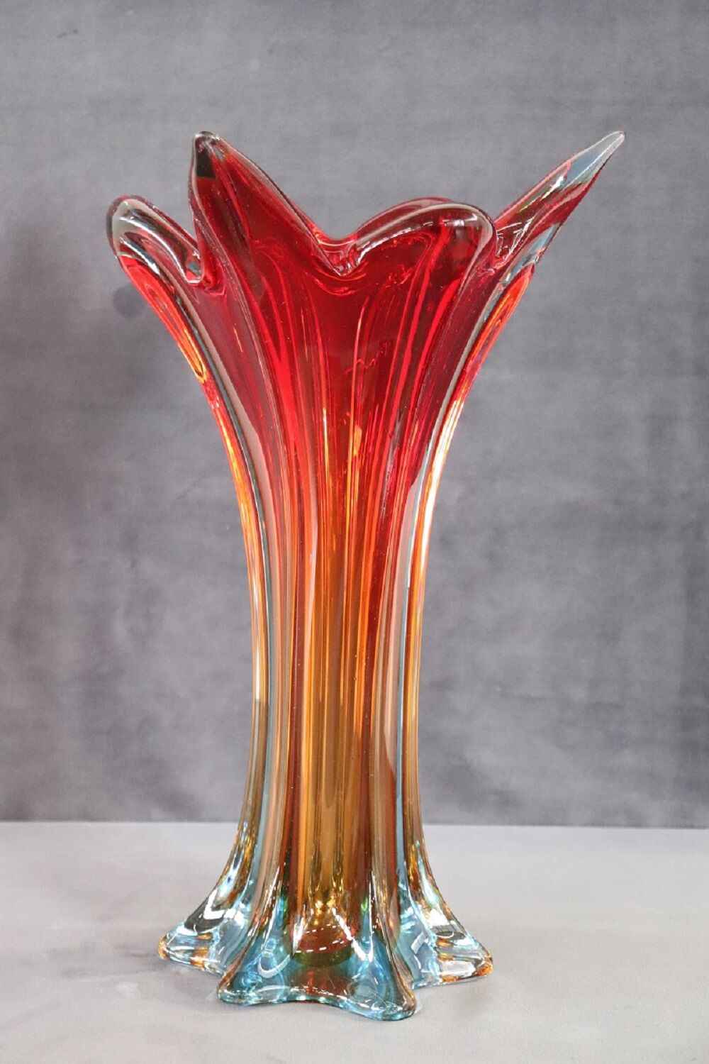 Refined Italian tall vase in red Murano art glass, 1960s. This vase is characterized by a particular design shape. The vase is of high artistic quality made with the submerged glass technique. Thanks to this technique, the vase has a color that starts from orange at the bottom and fades to bright red at the top. The beautiful color combination used creates a flame effect. The outside is ribbed. Its particular shape is unique, slender upwards where it opens like a petal. Vase of great refinement you will be truly fascinated when you see it.