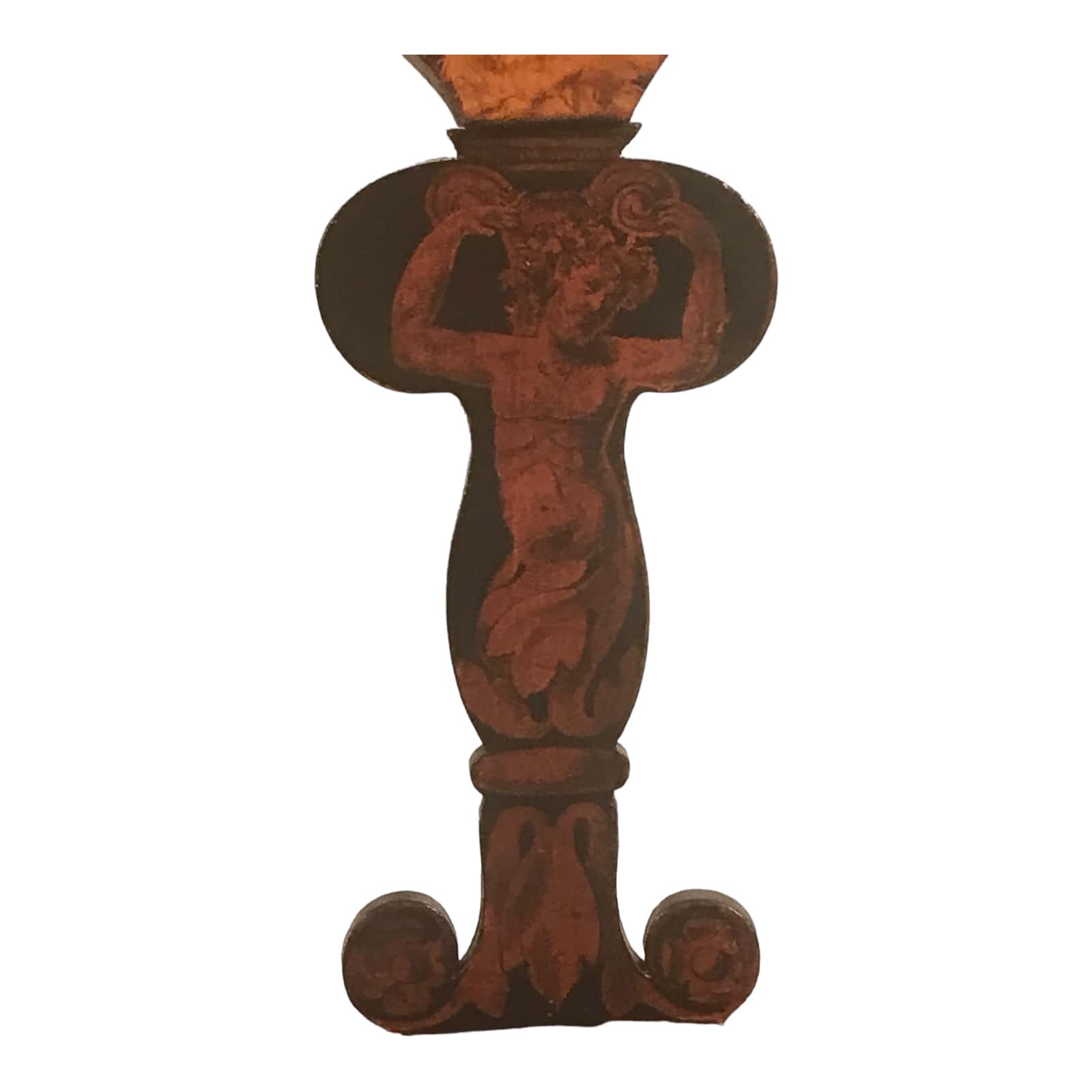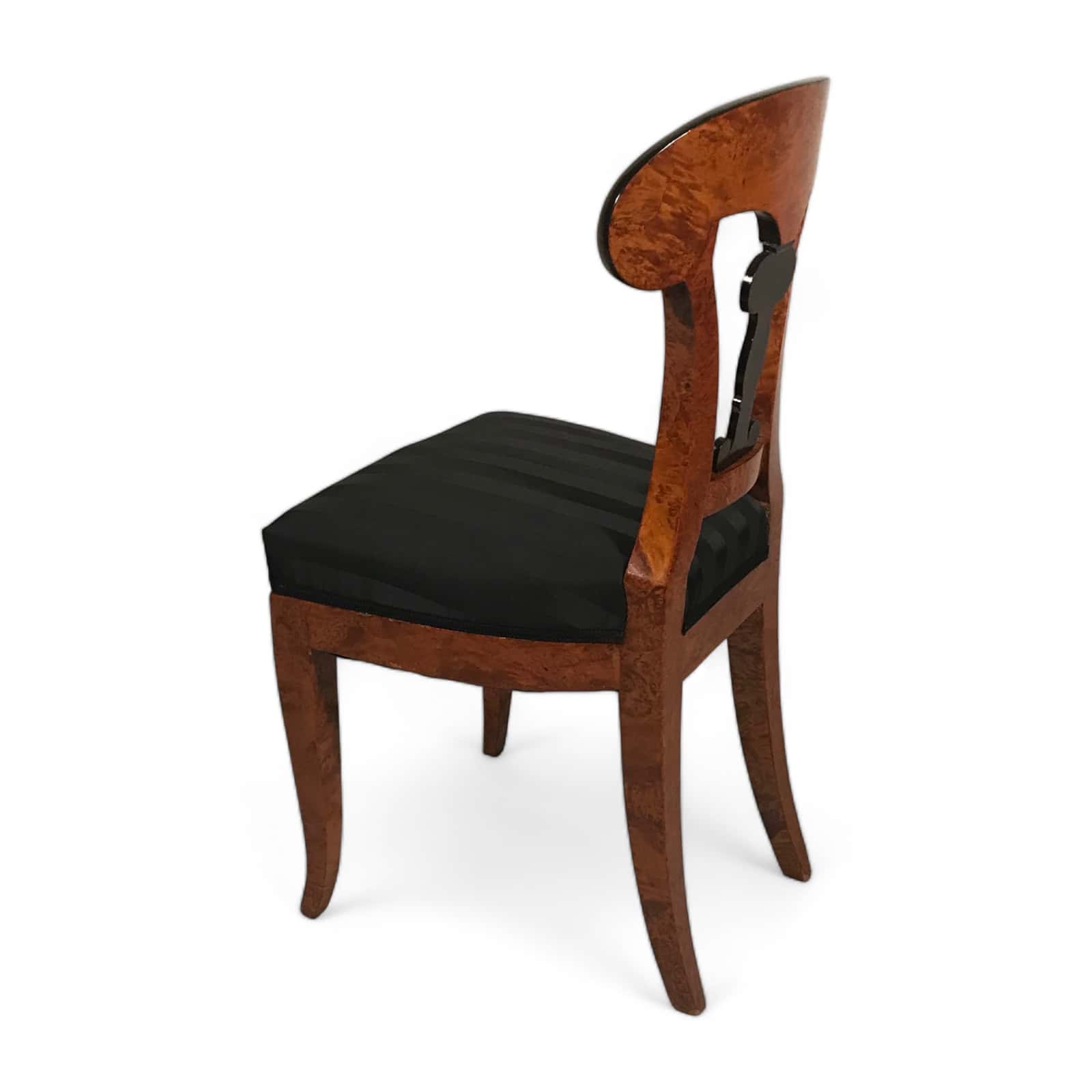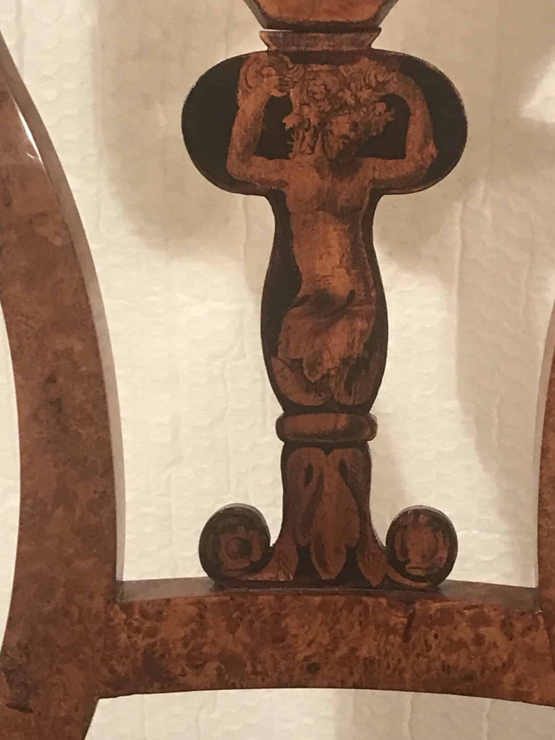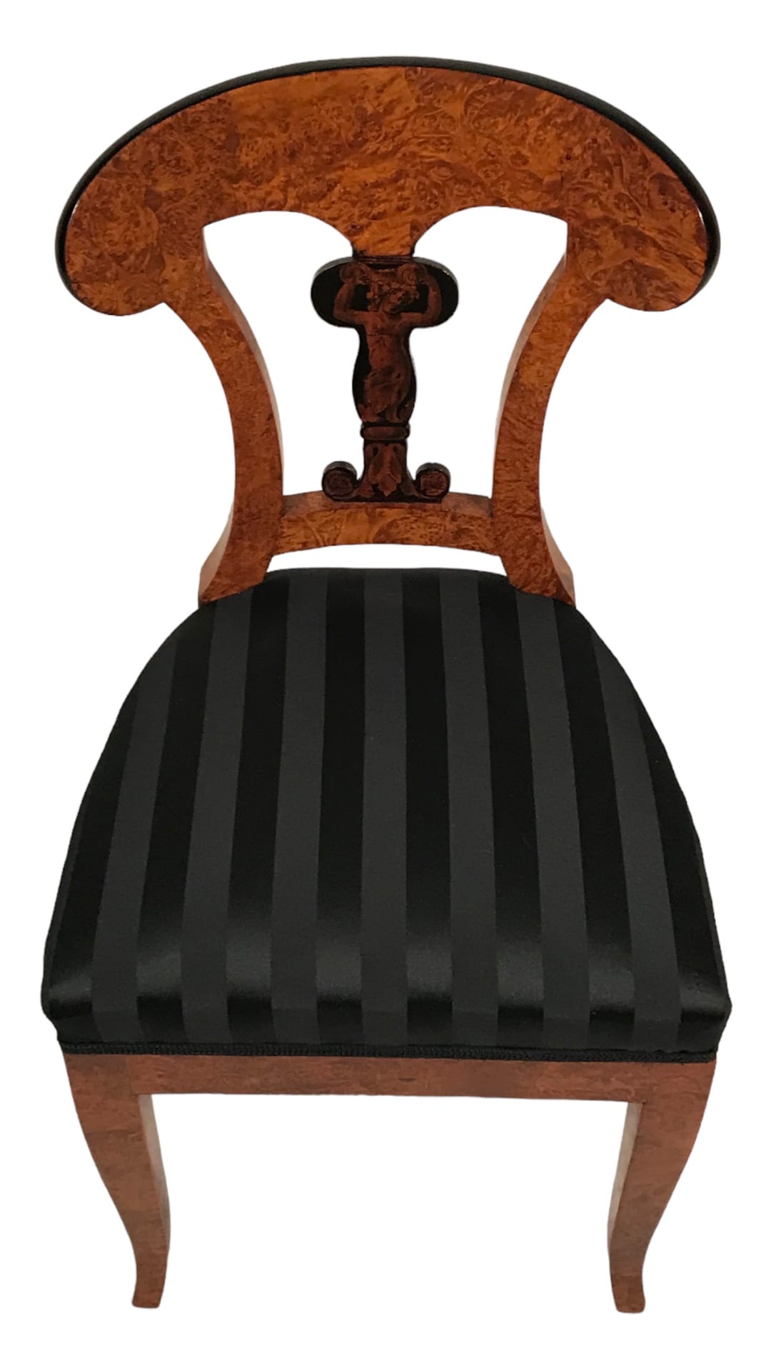 Discover the timeless elegance of this set of four Biedermeier Chairs, originating from Munich in the 1820s. Characterized by their classic Biedermeier Design, these chairs boast a distinctive shovel back and are adorned with stunning burl wood veneer. What truly sets them apart, however, are the original hand-painted caryatids in Schwarzlot nestled in the center of their backs.