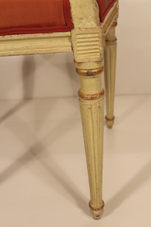 A set of four Gustavian chairs, Sweden around 1800 The chairs have a beautifully had carved back design with a cream color finish and gilded details. The chairs have a lot of vintage charm. The seats are covered with a shimmering red silk fabric.