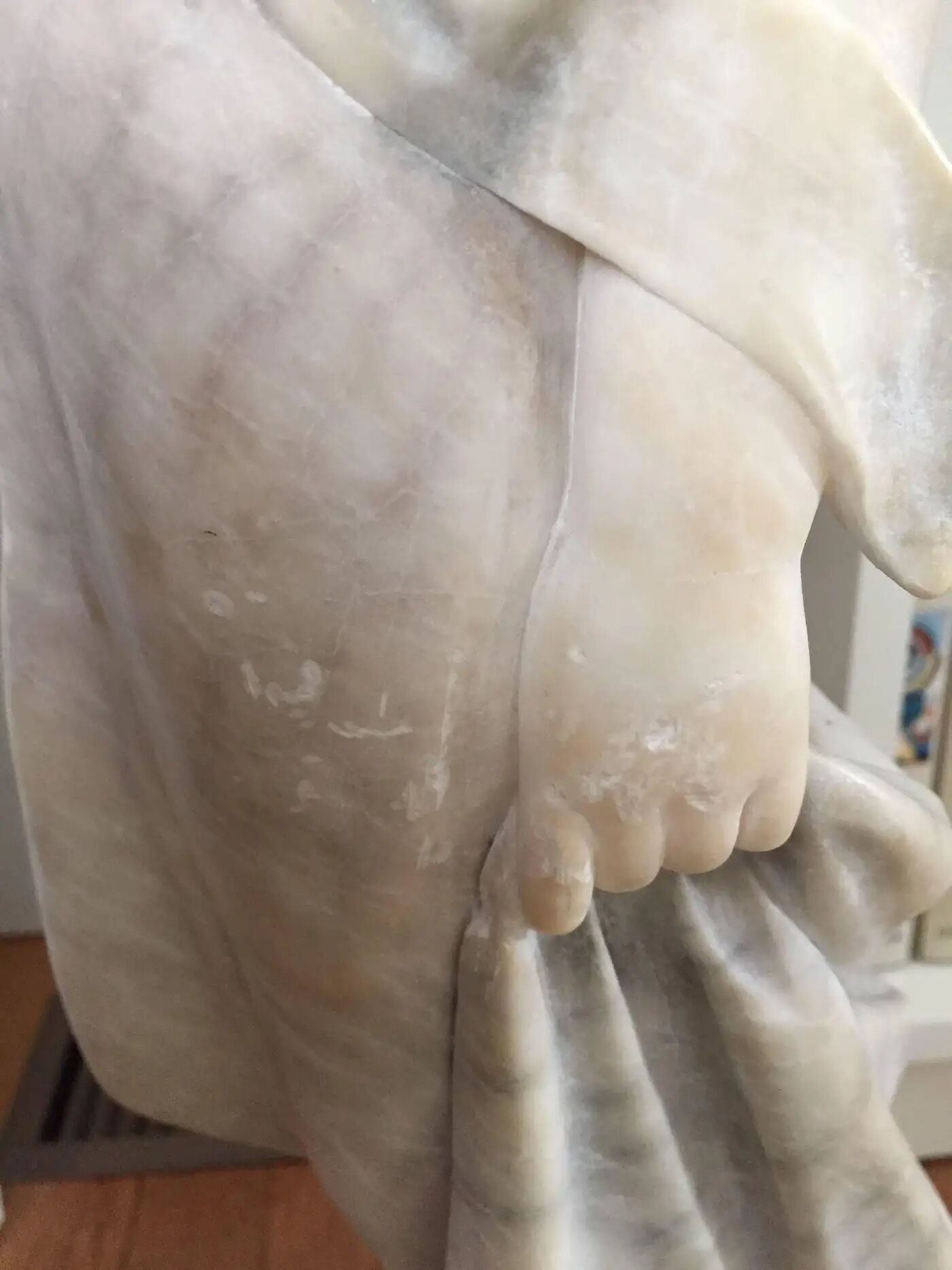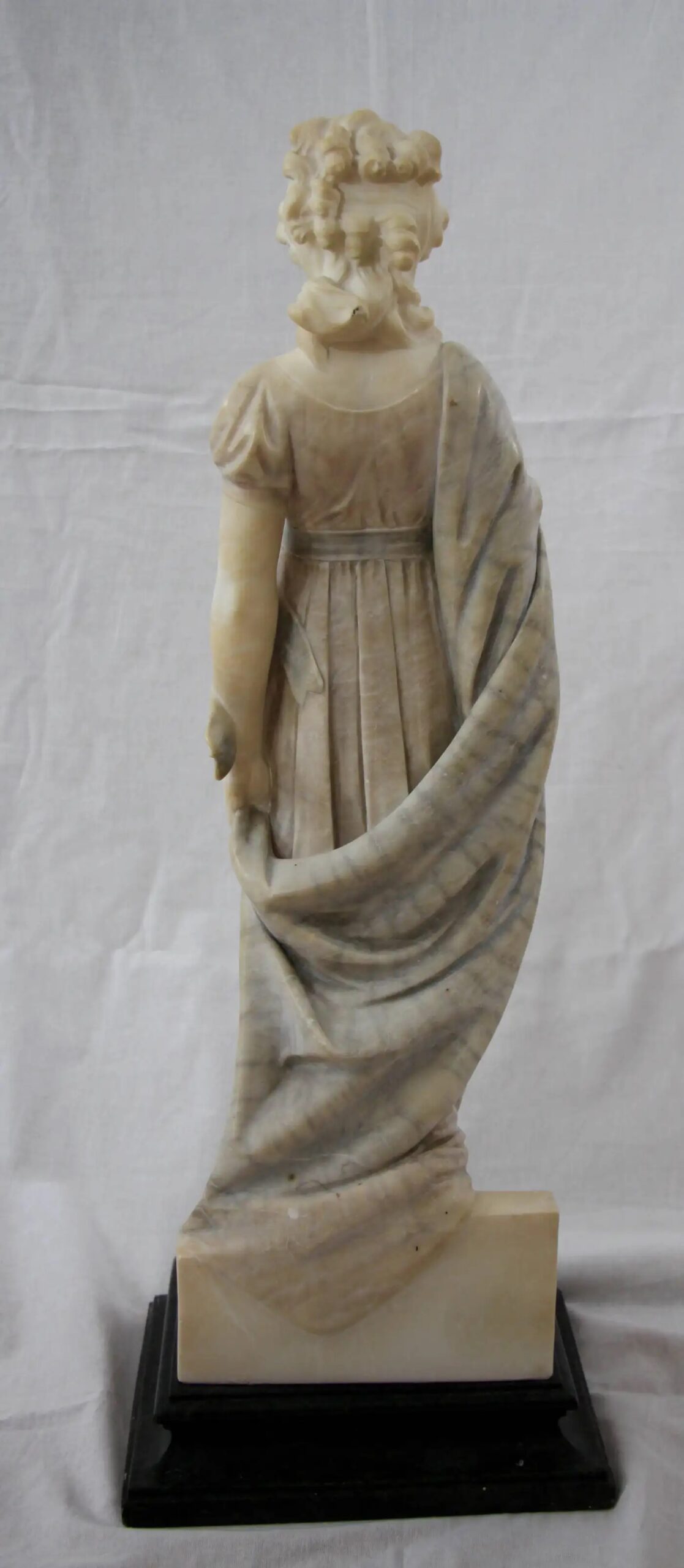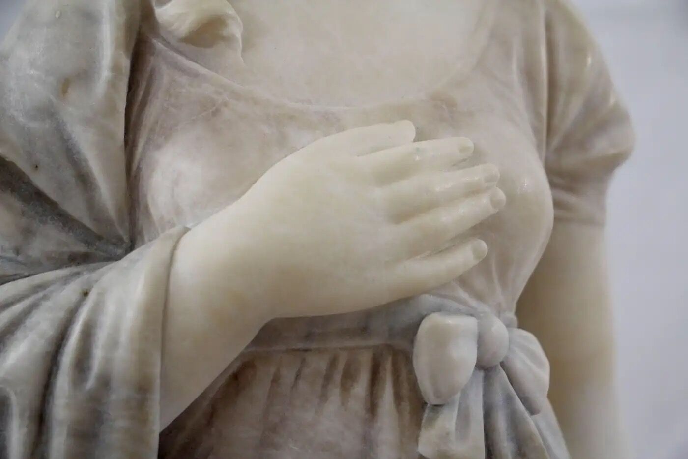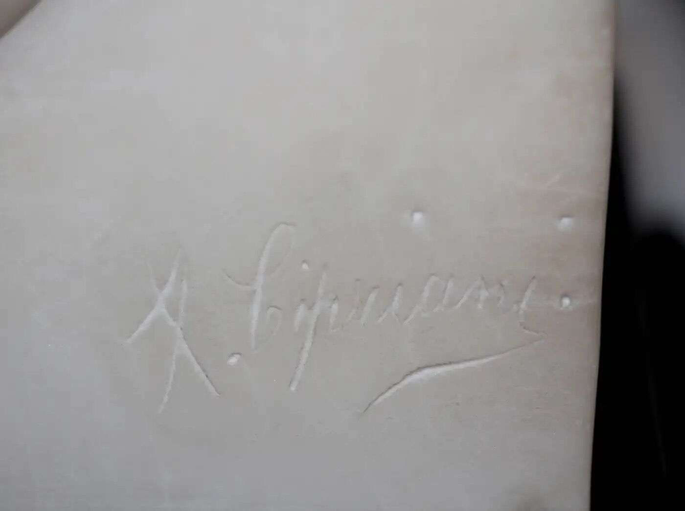 Notable works by Adolfo Cipriani include “Bacchante,” a marble sculpture representing a follower of Bacchus, the Roman god of wine, and “La Perla,” a delicate representation of a young woman holding a pearl. His works are characterized by their lifelike quality and the smooth, polished finish of the marble or alabaster.