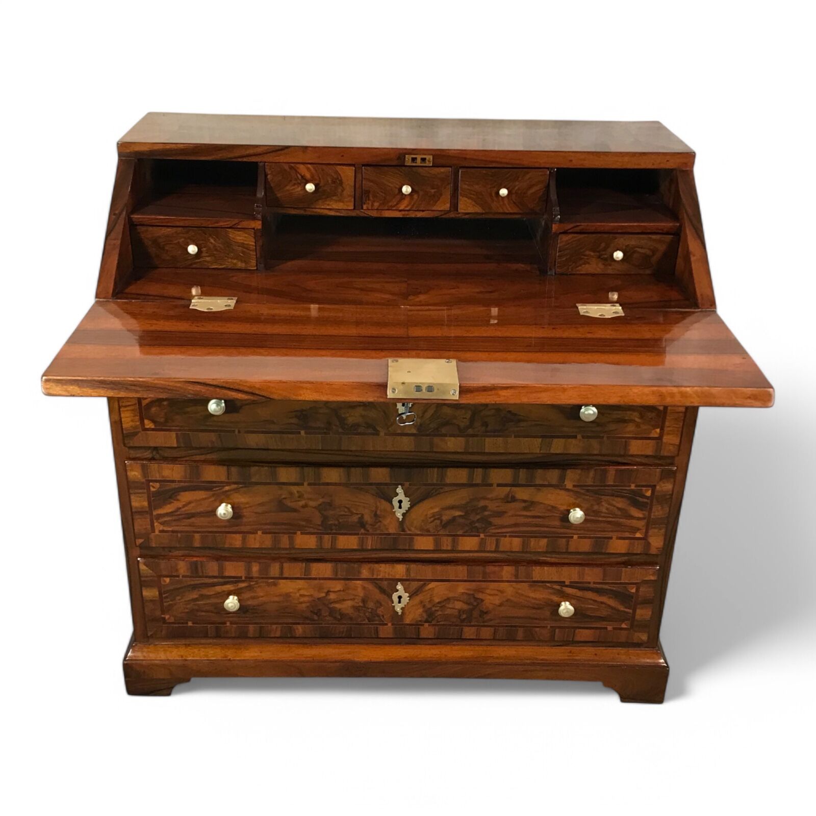 Original Antique Baroque Secretary Desk, Germany, 1750 This exquisite antique secretary desk from Germany (circa 1750) is a rare find for antique furniture collectors. Featuring a stunning bookmatched walnut veneer, this elegant 18th-century bureau showcases the rich craftsmanship of the Baroque period. The desk offers three spacious drawers, a writing flap, and an interior with five small drawers and open compartments, providing both functionality and timeless style. Expertly restored and finished with a hand-applied shellac polish, preserving its historical charm while ensuring lasting durability.