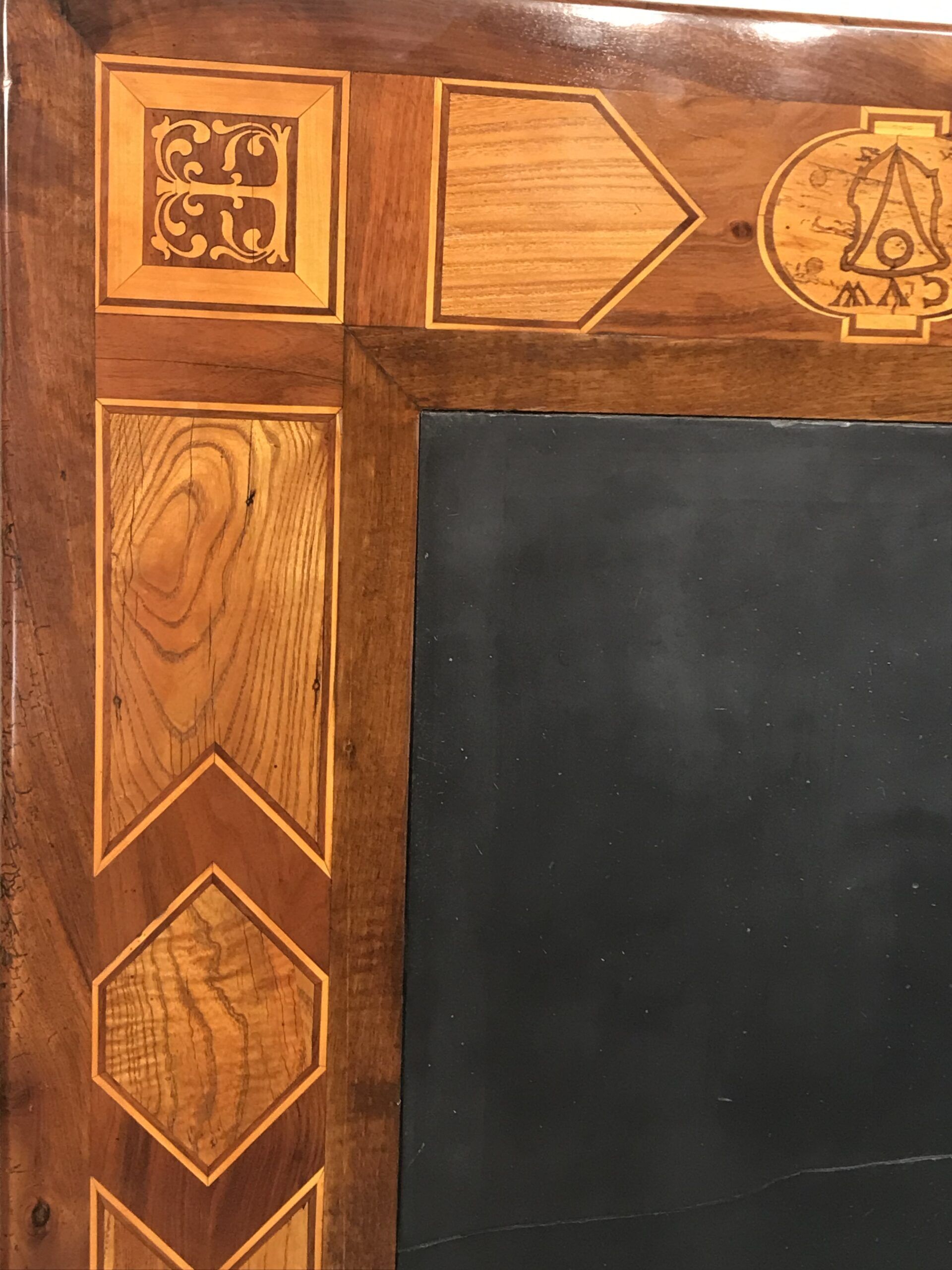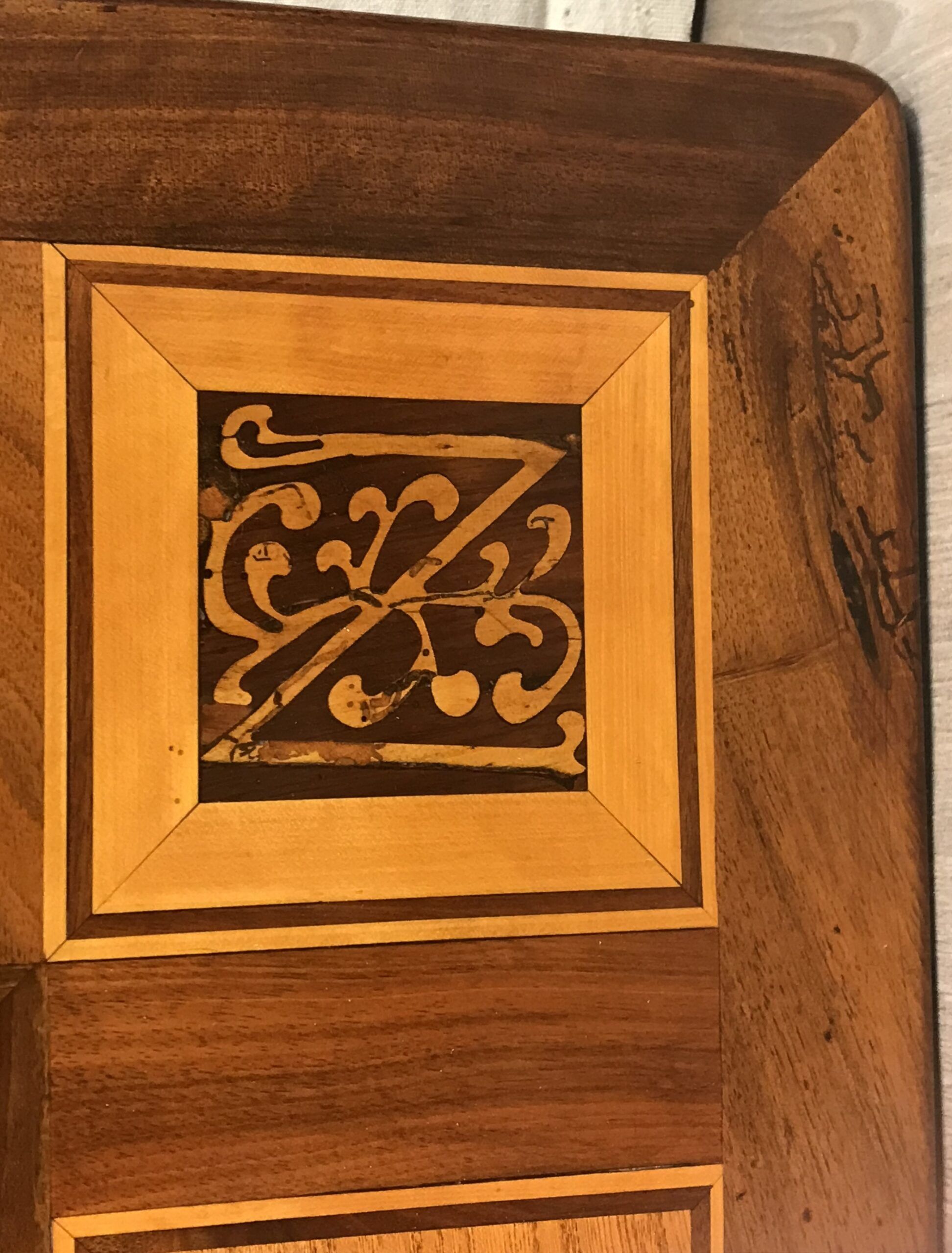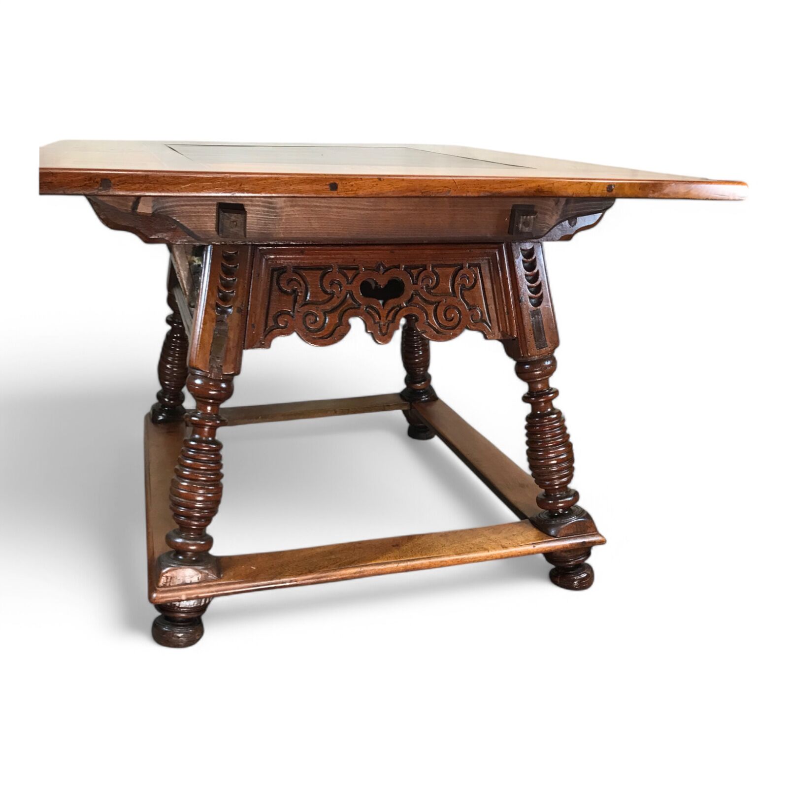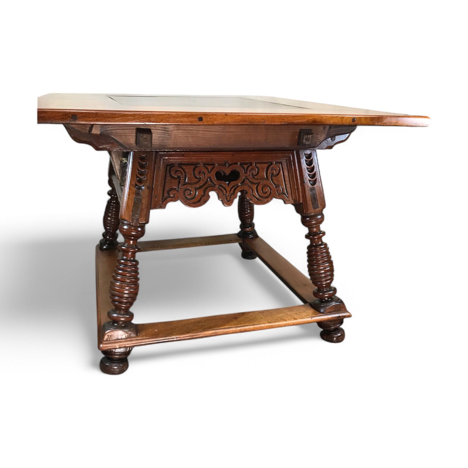 This Swiss 18th-century antique farmhouse table combines walnut, maple, and elm woods. The top features a stunning inlay design with a coat of arms and monograms, adding historical charm and refining the table’s character. A central slate insert, common in Swiss rustic tables of the 17th and 18th centuries, serves both as a practical surface for hot pots and as a unique design element. A single drawer offers convenient storage. Four lathed legsprovide sturdy support, while the apron showcases detailed carvings.