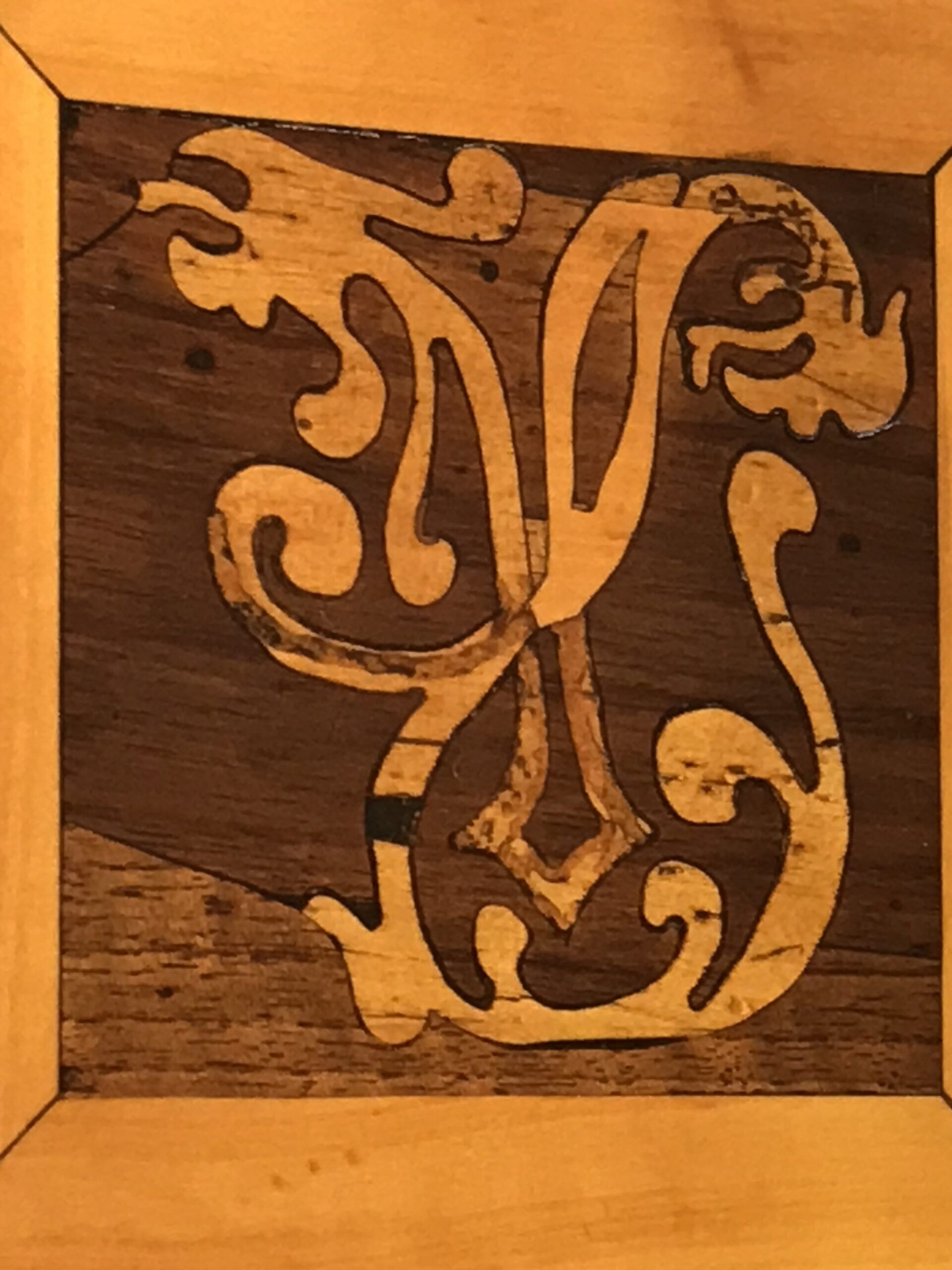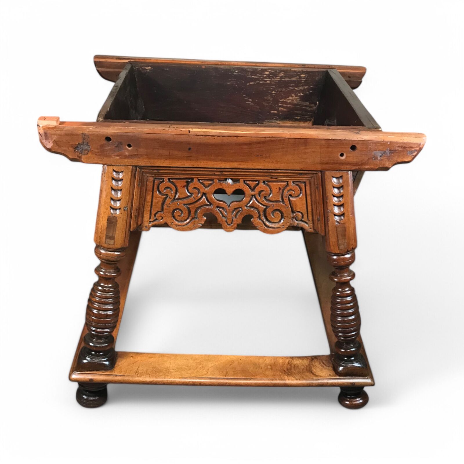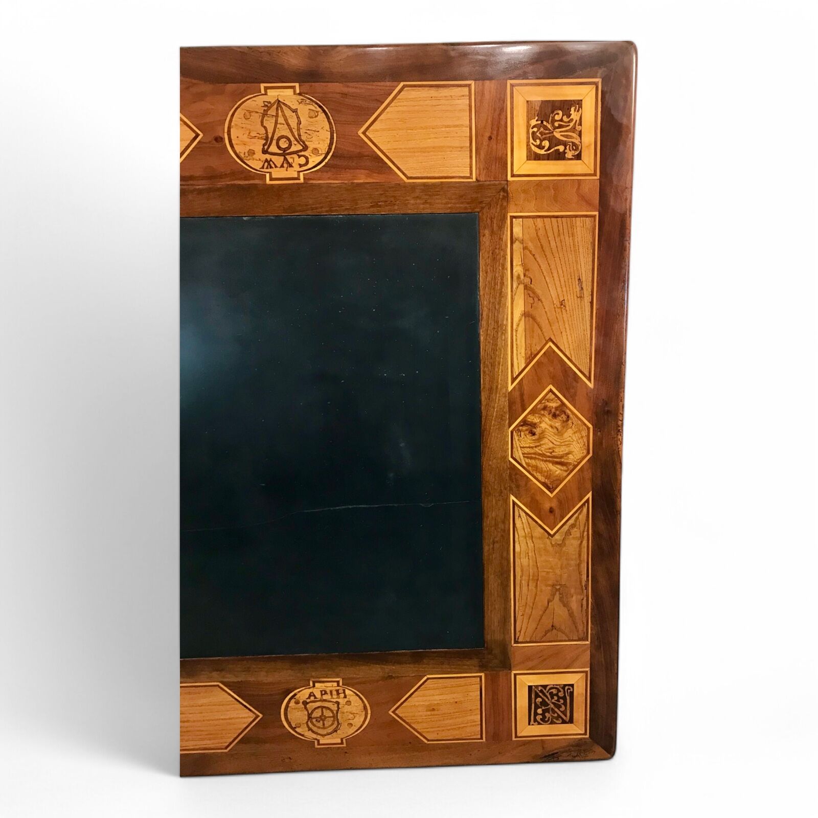 This Swiss 18th-century antique farmhouse table combines walnut, maple, and elm woods. The top features a stunning inlay design with a coat of arms and monograms, adding historical charm and refining the table’s character. A central slate insert, common in Swiss rustic tables of the 17th and 18th centuries, serves both as a practical surface for hot pots and as a unique design element. A single drawer offers convenient storage. Four lathed legsprovide sturdy support, while the apron showcases detailed carvings.