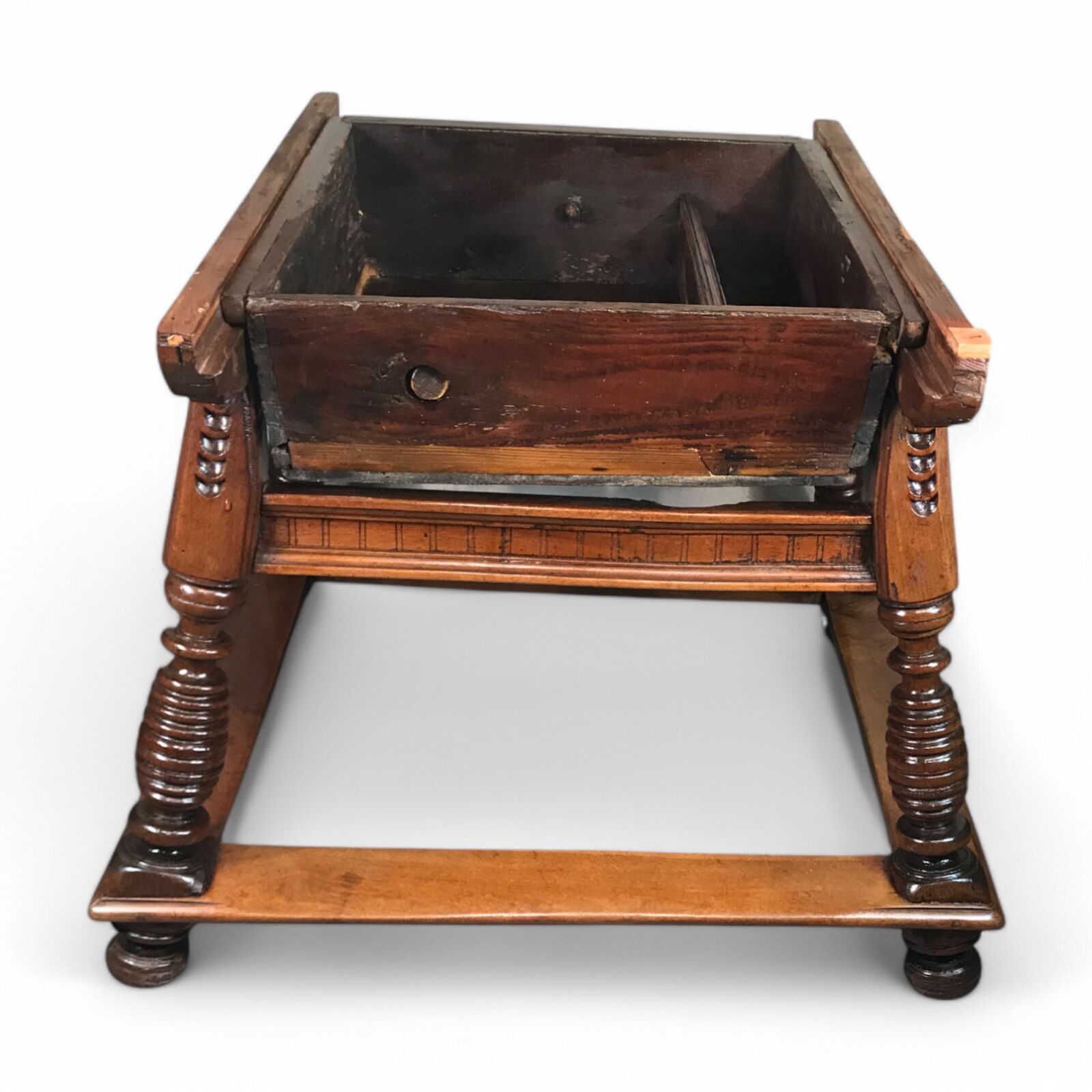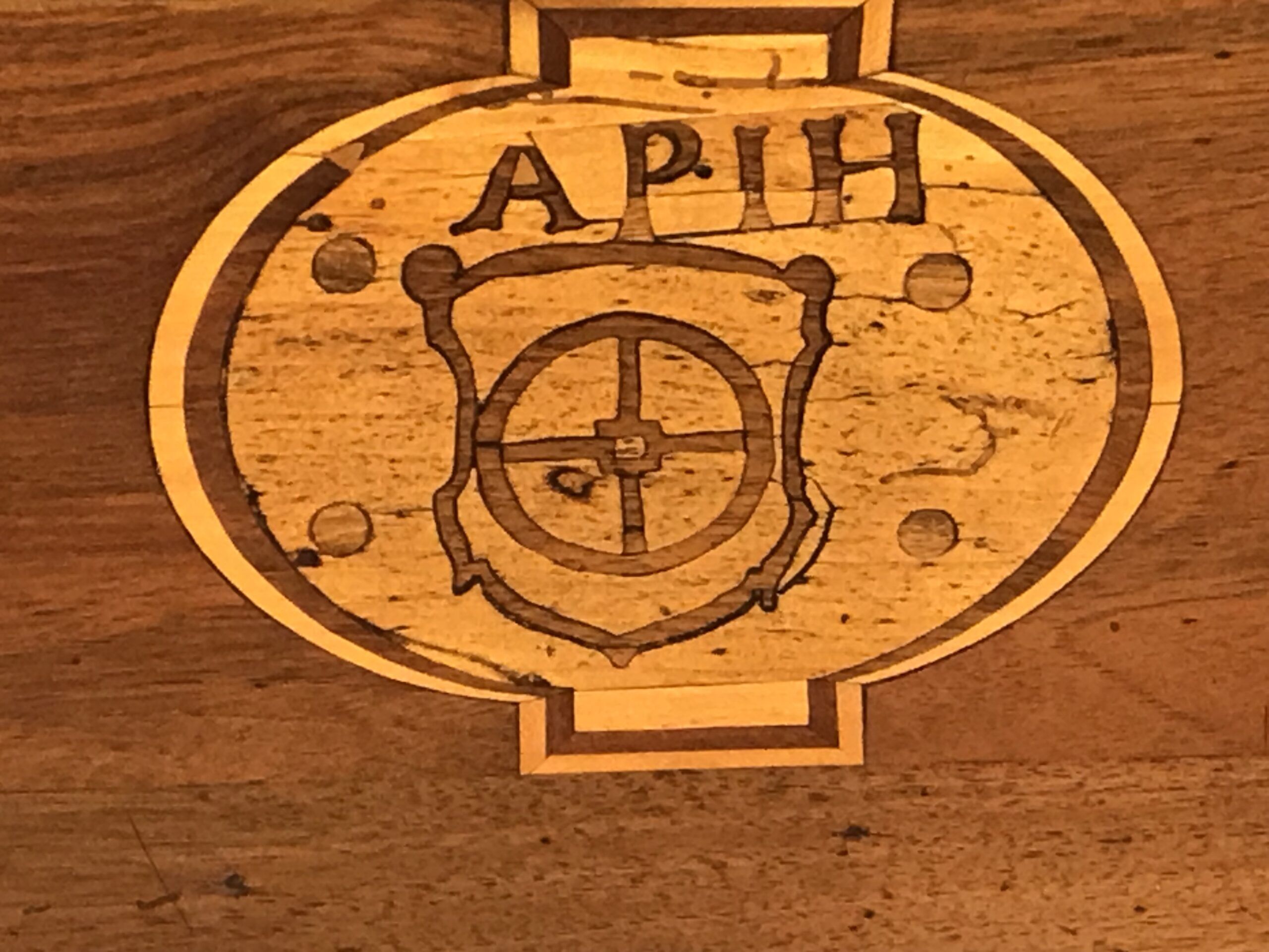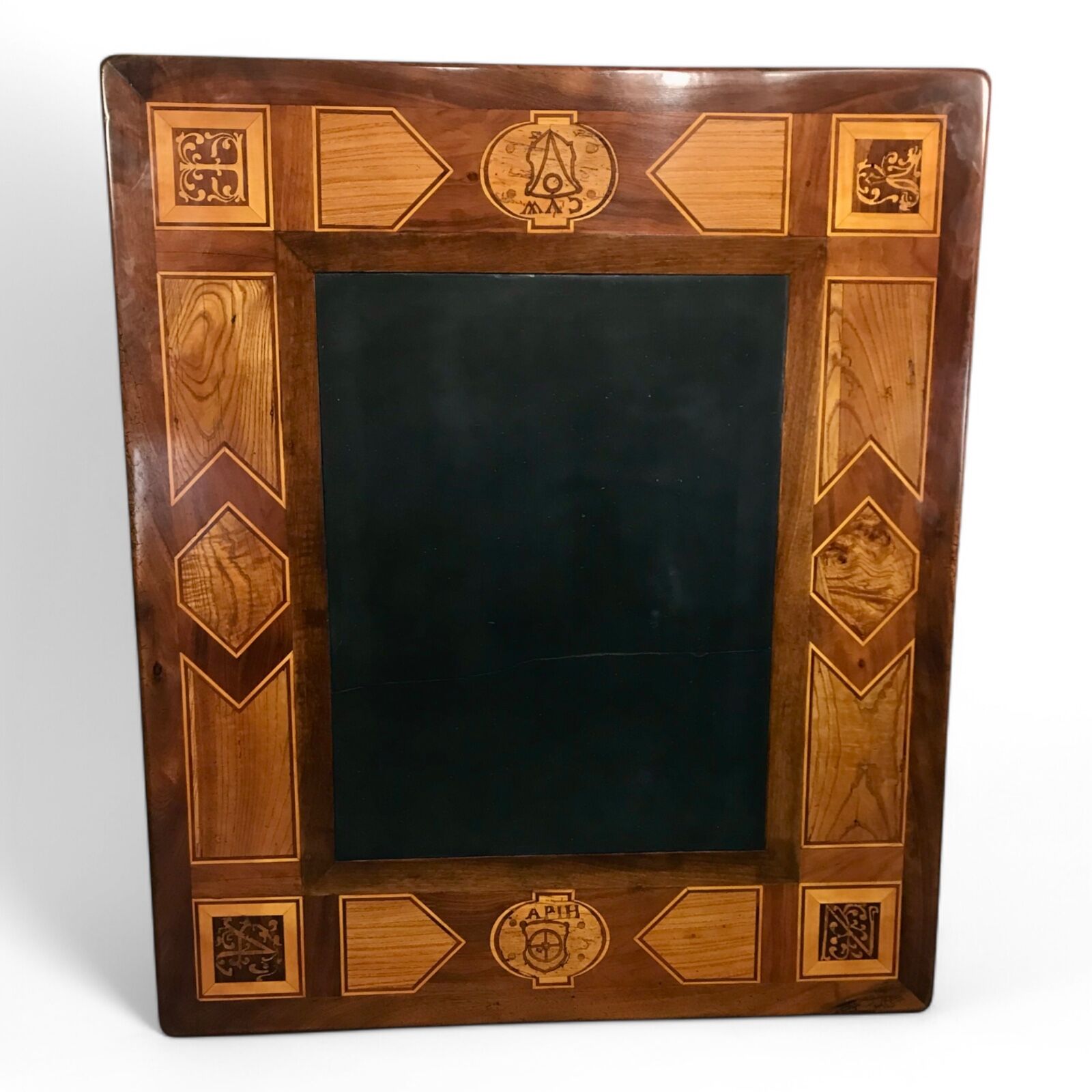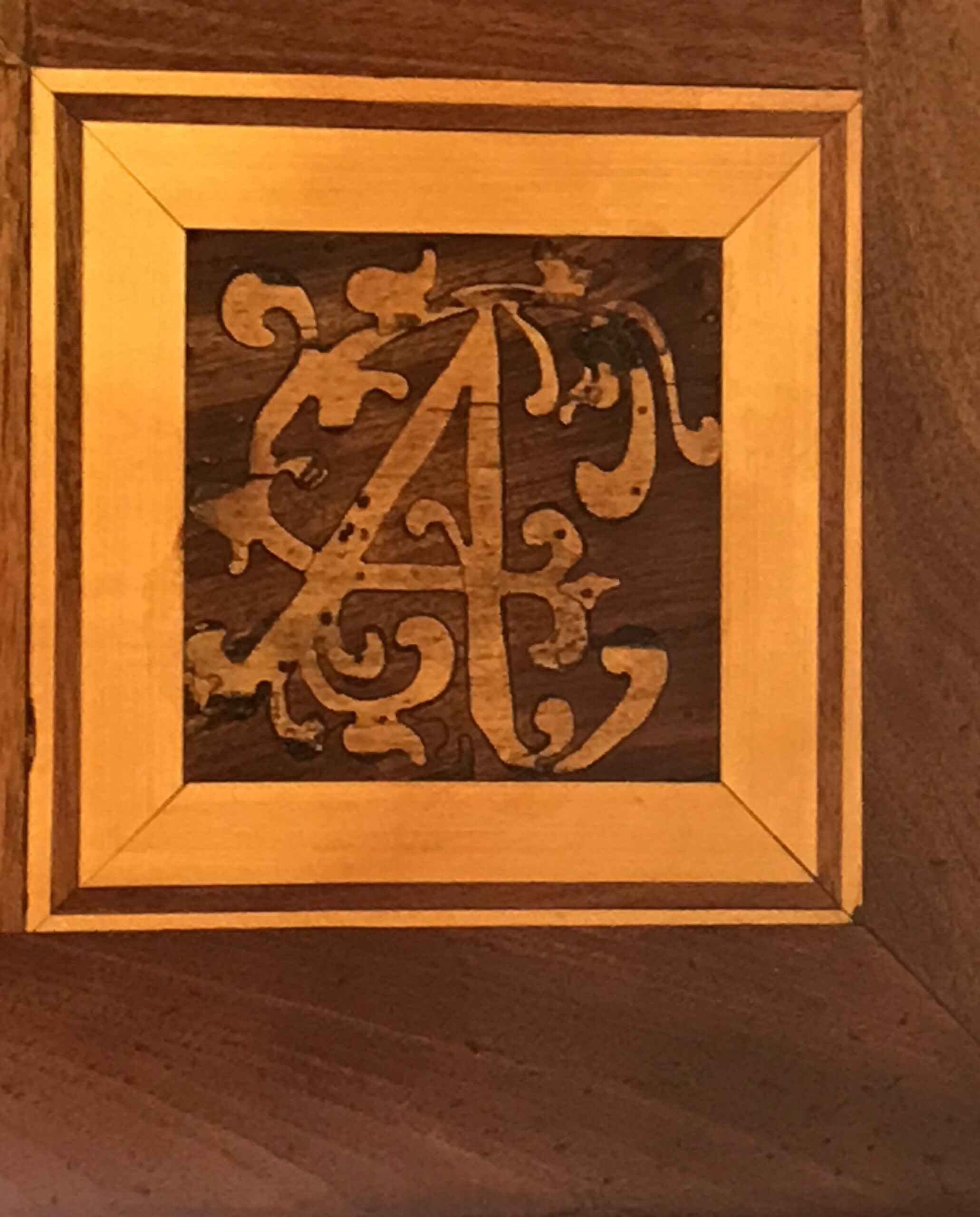 This Swiss 18th-century antique farmhouse table combines walnut, maple, and elm woods. The top features a stunning inlay design with a coat of arms and monograms, adding historical charm and refining the table’s character. A central slate insert, common in Swiss rustic tables of the 17th and 18th centuries, serves both as a practical surface for hot pots and as a unique design element. A single drawer offers convenient storage. Four lathed legsprovide sturdy support, while the apron showcases detailed carvings.
