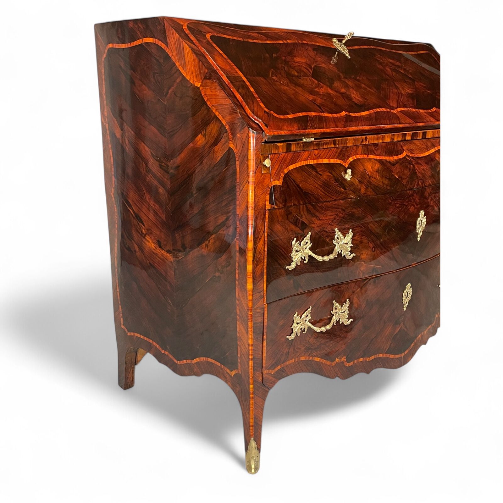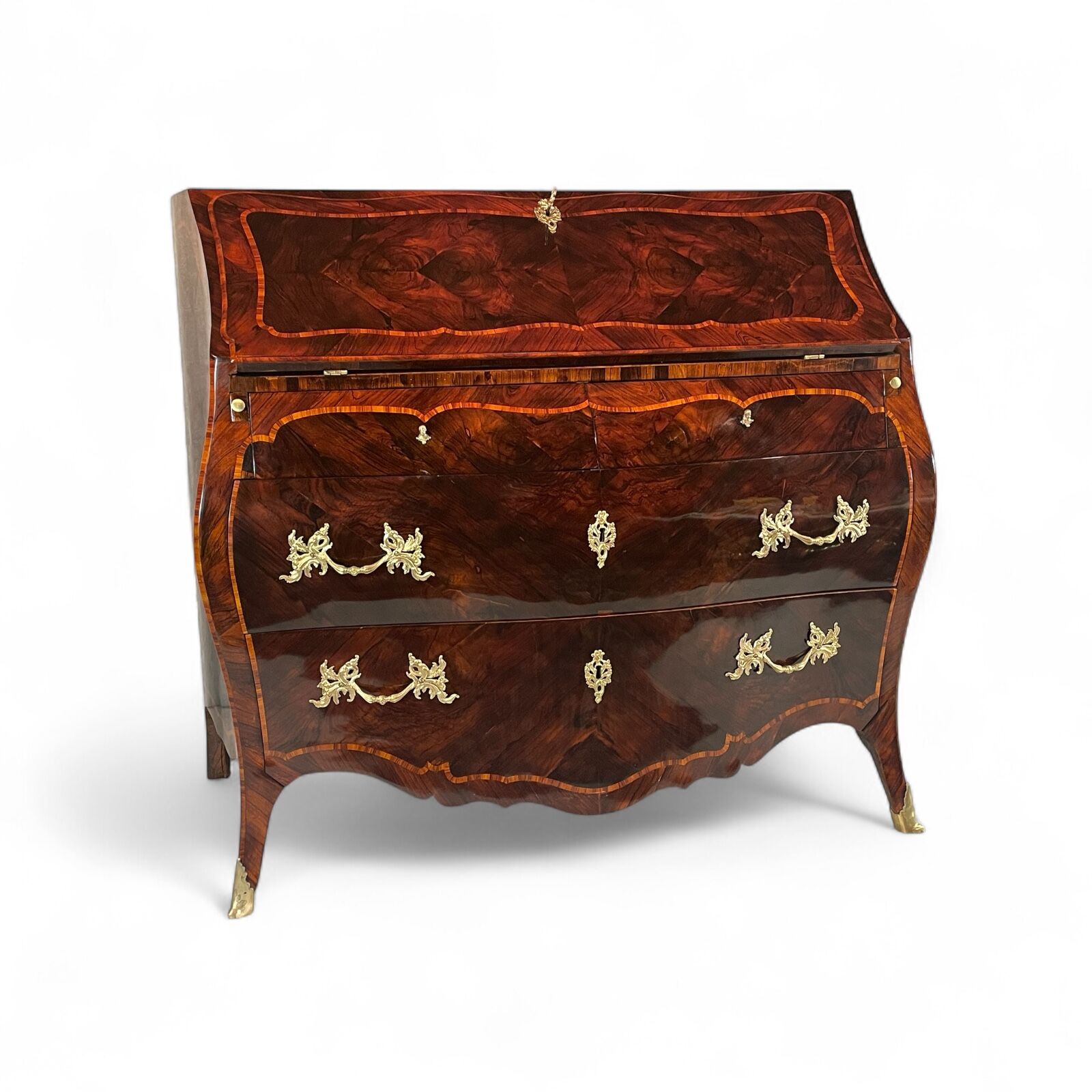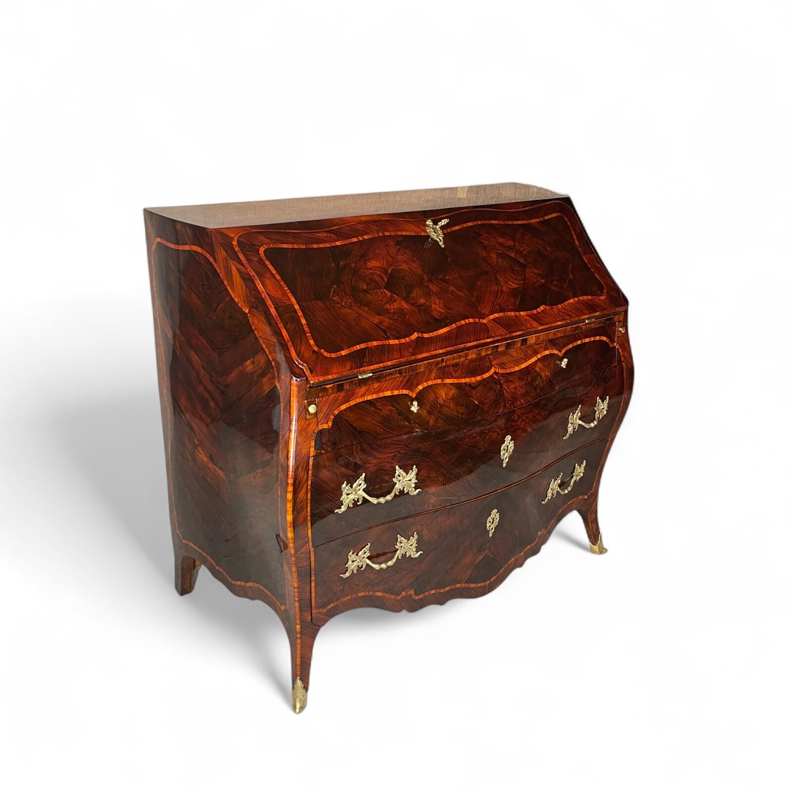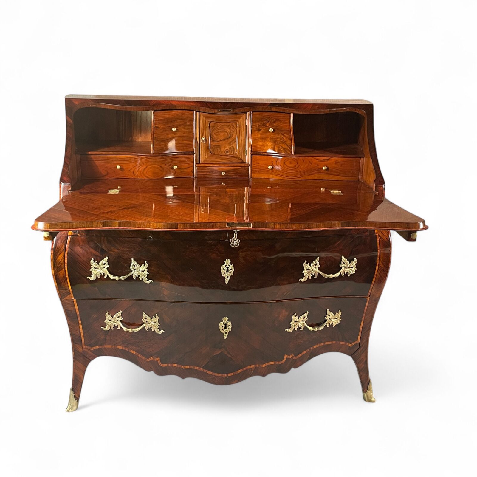 The desk features two large drawers and a slanting writing flap. Inside, four bombe-shaped drawers, a central cabinet with a door, and two open compartments showcase the meticulous attention to detail. The kingwood veneer pattern continues inside, making even the interior a visual delight.