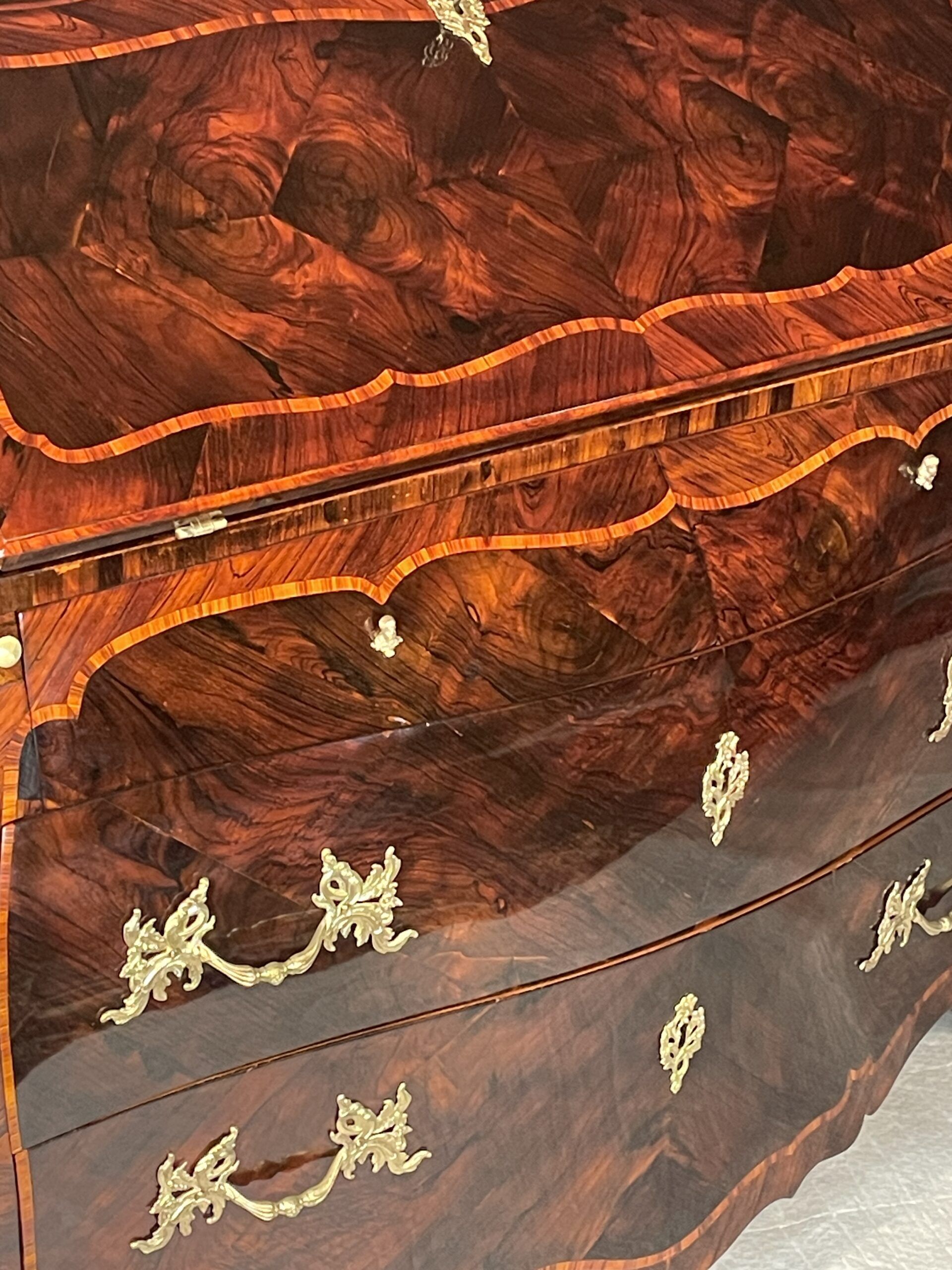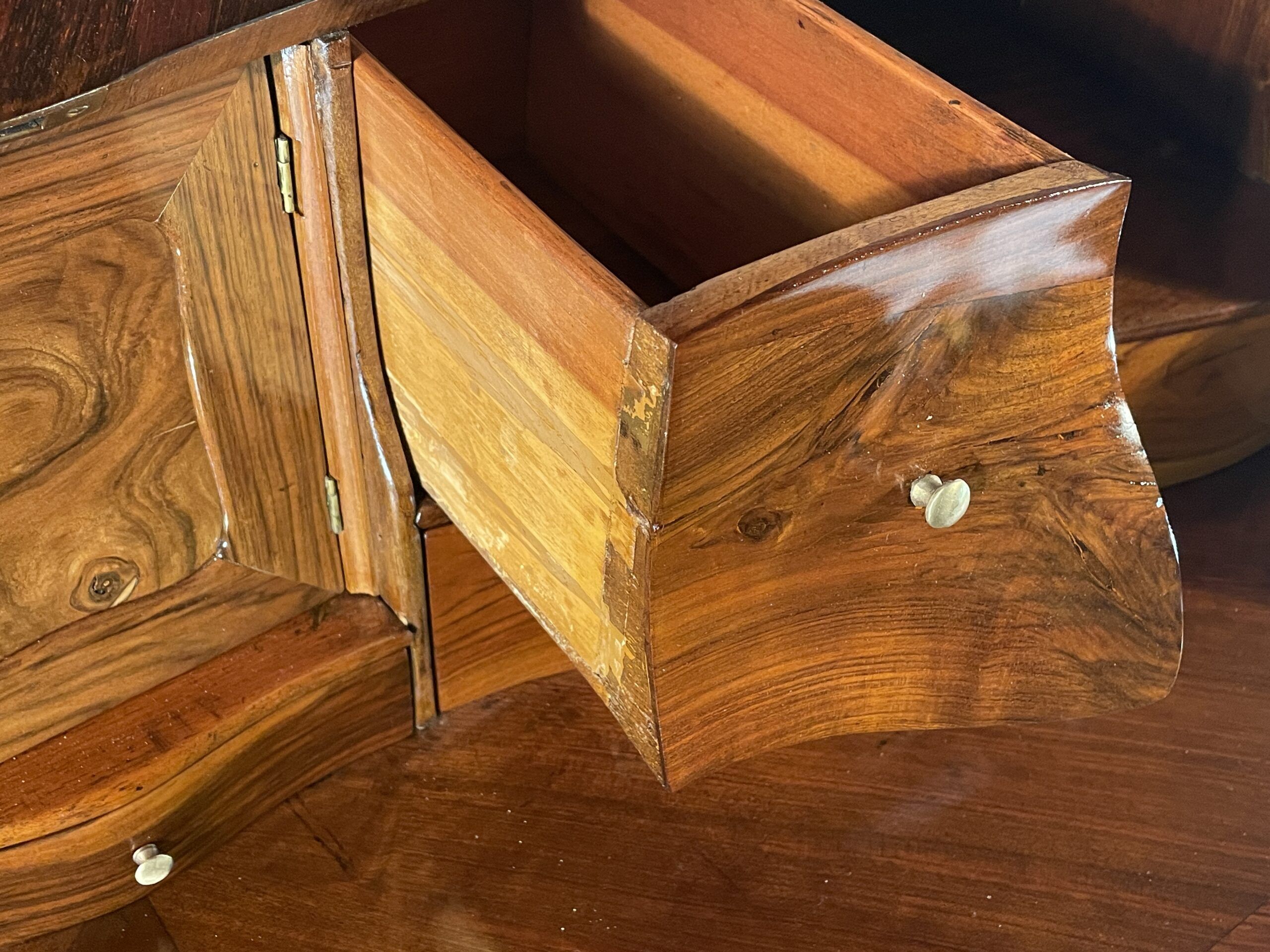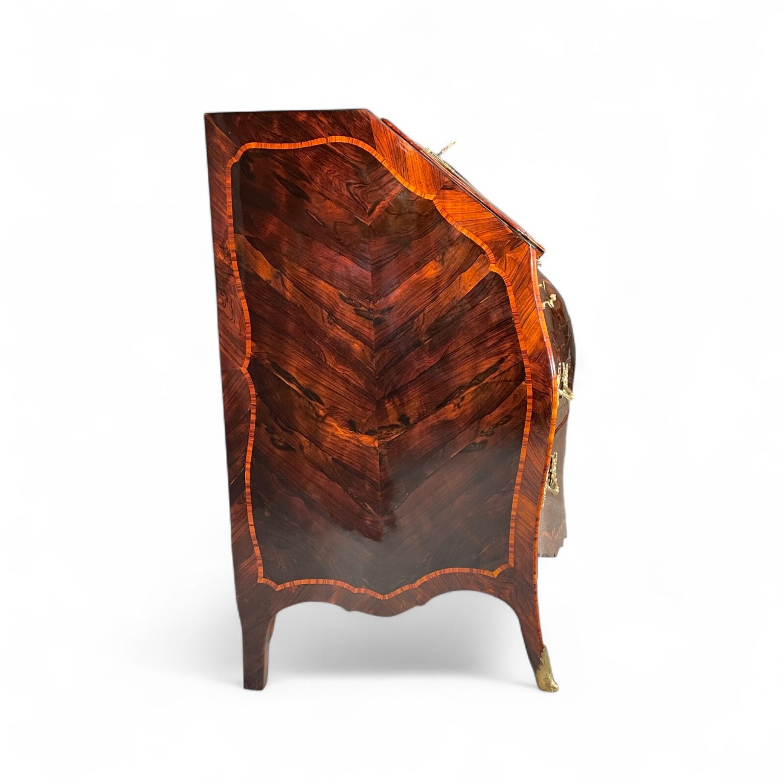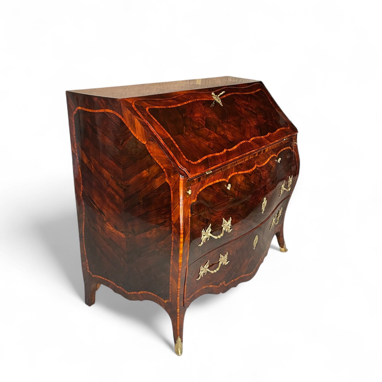 The desk features two large drawers and a slanting writing flap. Inside, four bombe-shaped drawers, a central cabinet with a door, and two open compartments showcase the meticulous attention to detail. The kingwood veneer pattern continues inside, making even the interior a visual delight.