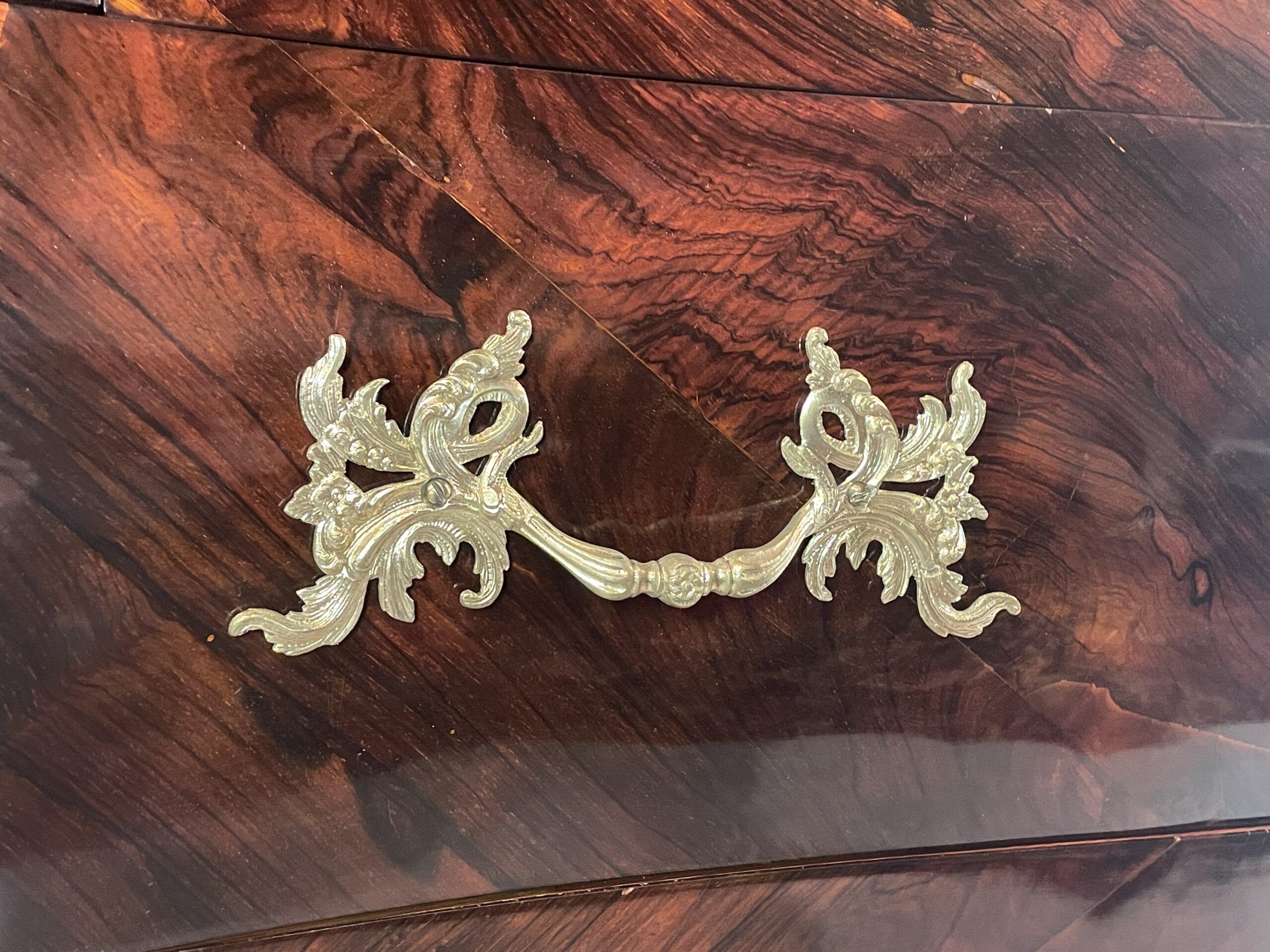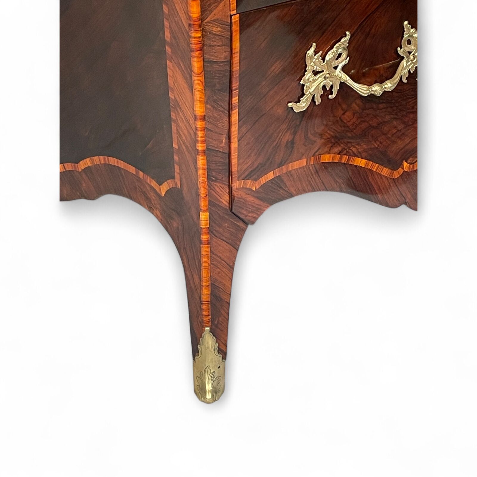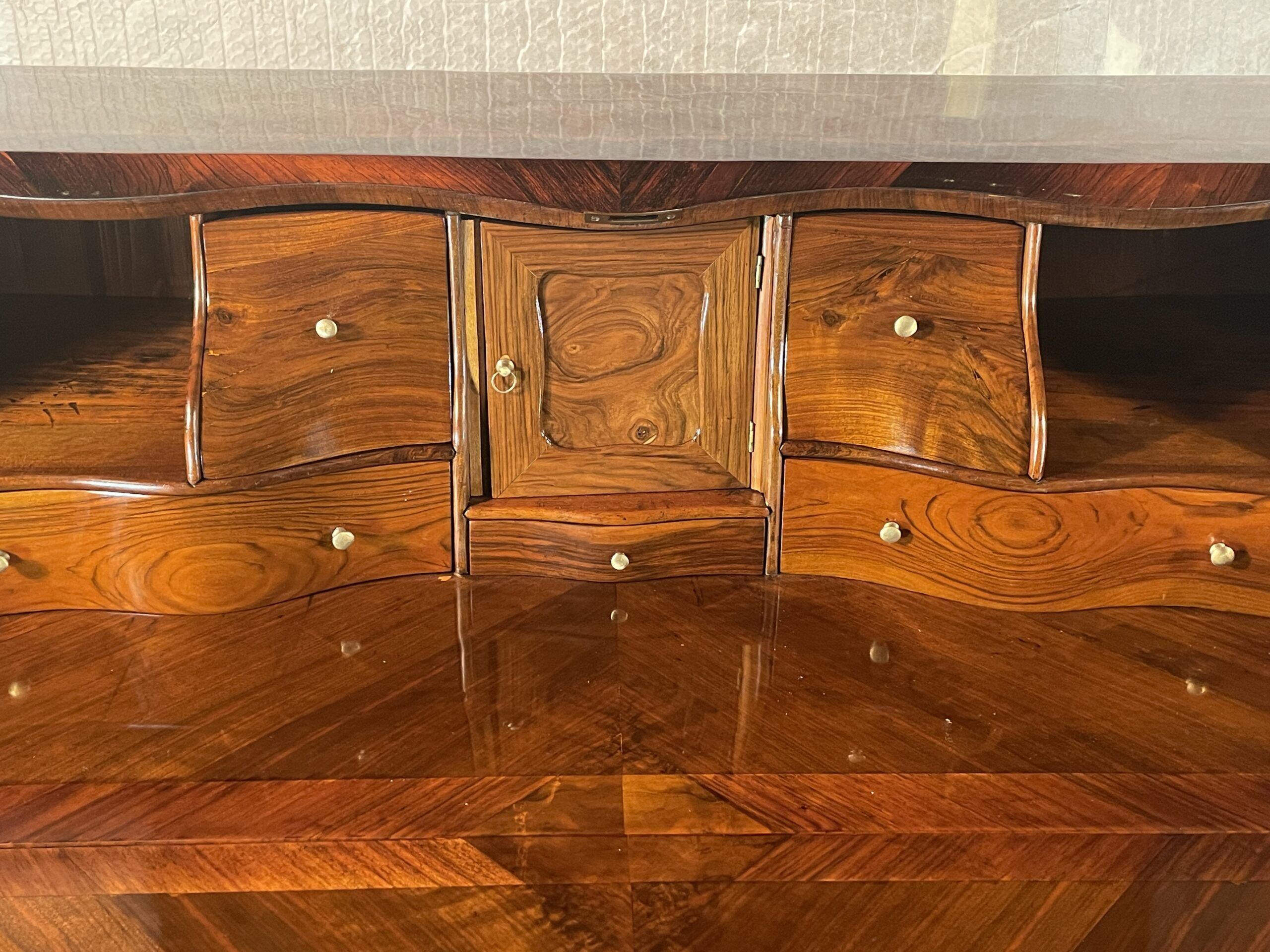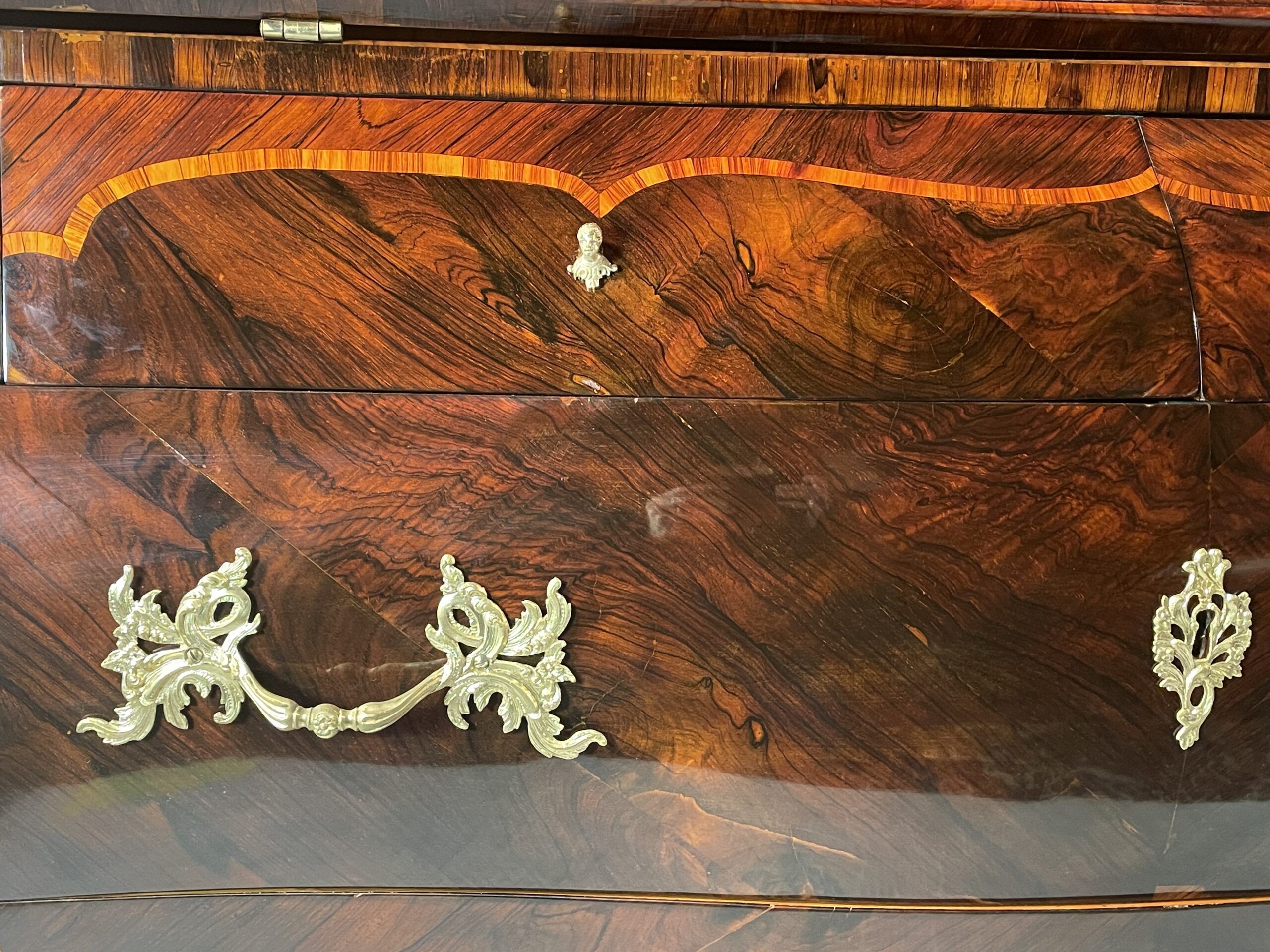 The desk features two large drawers and a slanting writing flap. Inside, four bombe-shaped drawers, a central cabinet with a door, and two open compartments showcase the meticulous attention to detail. The kingwood veneer pattern continues inside, making even the interior a visual delight.