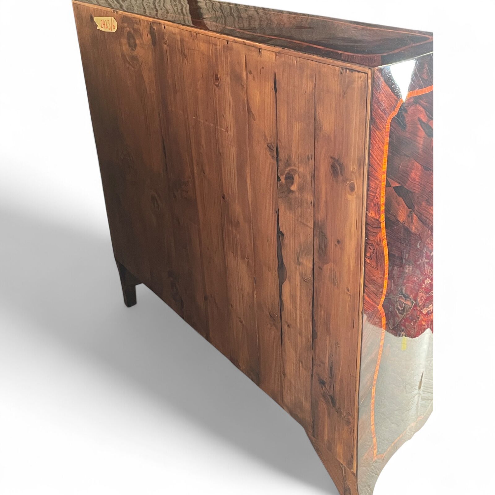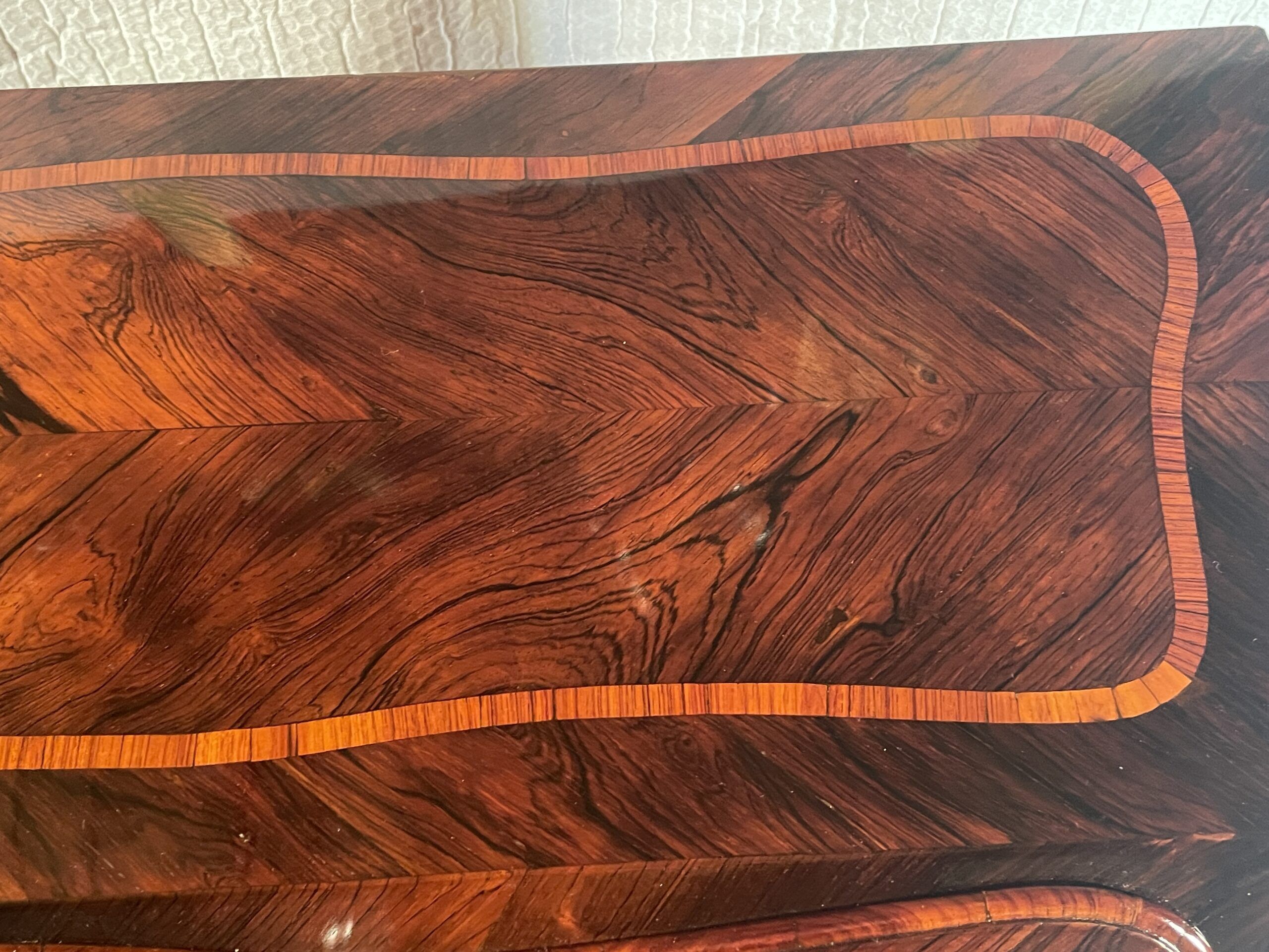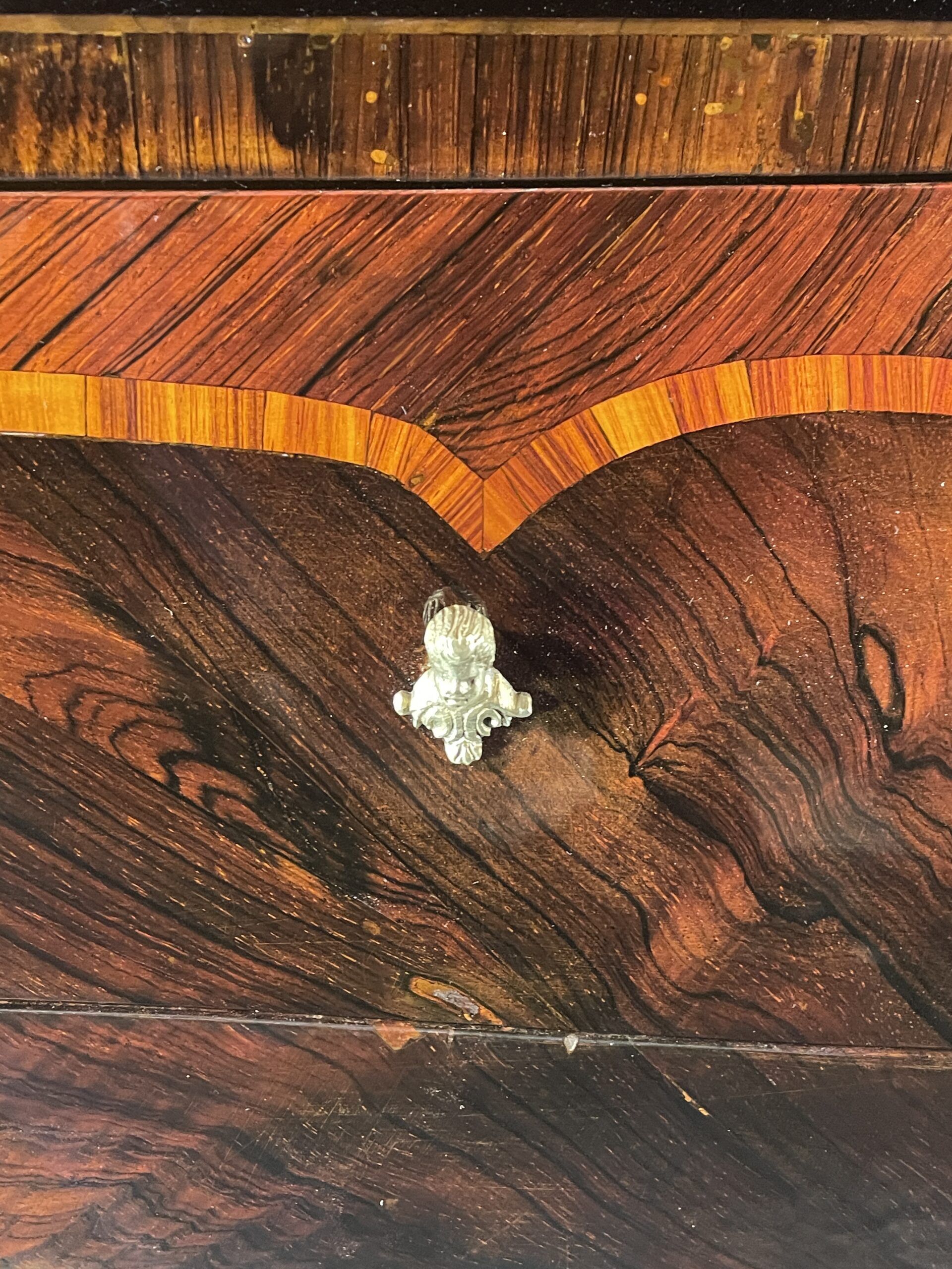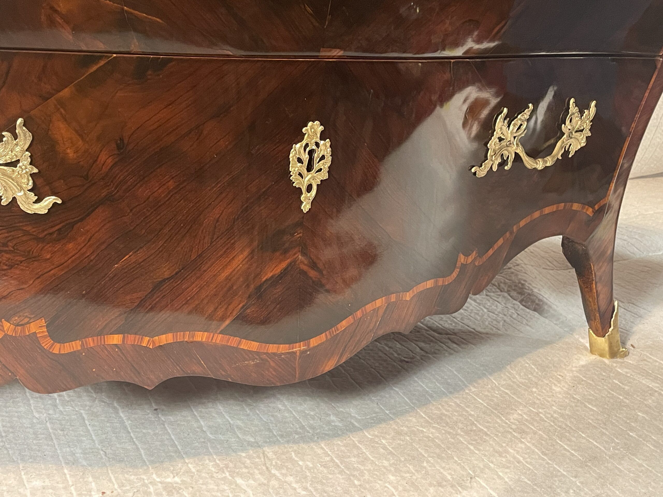 The desk features two large drawers and a slanting writing flap. Inside, four bombe-shaped drawers, a central cabinet with a door, and two open compartments showcase the meticulous attention to detail. The kingwood veneer pattern continues inside, making even the interior a visual delight.