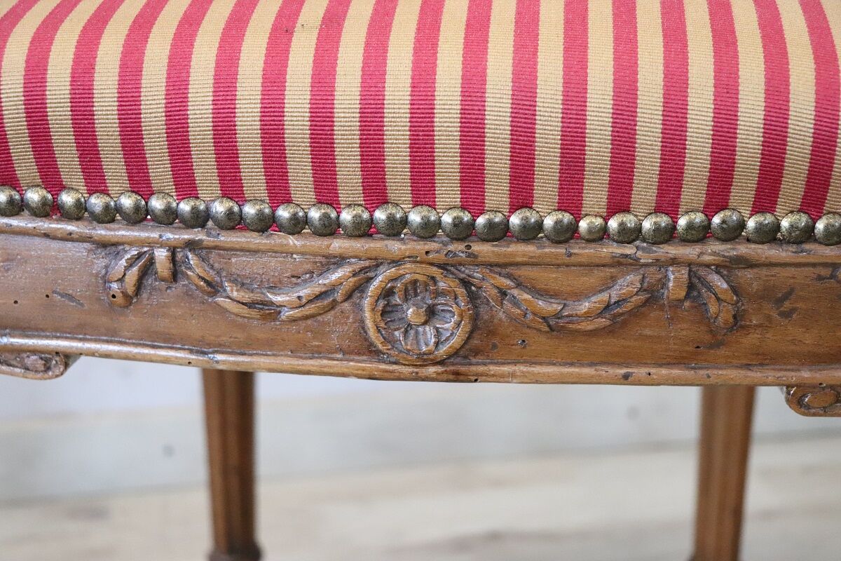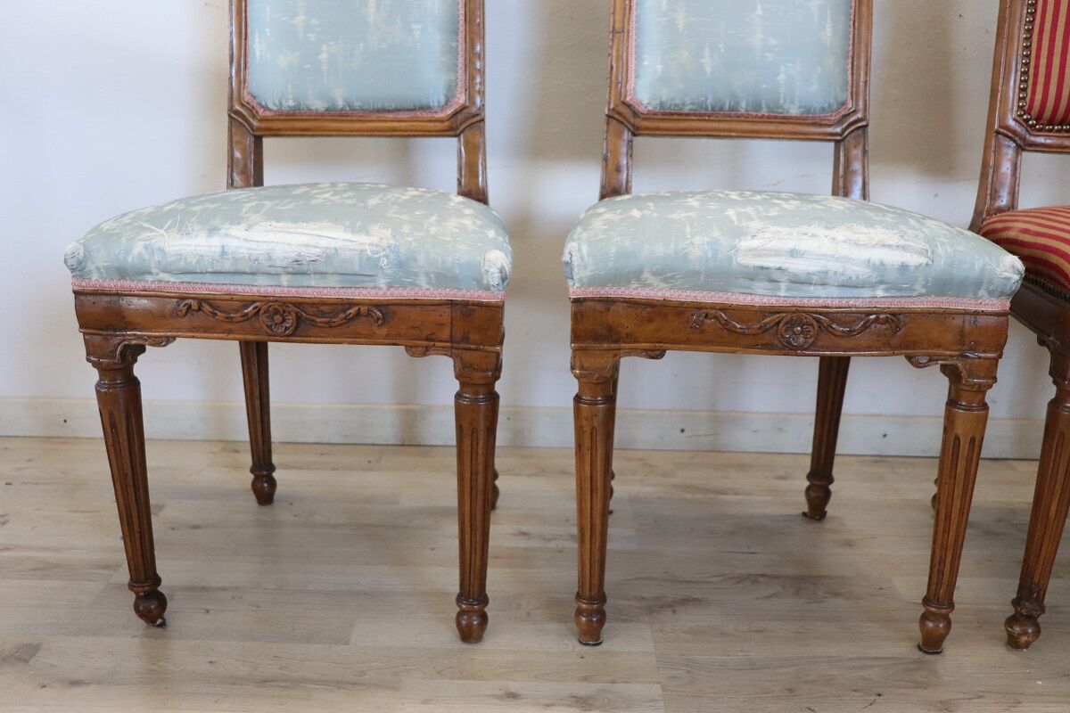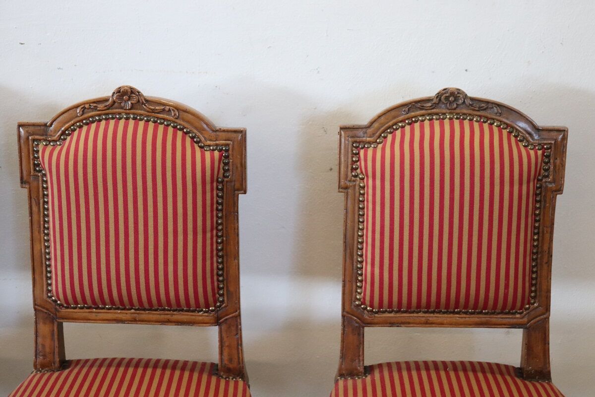 Experience the timeless elegance of the Louis XVI period with this stunning set of four antique Italian chairs, masterfully crafted from solid walnut. These 18th-century chairs embody the refined taste and craftsmanship of the era, making them authentic pieces from the Louis XVI period, known for its classical symmetry and subdued opulence.