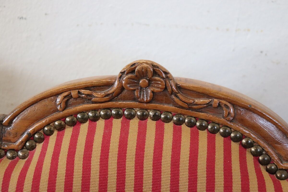 The walnut frames and padding are in impeccable condition. Note that the fabric upholstery needs replacing, offering the opportunity to personalize these magnificent pieces to suit your decor. Perfect for enhancing an important dining room setup or for use as luxurious accent pieces in any refined space, these chairs are a must-have for antique enthusiasts and collectors.