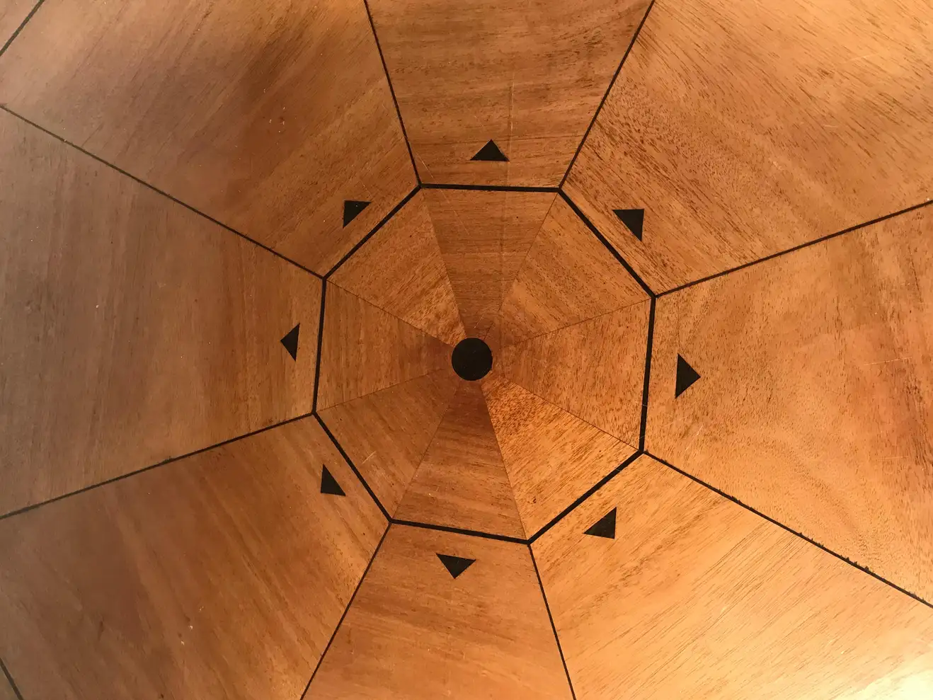 This unique Art Deco table dates back to around 1910-20. It comes from Germany. The table has a walnut veneer and is decorated with geometric ebonized inlays of different types of wood. It has an octagonal top with a protecting glass on top. The beautiful base has 8 columns which stand on a corresponding octagonal base This is a very decorative original center table from the Art Deco Period, which could be used as a center table in an entryway or living room area. The table is in good original condition. We are offering professional refinishing for this piece, please contact us for further questions.