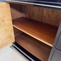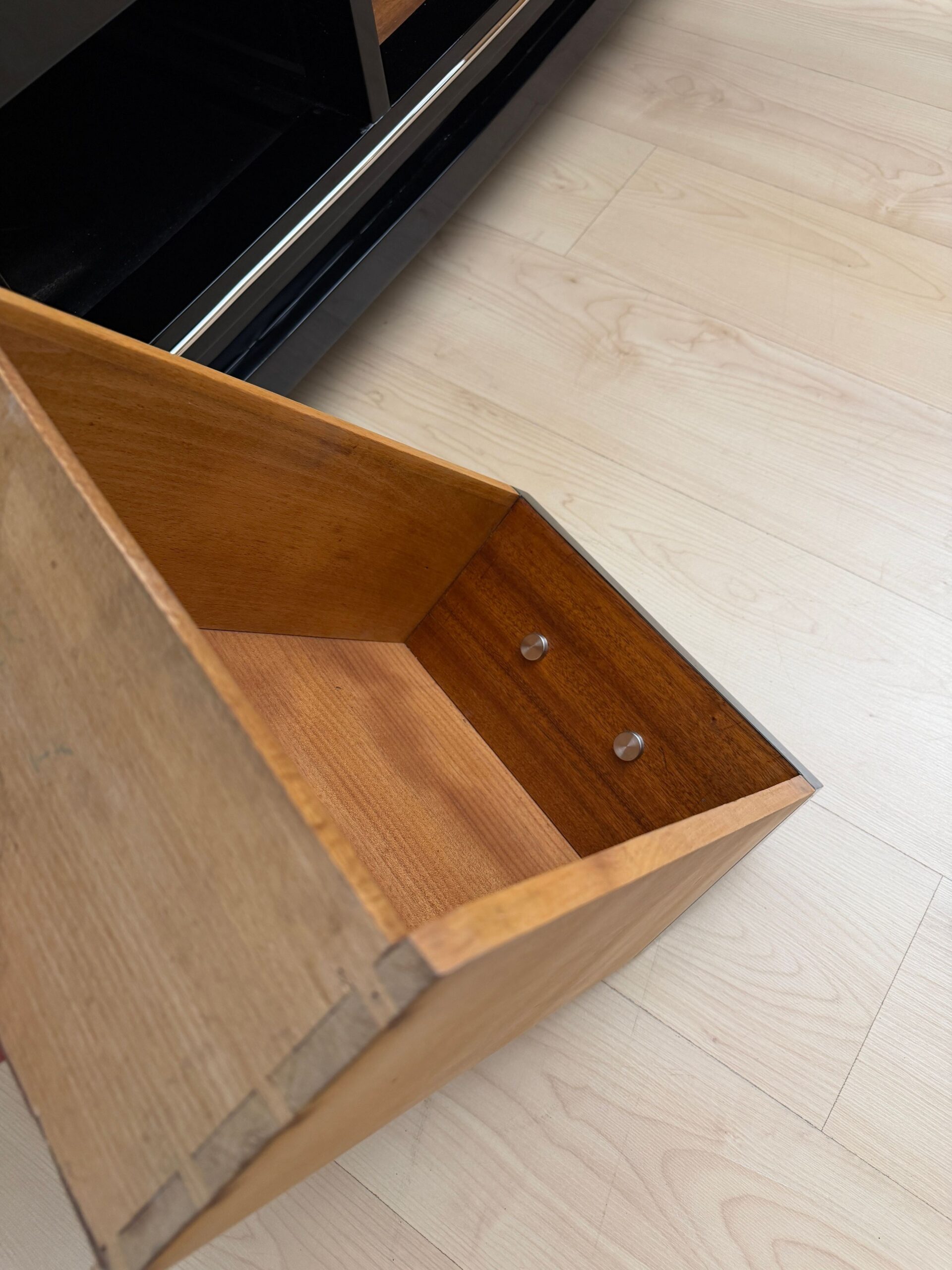 Two drawers in the center at the bottom and a lockable flap with open compartment at the top. On each side inside, there is an adjustable shelf in mahogany veneer and bright maple edge. Original, finely crafted and newly chrome-plated fittings and handles.