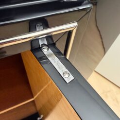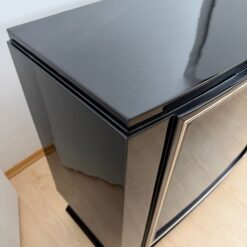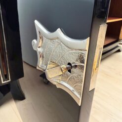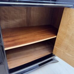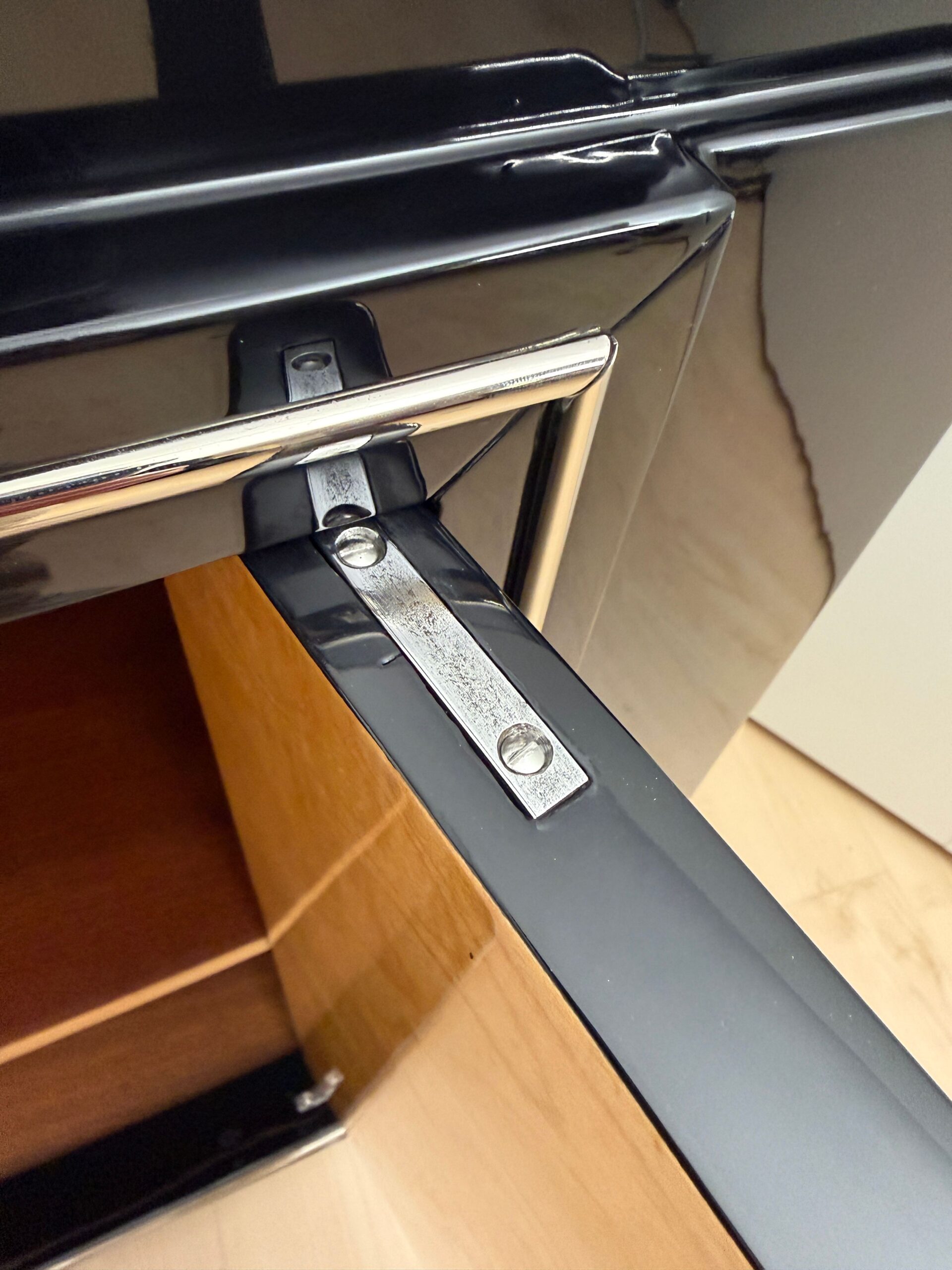 Framed at the front with original, newly chrome-plated decorative strip. Two doors on the sides, inside counter veneered in maple and also lacquered.