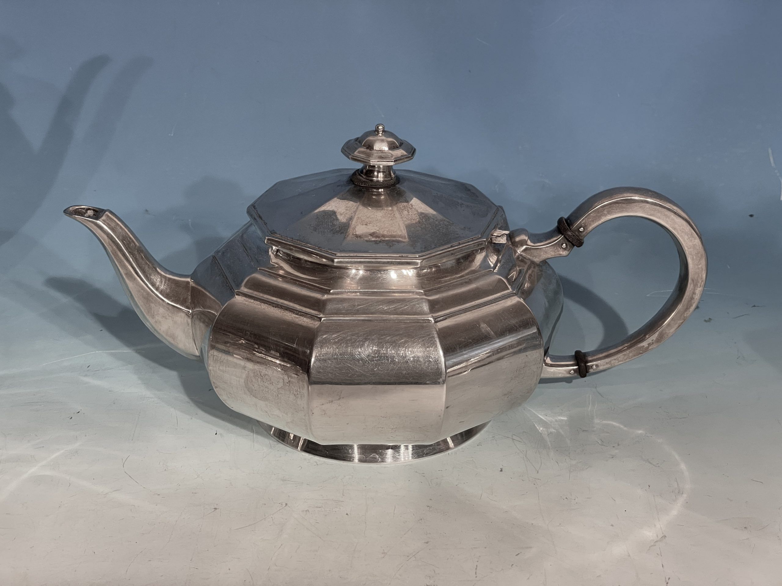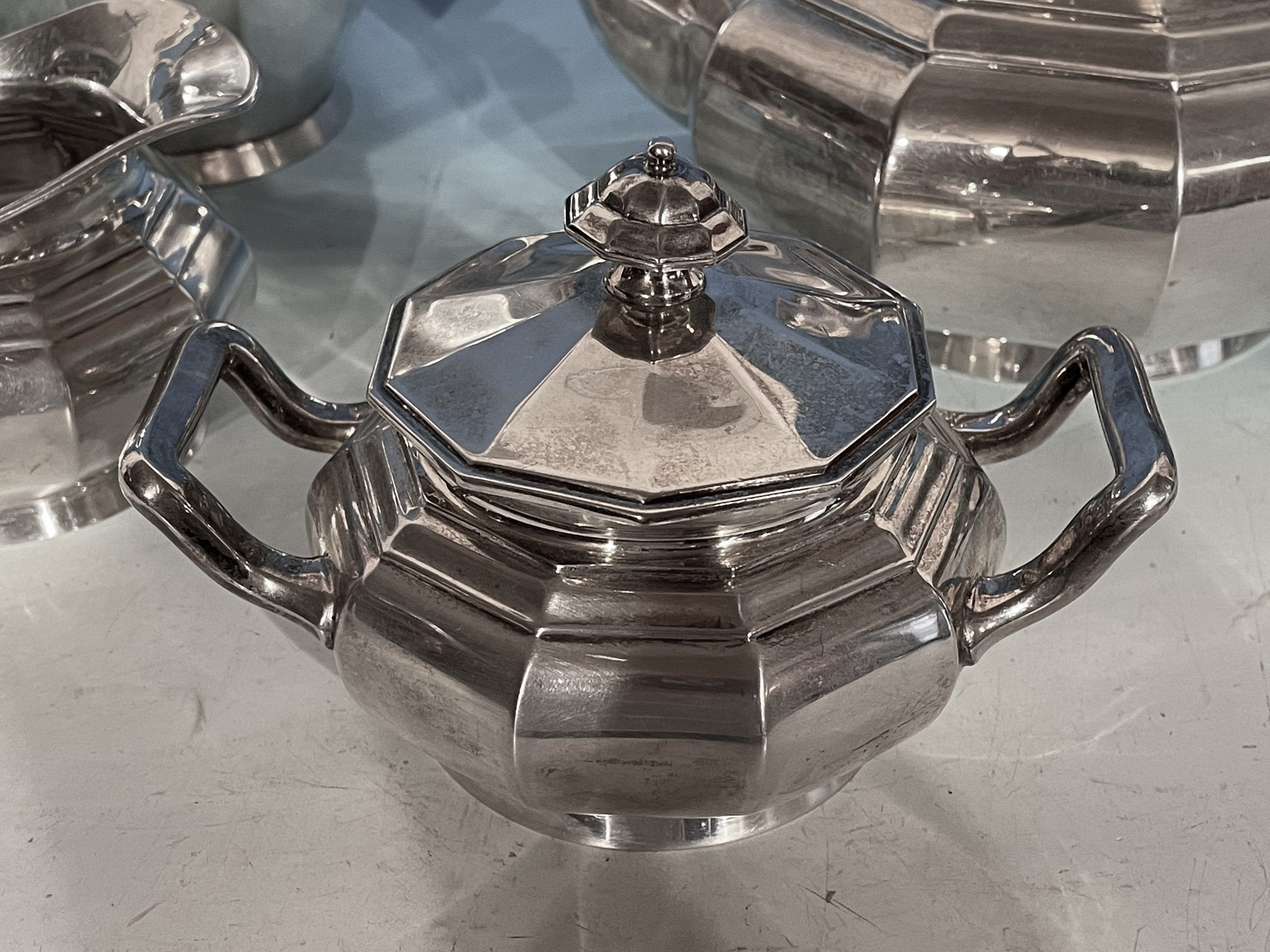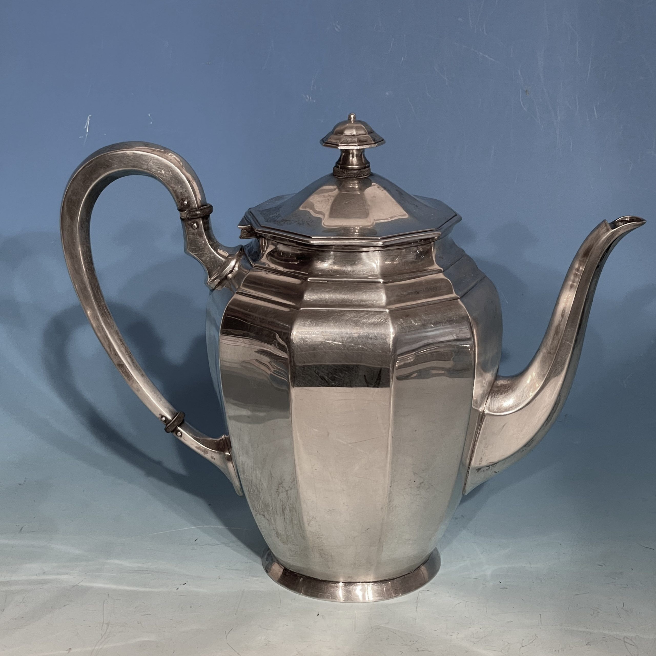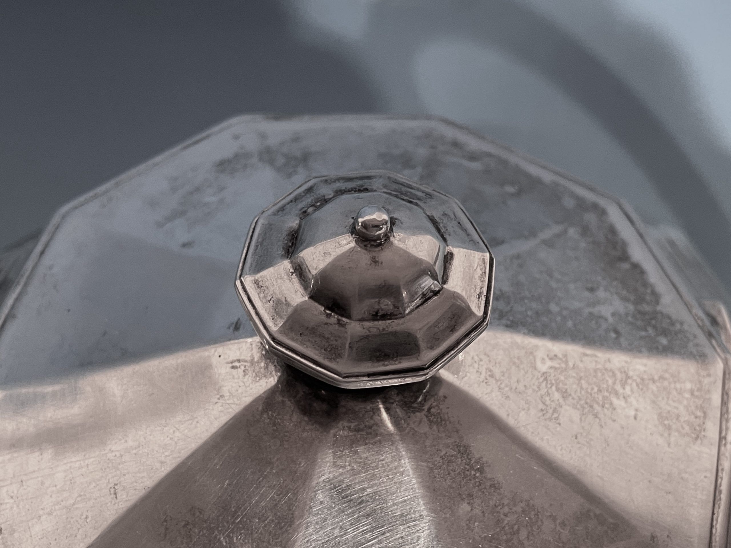 This pretty Art Deco silver coffee and tea set stands out for its geometric design of the early 20th century. The silver marks identify it as a German piece with a millesimal fineness of 835. The set is in good condition with the expected wear and tear.