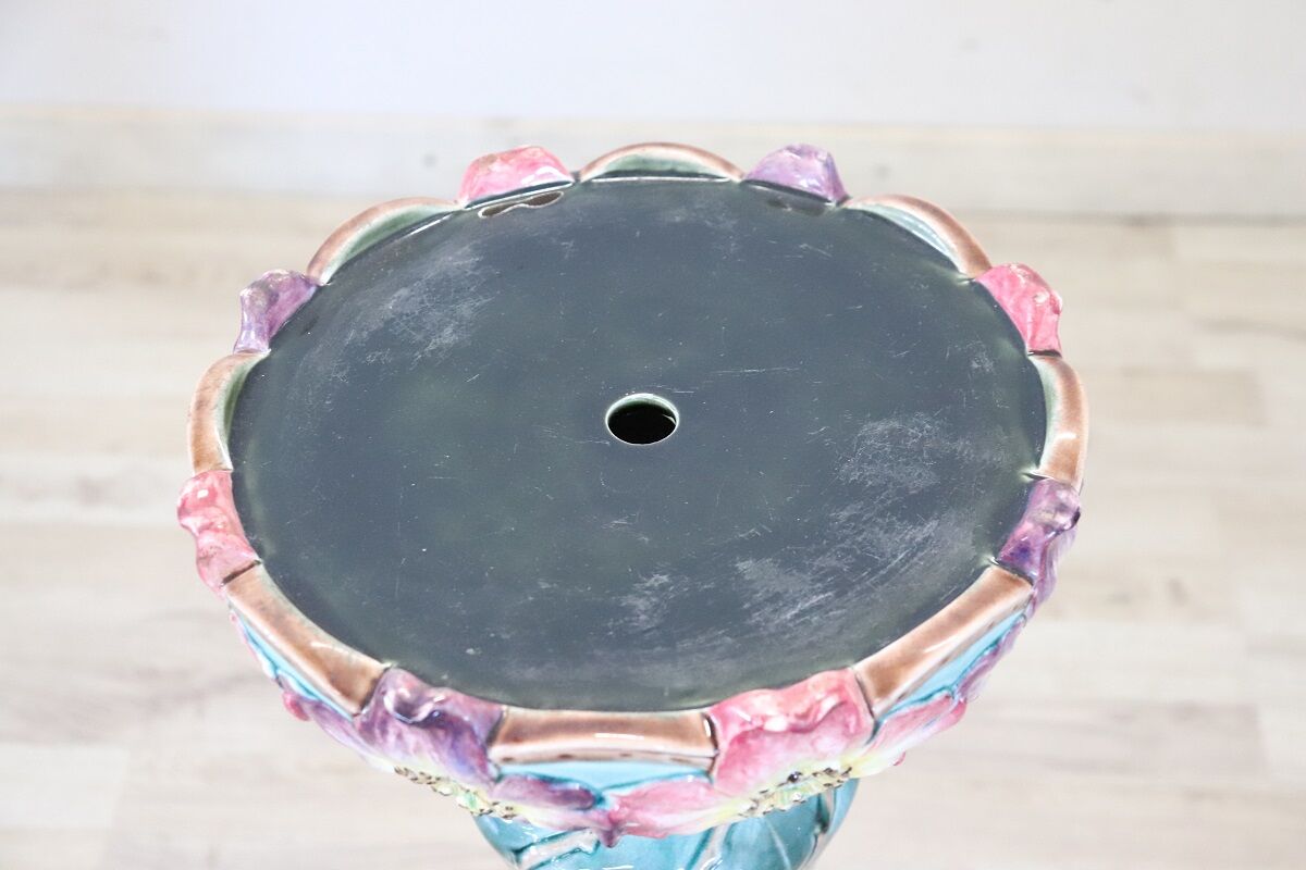 This Art Nouveau Column comes from Italy and dates to the early 20th century. The ceramic body features a vivid polychrome glaze that highlights large floral motifs. The flowers rise in high relief and create a bold three-dimensional effect. Each detail shows skilled craftsmanship and strong Art Nouveau influence.