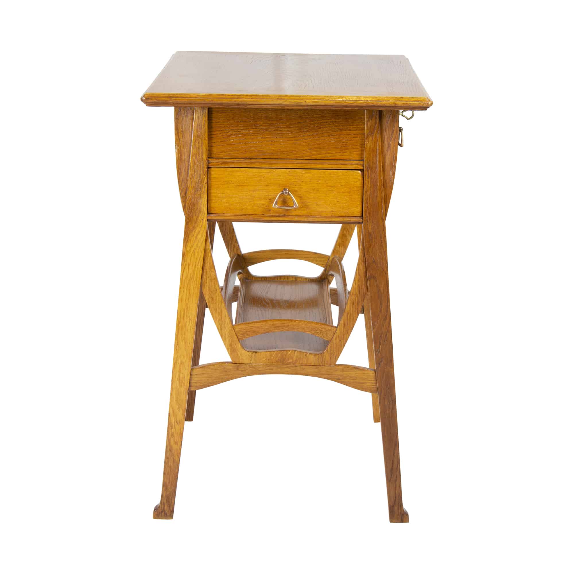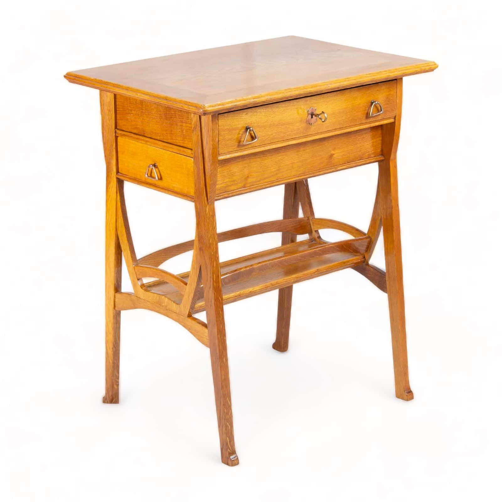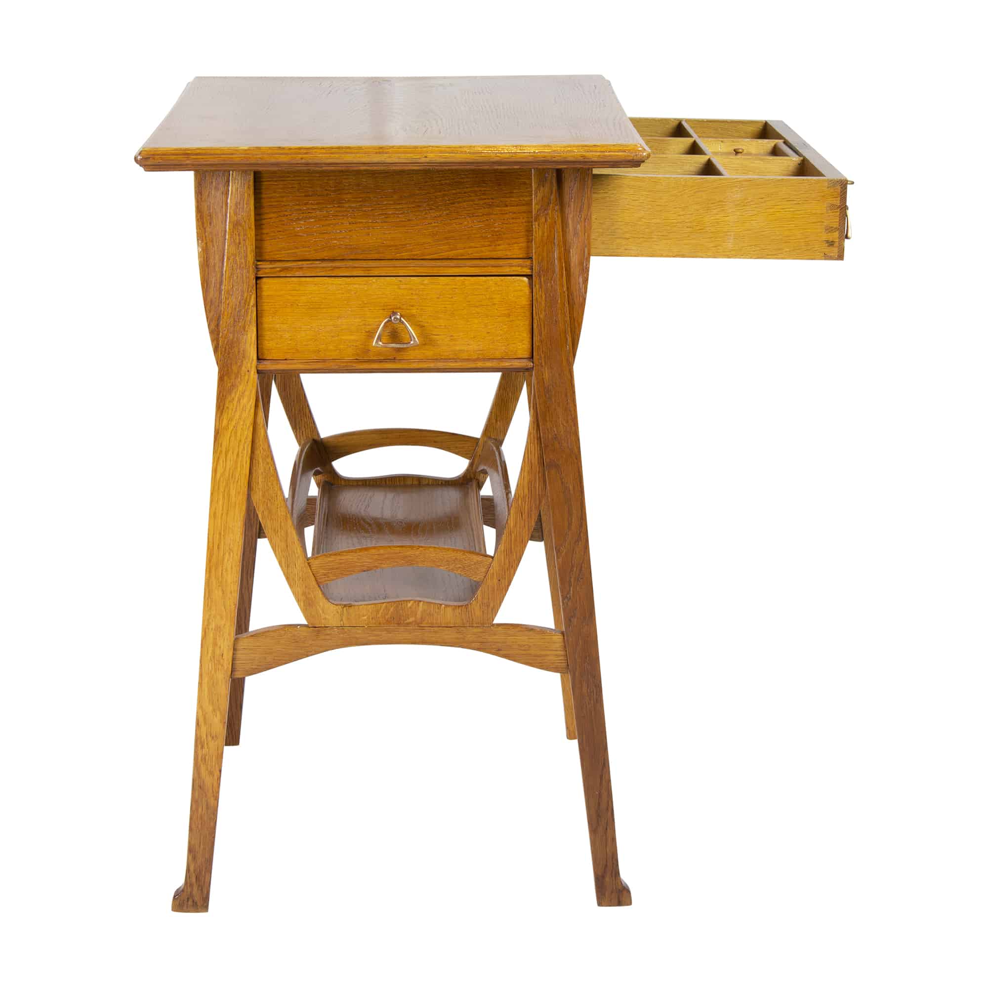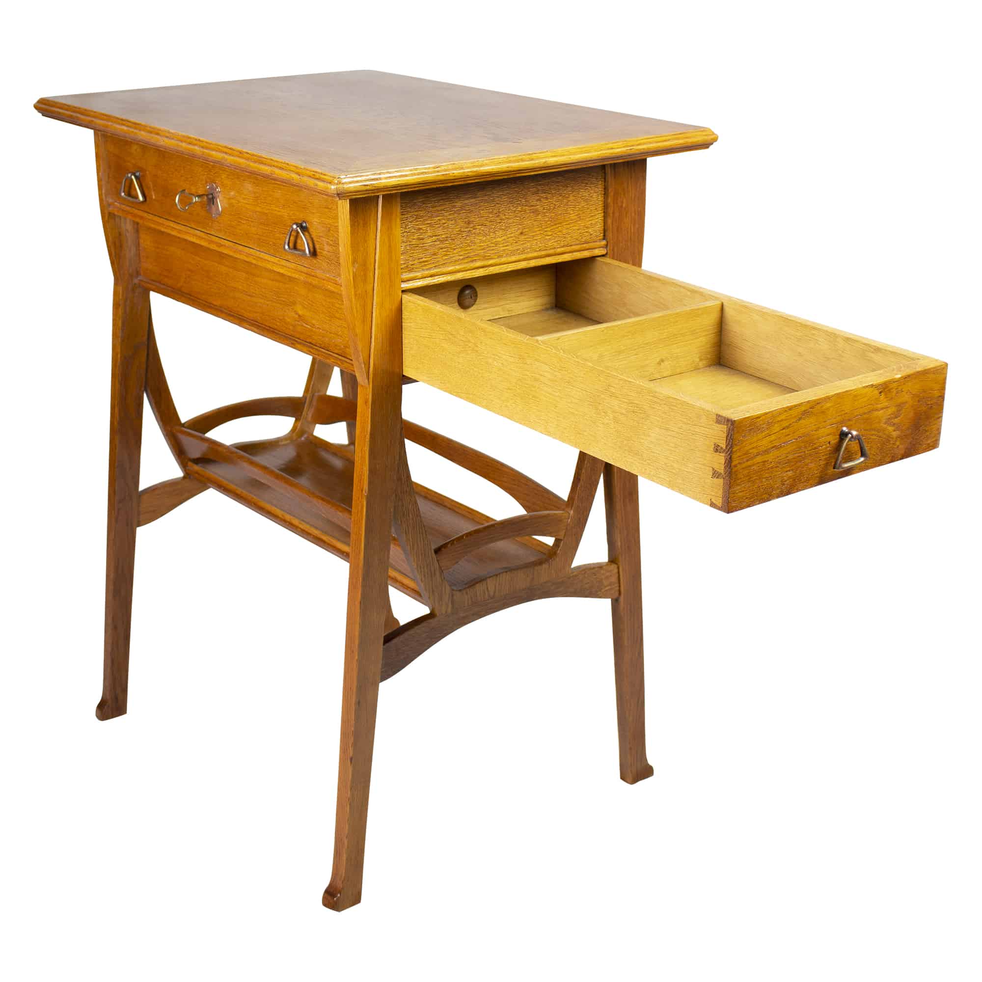 The beautiful antique Art Nouveau oakwood sewing or side table dates back to the time of Art Nouveau period, more specifically from the time, around 1905. The table has the typical Art Nouveau design features. The bottom drawer can be opened in both directions. In very good restored condition.