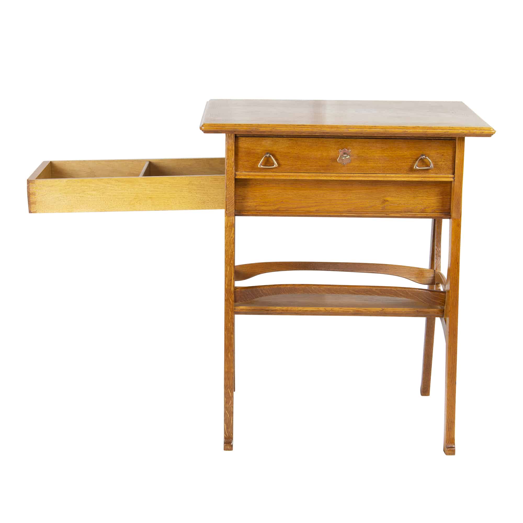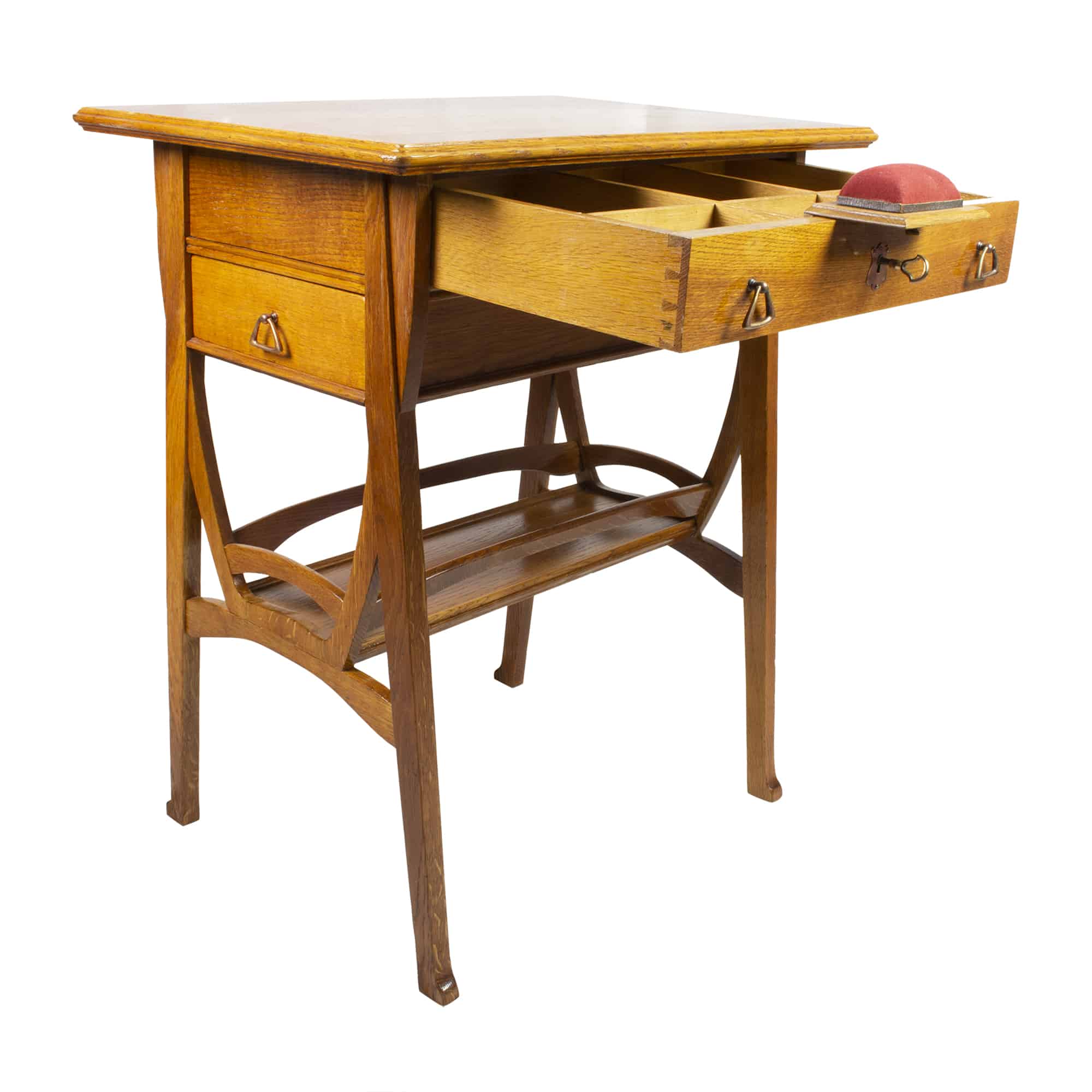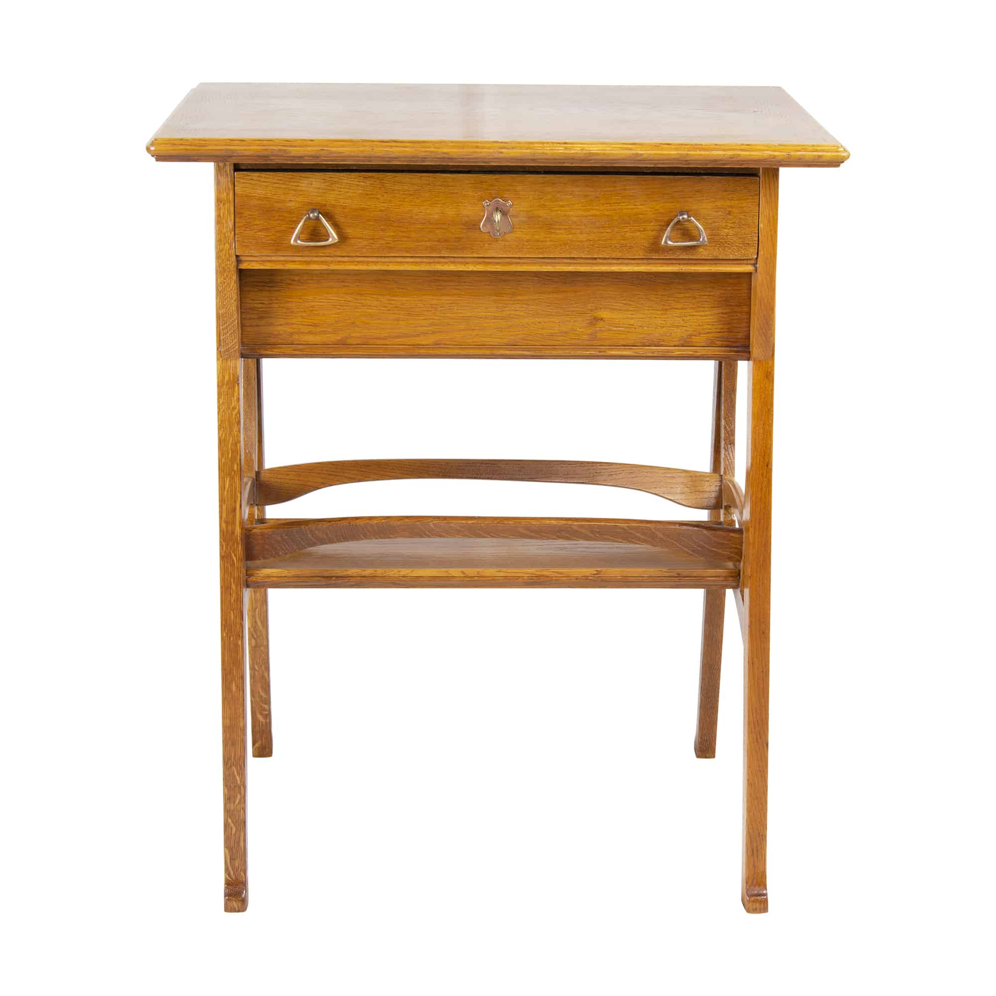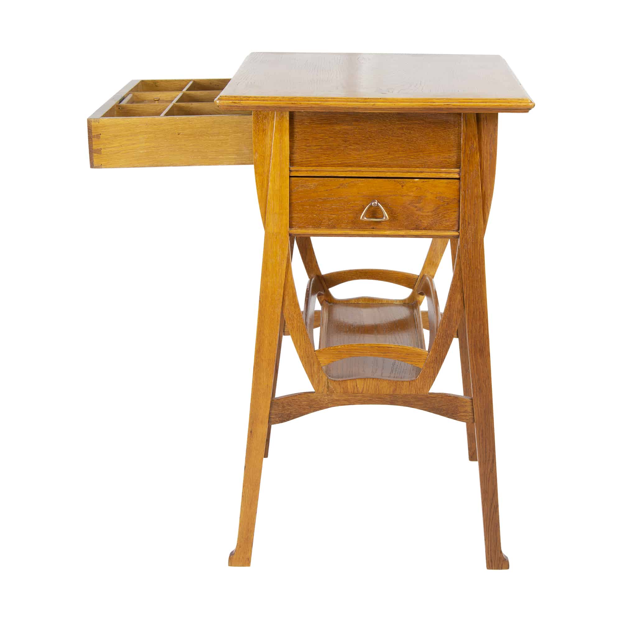 The beautiful antique Art Nouveau oakwood sewing or side table dates back to the time of Art Nouveau period, more specifically from the time, around 1905. The table has the typical Art Nouveau design features. The bottom drawer can be opened in both directions. In very good restored condition.