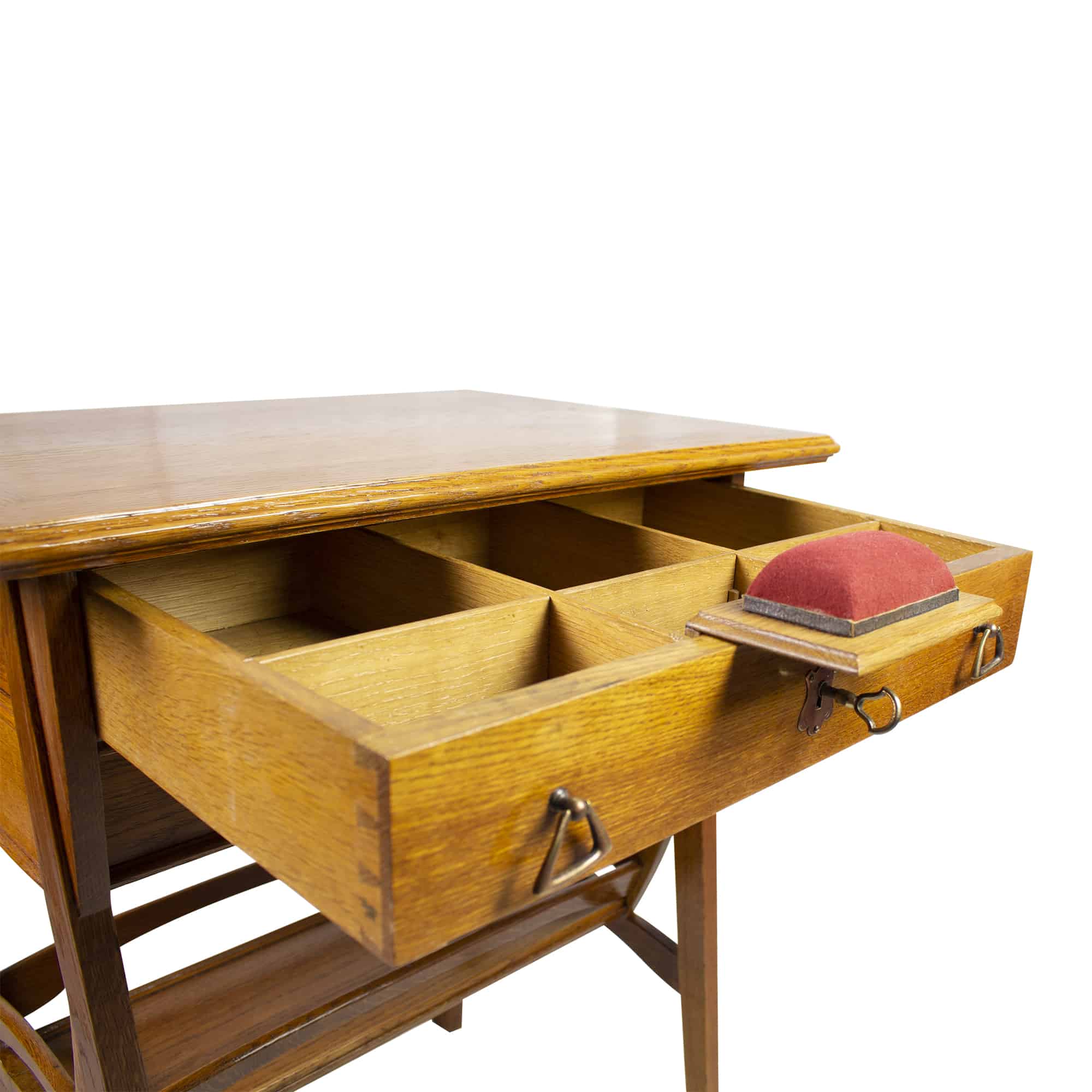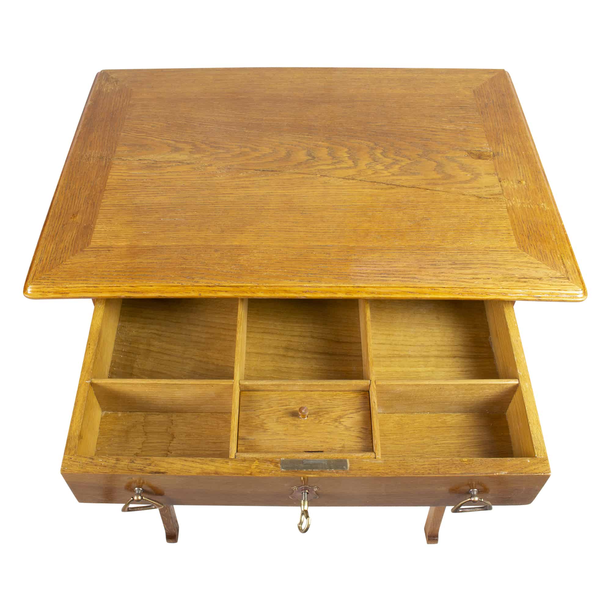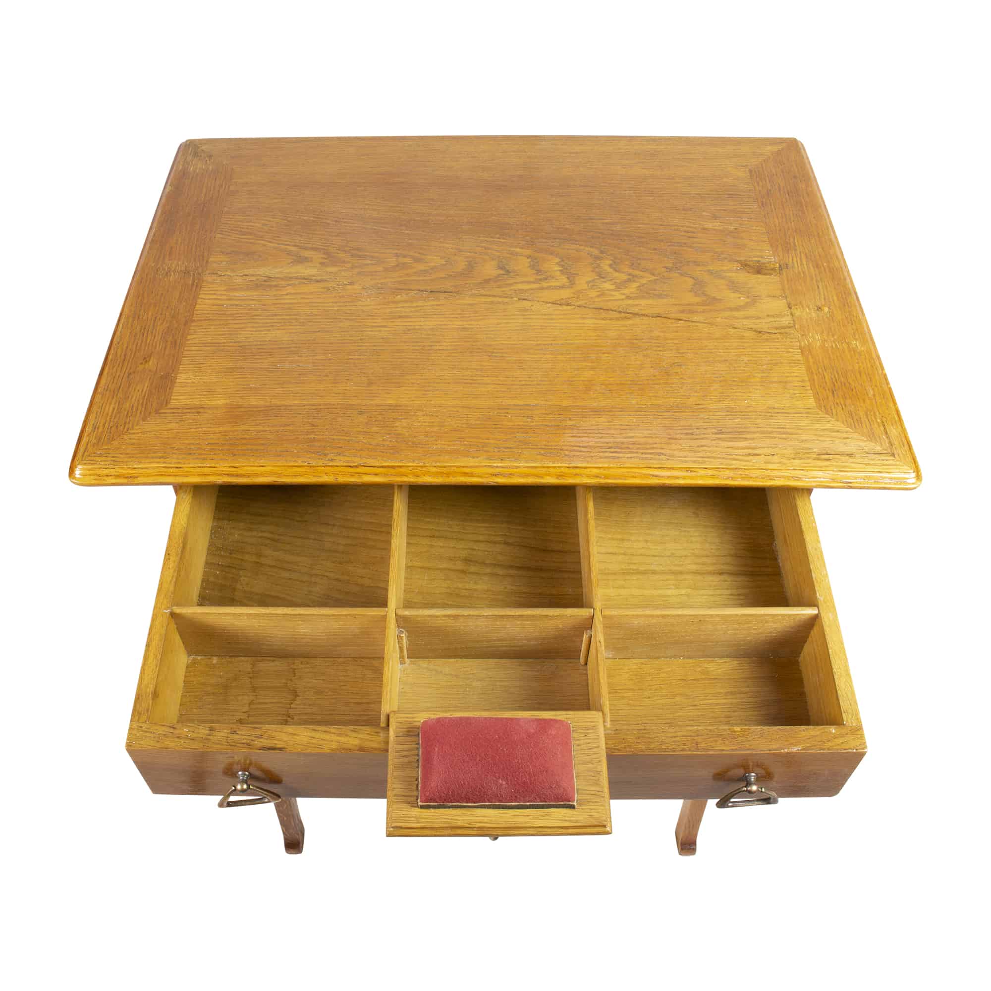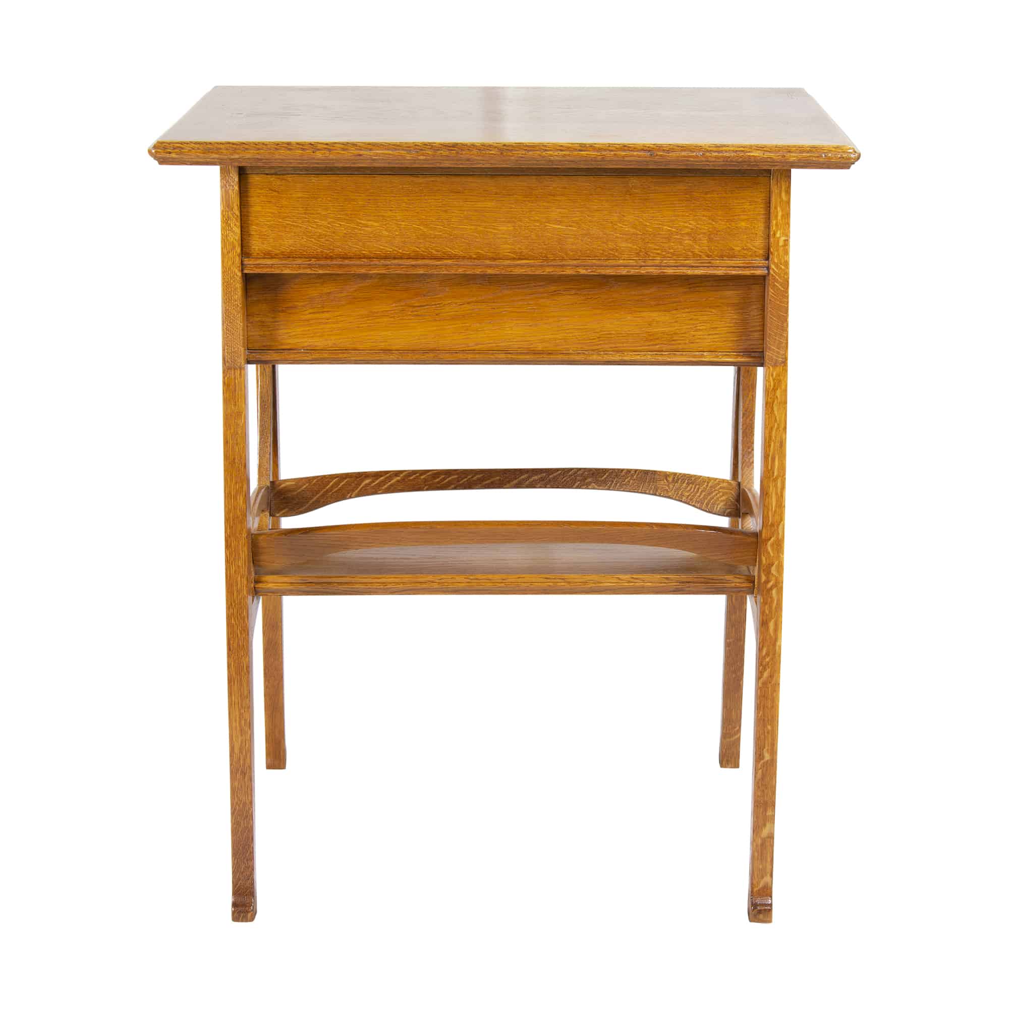 The beautiful antique Art Nouveau oakwood sewing or side table dates back to the time of Art Nouveau period, more specifically from the time, around 1905. The table has the typical Art Nouveau design features. The bottom drawer can be opened in both directions. In very good restored condition.