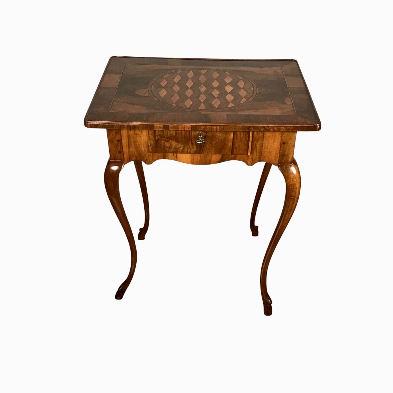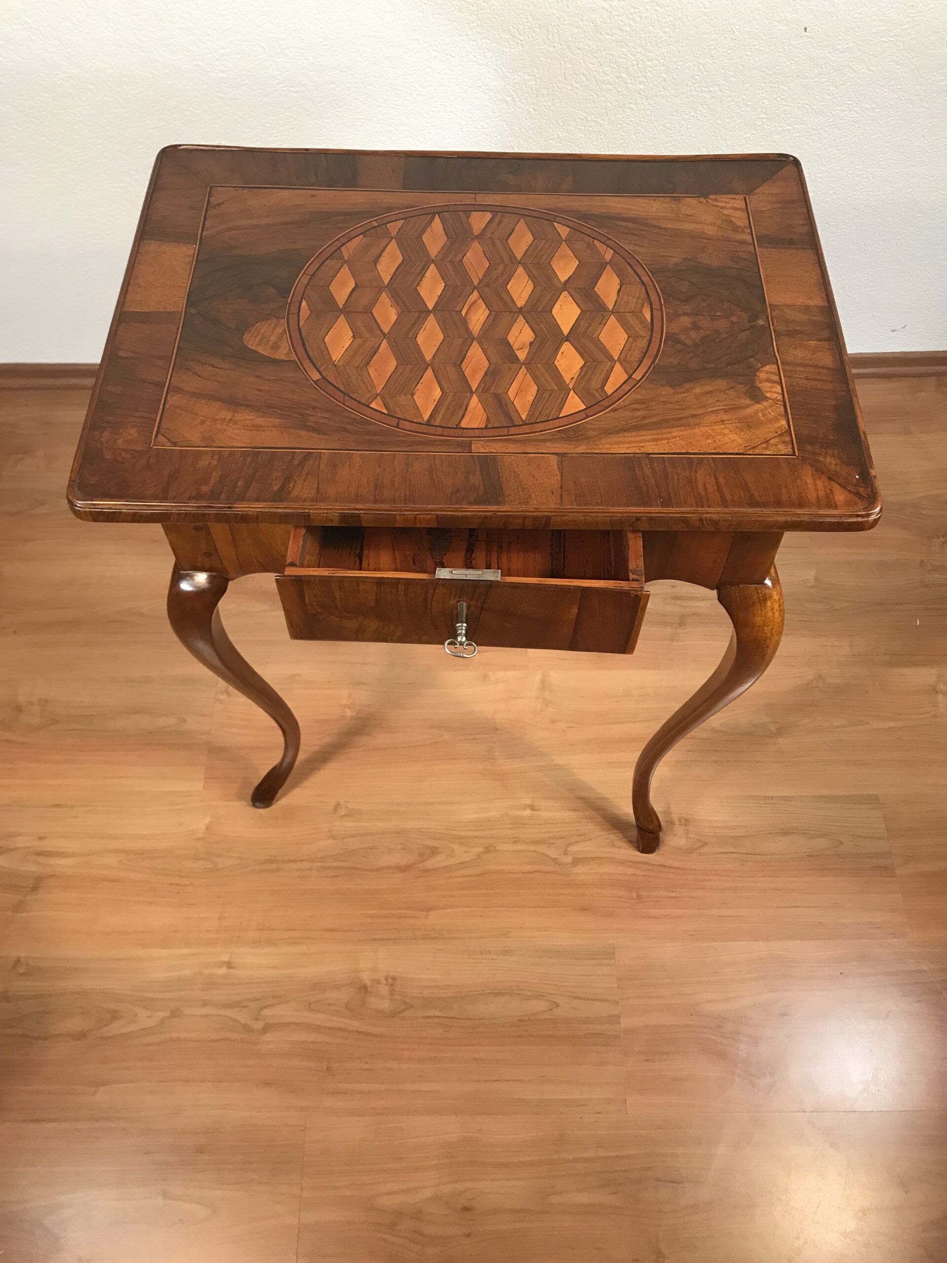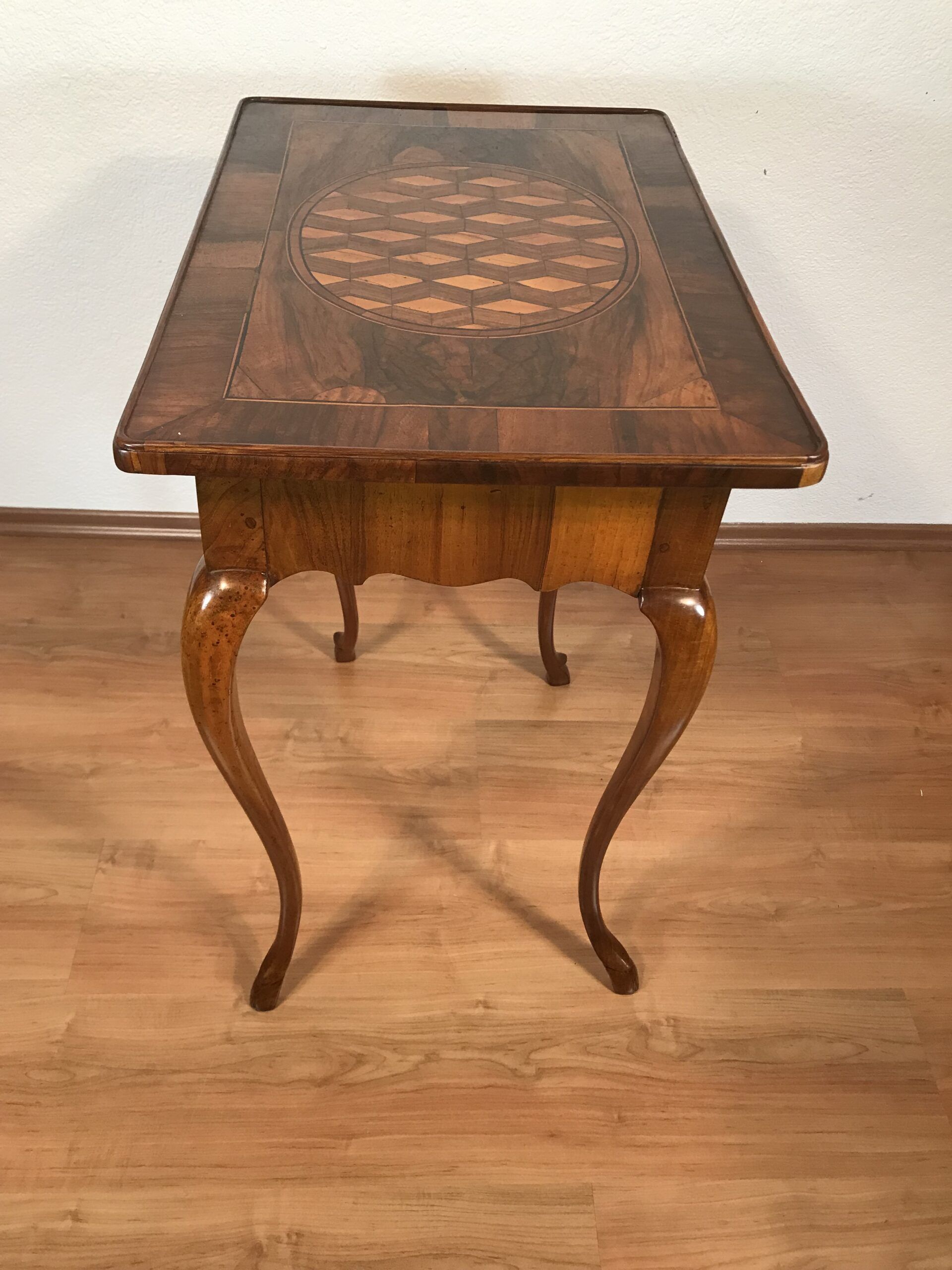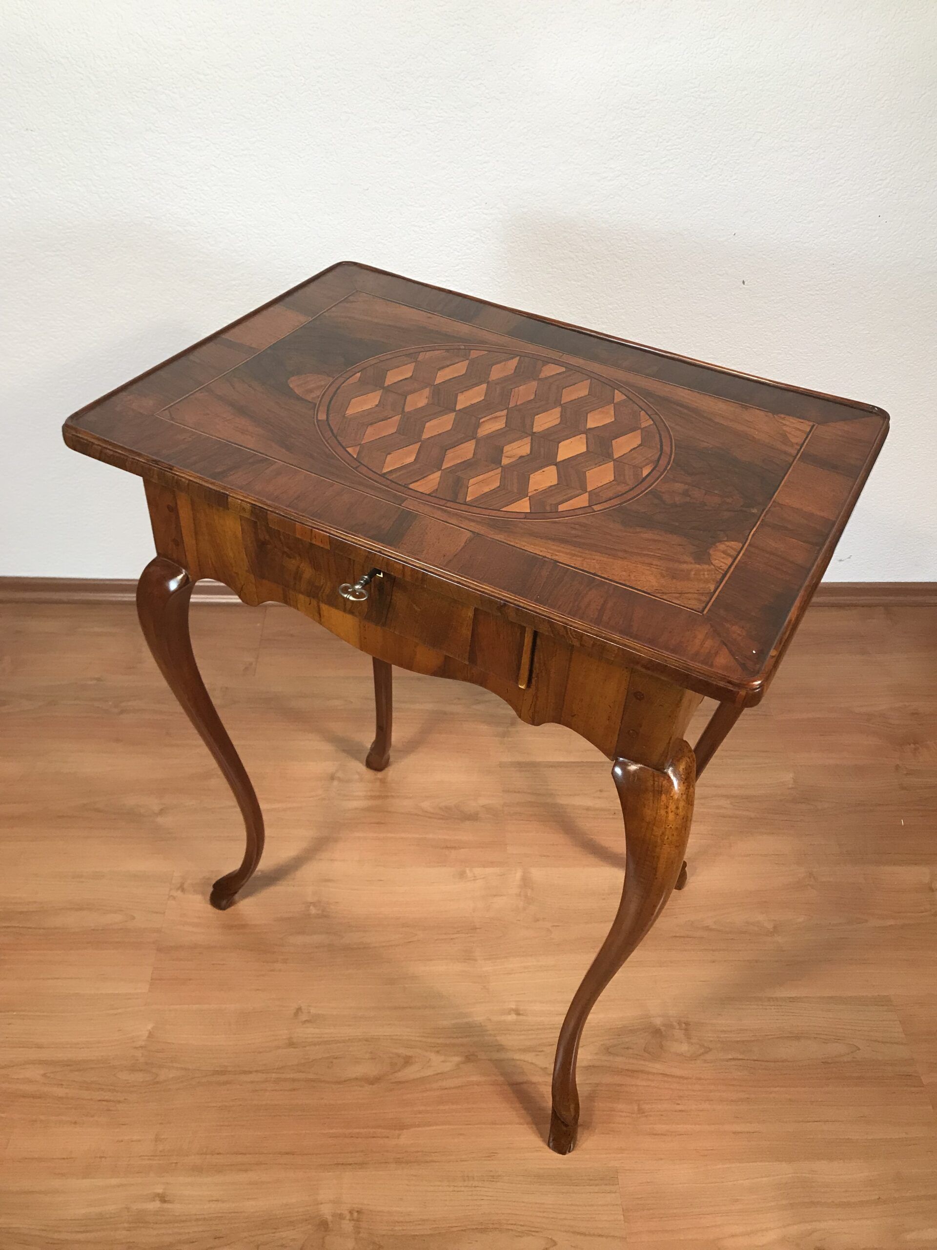 Exquisite German Baroque accent table from around 1750, crafted in rich walnut veneer. The rectangular top features intricate block marquetry inlay, showcasing the artistry of 18th-century cabinetmakers. Supported on four elegantly curved cabriole legs, the table includes a single drawer for functionality. Expertly refinished with a traditional French polish, this antique table combines refined craftsmanship with timeless elegance—perfect as a statement piece in both classic and modern interiors.
