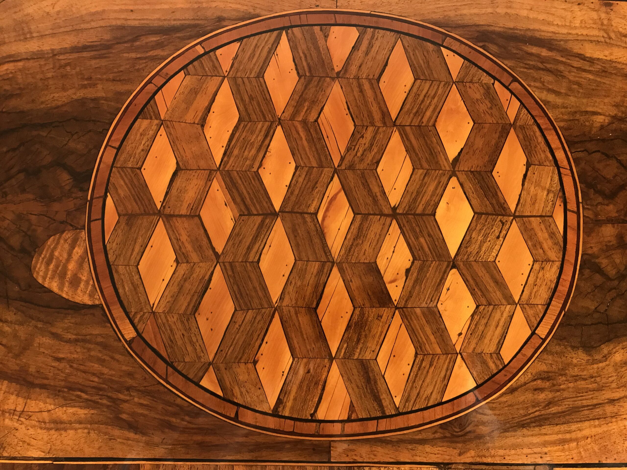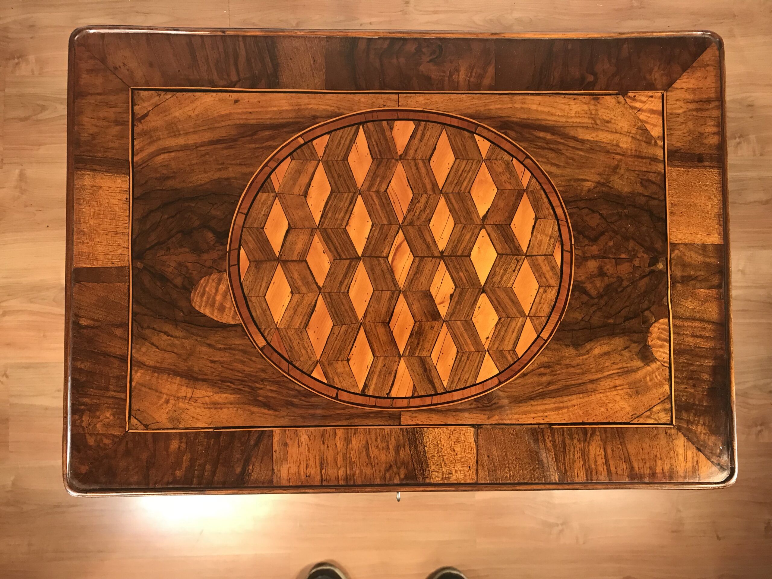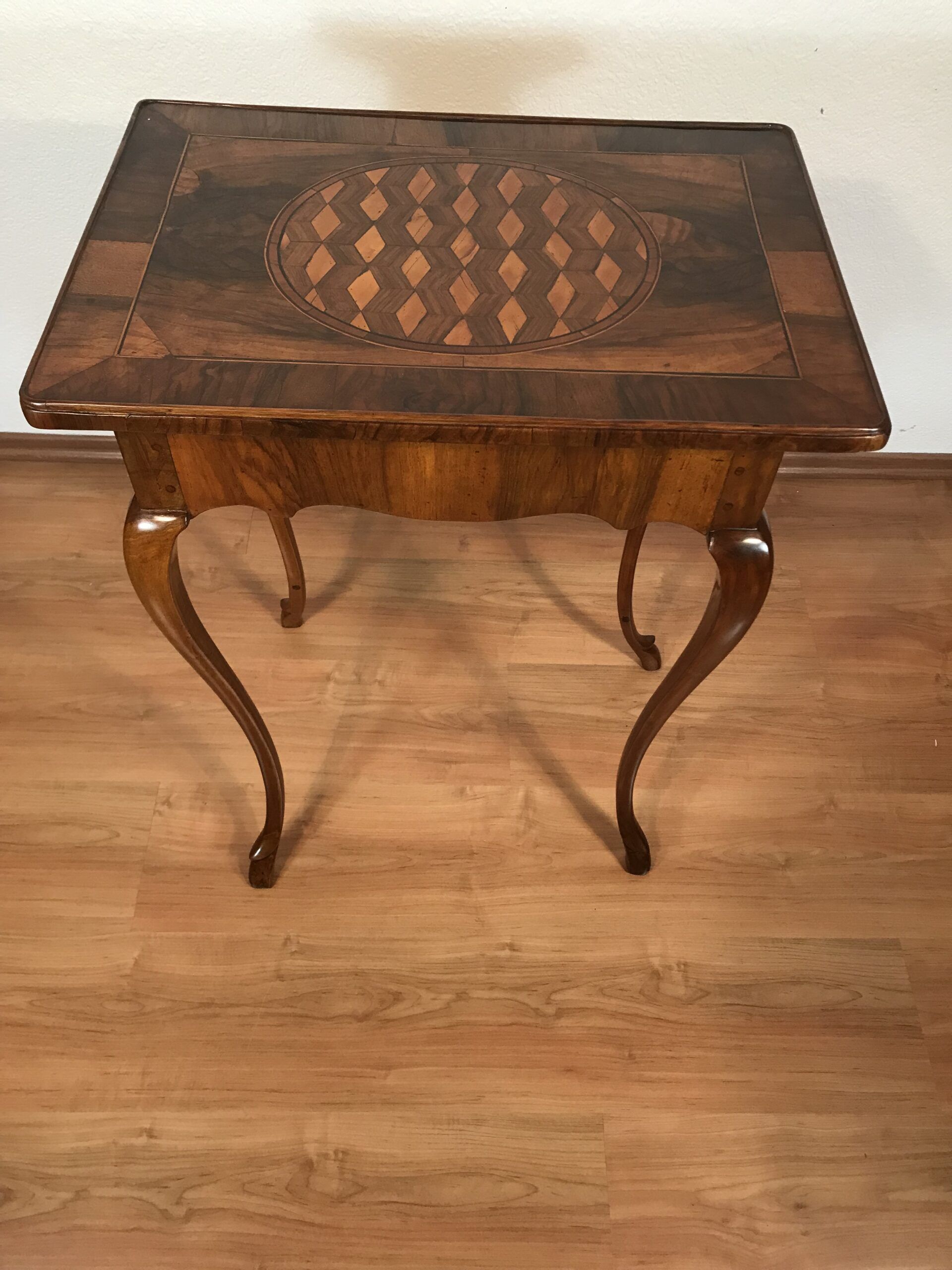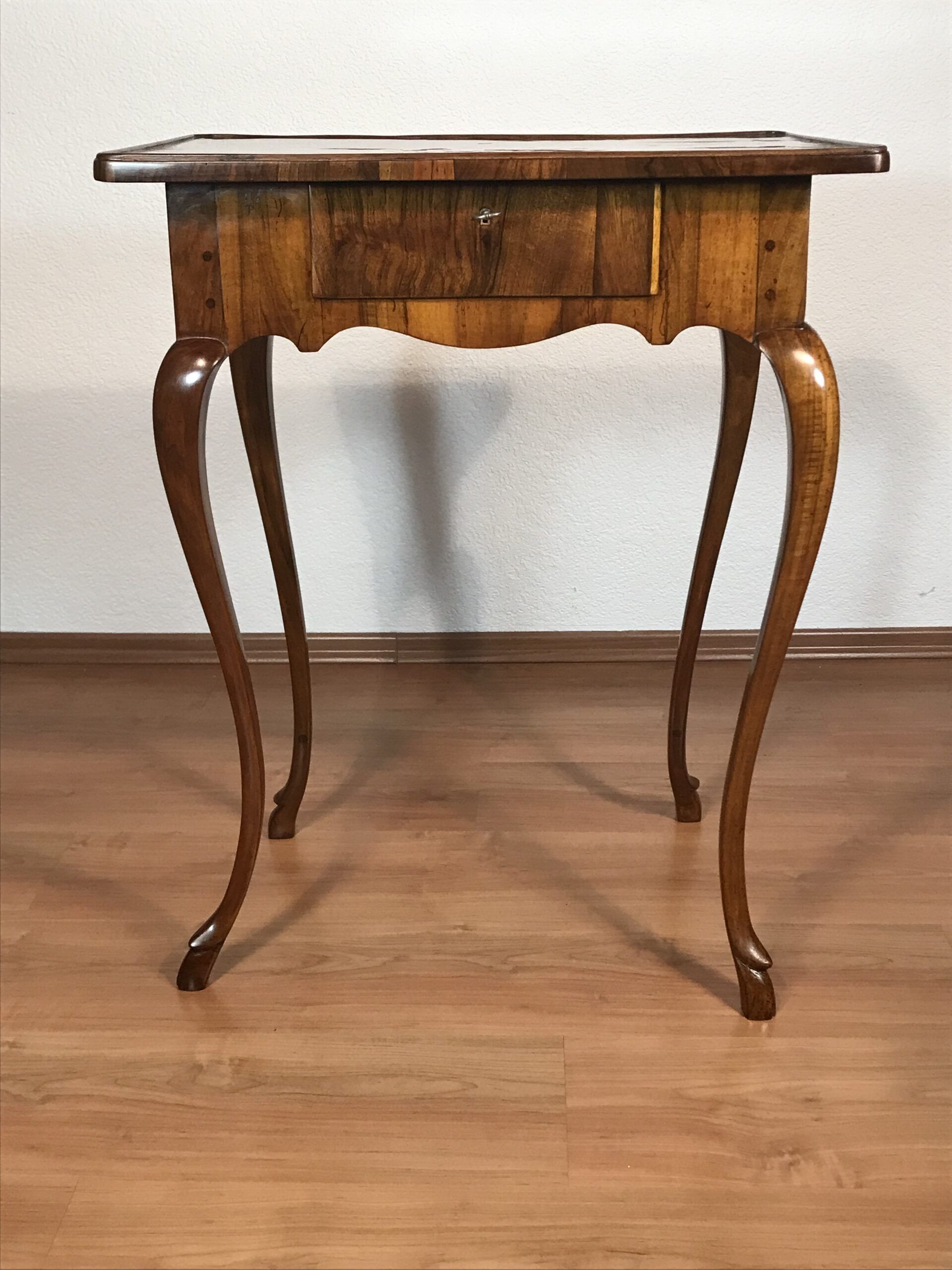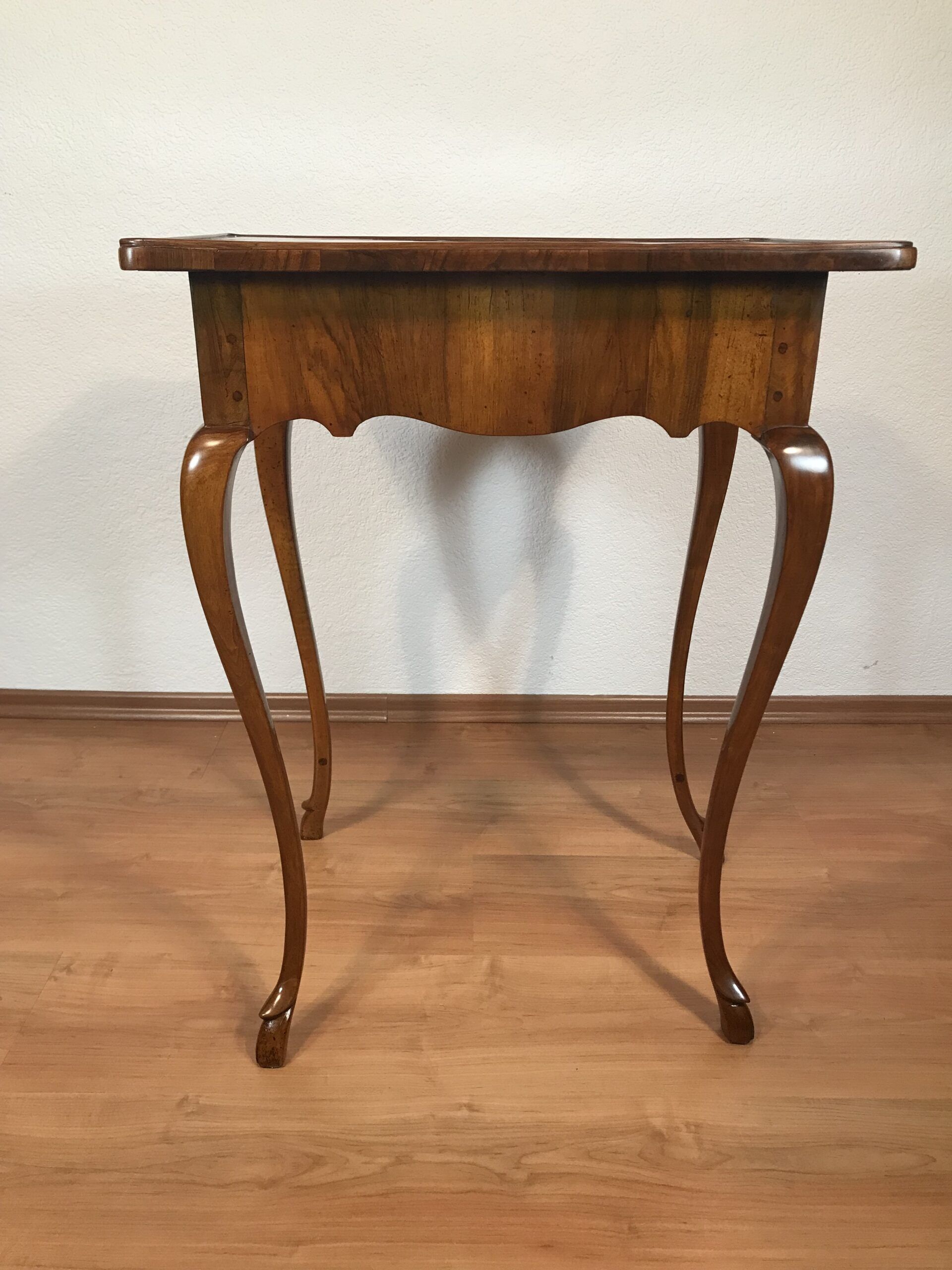 Exquisite German Baroque accent table from around 1750, crafted in rich walnut veneer. The rectangular top features intricate block marquetry inlay, showcasing the artistry of 18th-century cabinetmakers. Supported on four elegantly curved cabriole legs, the table includes a single drawer for functionality. Expertly refinished with a traditional French polish, this antique table combines refined craftsmanship with timeless elegance—perfect as a statement piece in both classic and modern interiors.