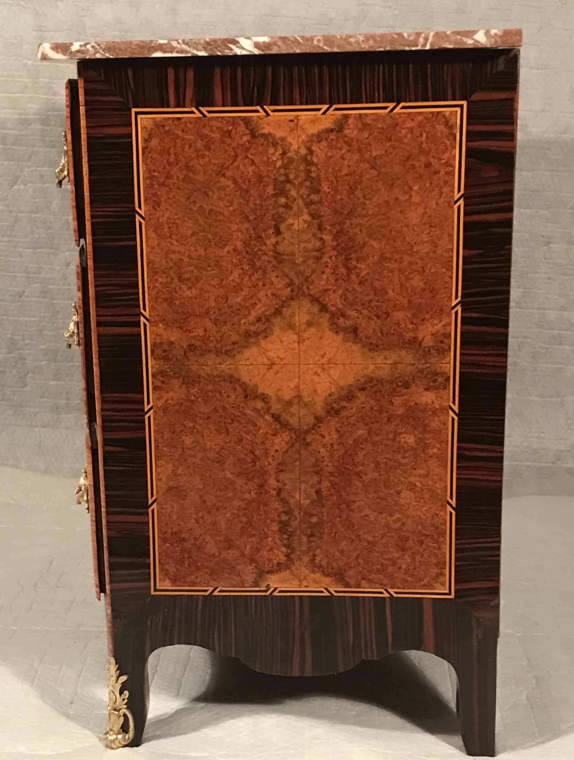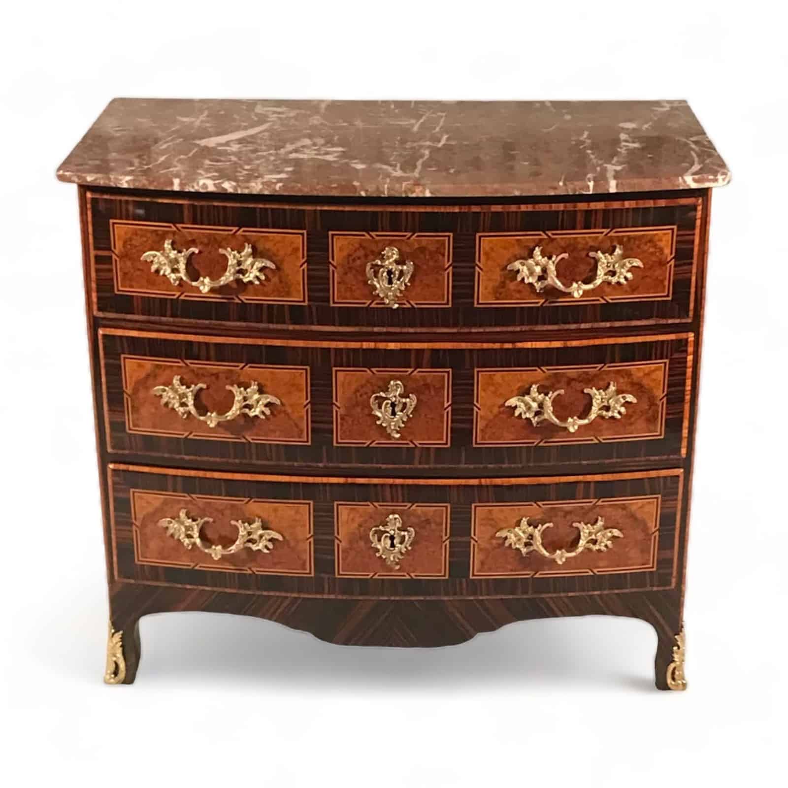 This unique Baroque chest of drawers was made in the 18th century in Switzerland. The three drawer commode has a pretty kingwood and maple root veneer with rosewood details on a pine wood frame. The Baroque chest comes with original bronze fittings. Additionally it has a brown-reddish marble top. This is an exquisite piece with a beautiful veneer pattern and pretty marquetry details.