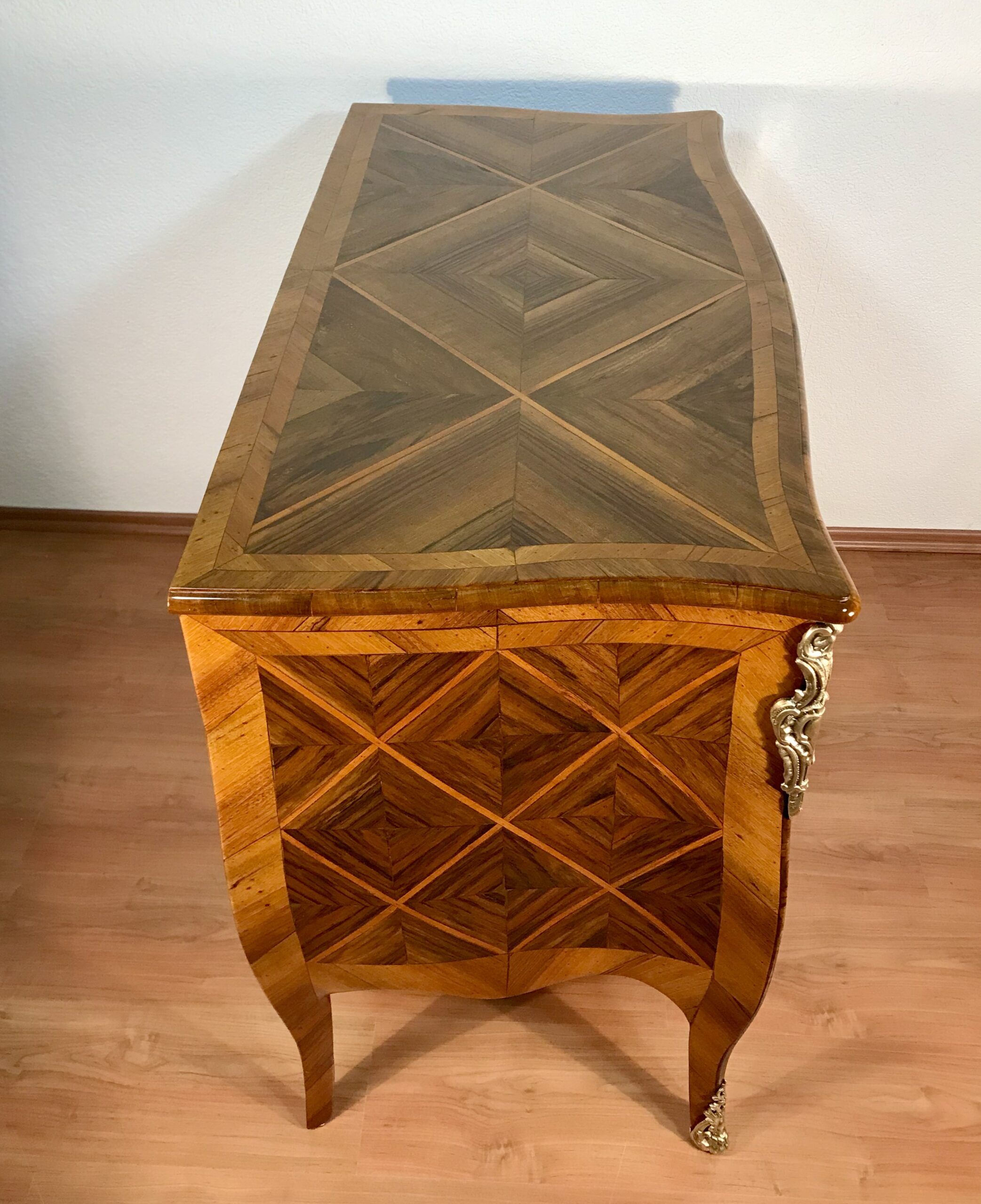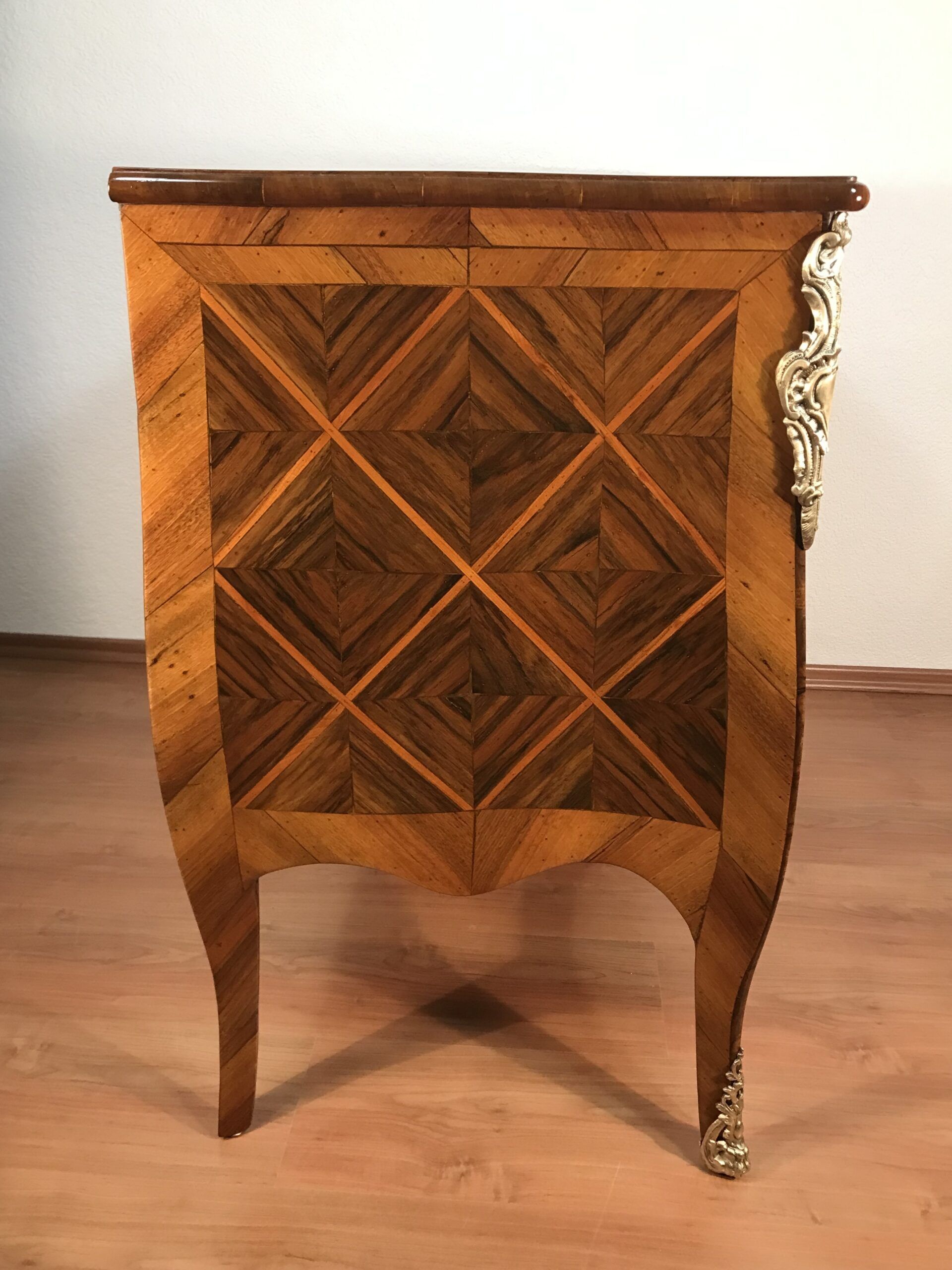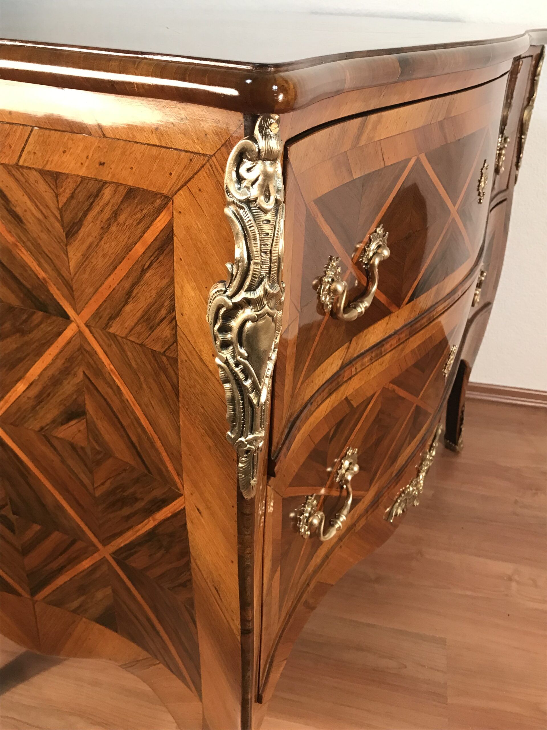 Discover a remarkable Baroque Chest of Drawers, originating in Switzerland. This exceptional chest of drawers hails from the years 1750-60 and boasts a rich history rooted in Switzerland. It is an exquisite two-drawer bombe commode, elegantly poised on gracefully curved slender legs. What truly sets this Baroque piece apart is its unique diamond-shaped walnut marquetry adorning the top, front, and sides. Remarkably, this chest of drawers retains its original bronze fittings and escutcheons, preserving its authentic charm. Incredibly, this antique remains in very good, untouched condition, offering a glimpse into the craftsmanship of a bygone era. This unique chest of drawers definitely shows the influence of the well know Swiss-German cabinetmaker Mathaeus Funk and of Johannes Aebersold, another well known Swiss furniture maker of the 18th century.