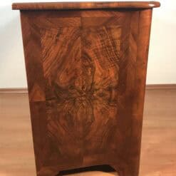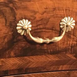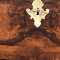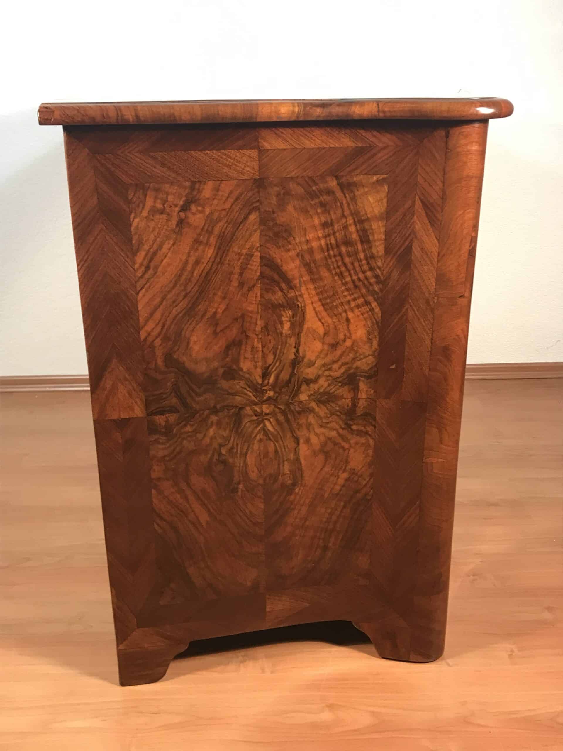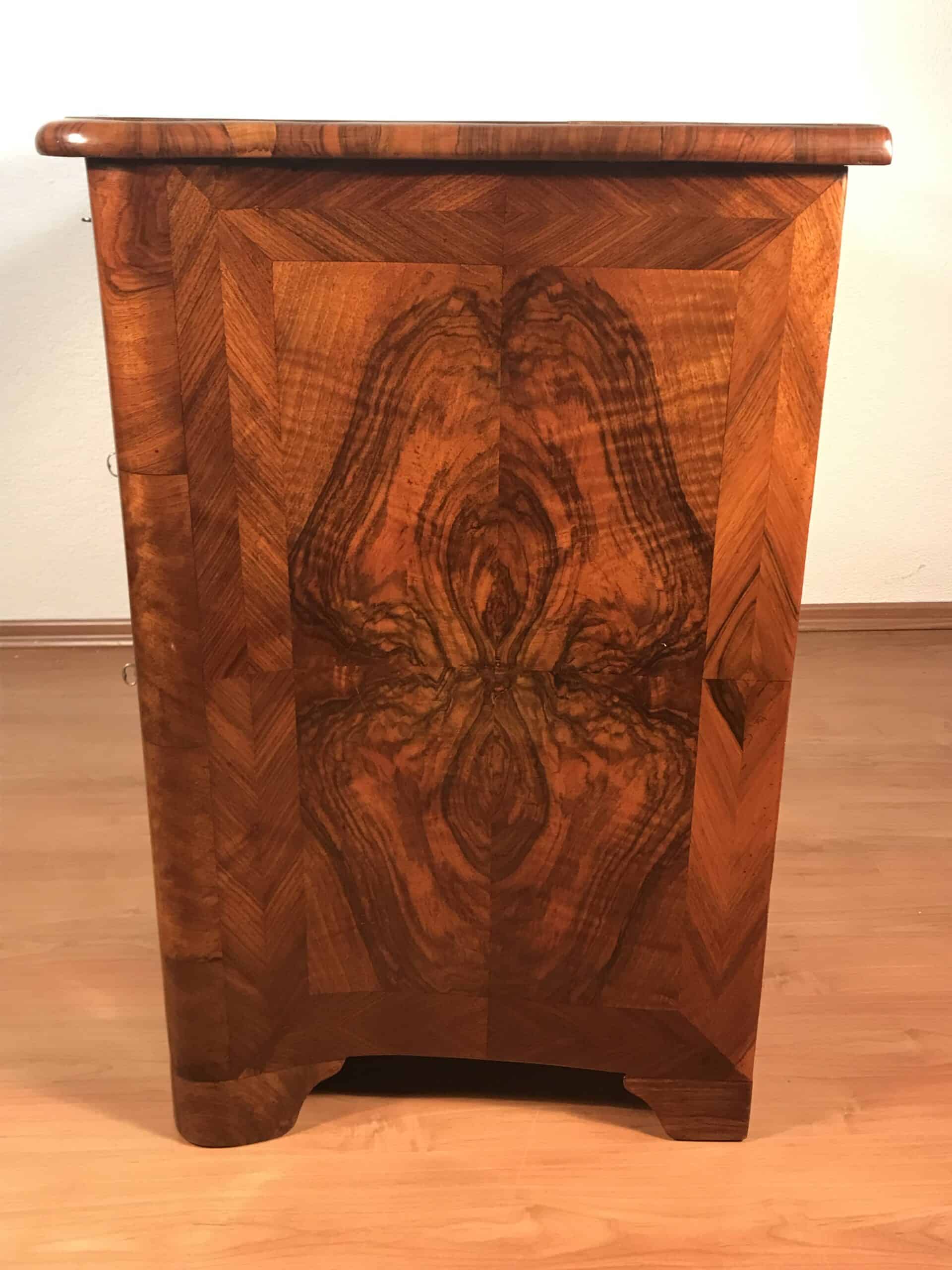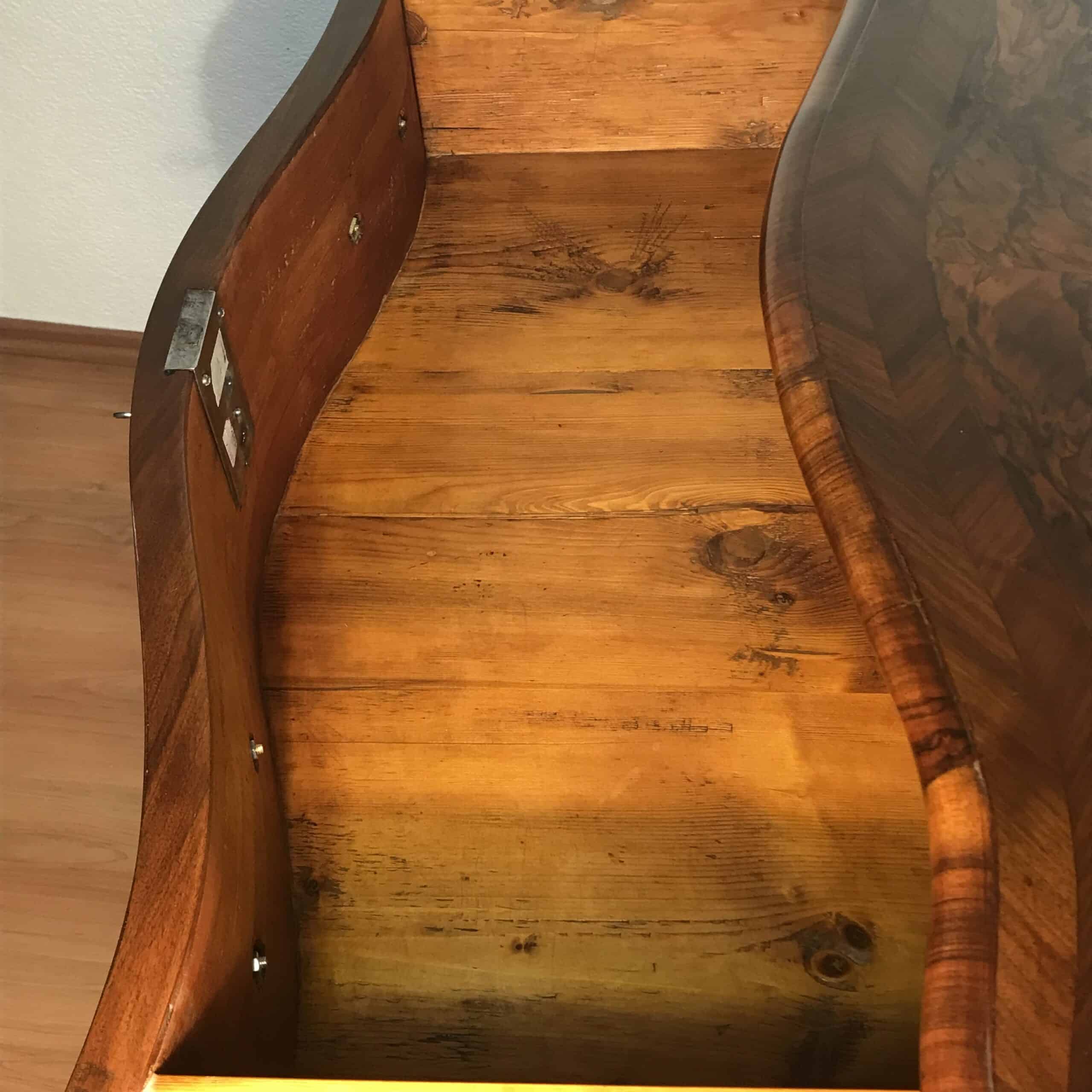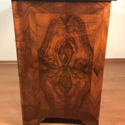 A striking book-matched veneer defines the front, creating a symmetrical wood grain pattern that enhances the visual depth and decorative appeal. The chest has been expertly refinished to revive the natural warmth and tonal richness of the wood while maintaining its historical authenticity.