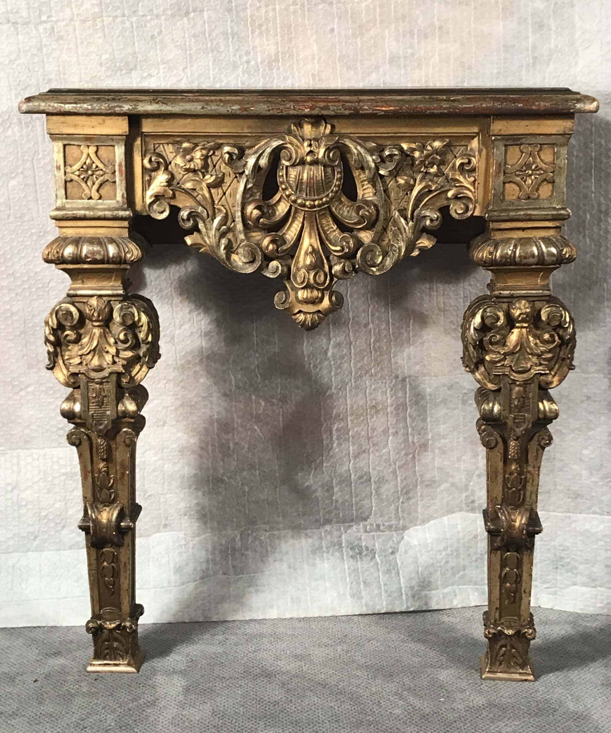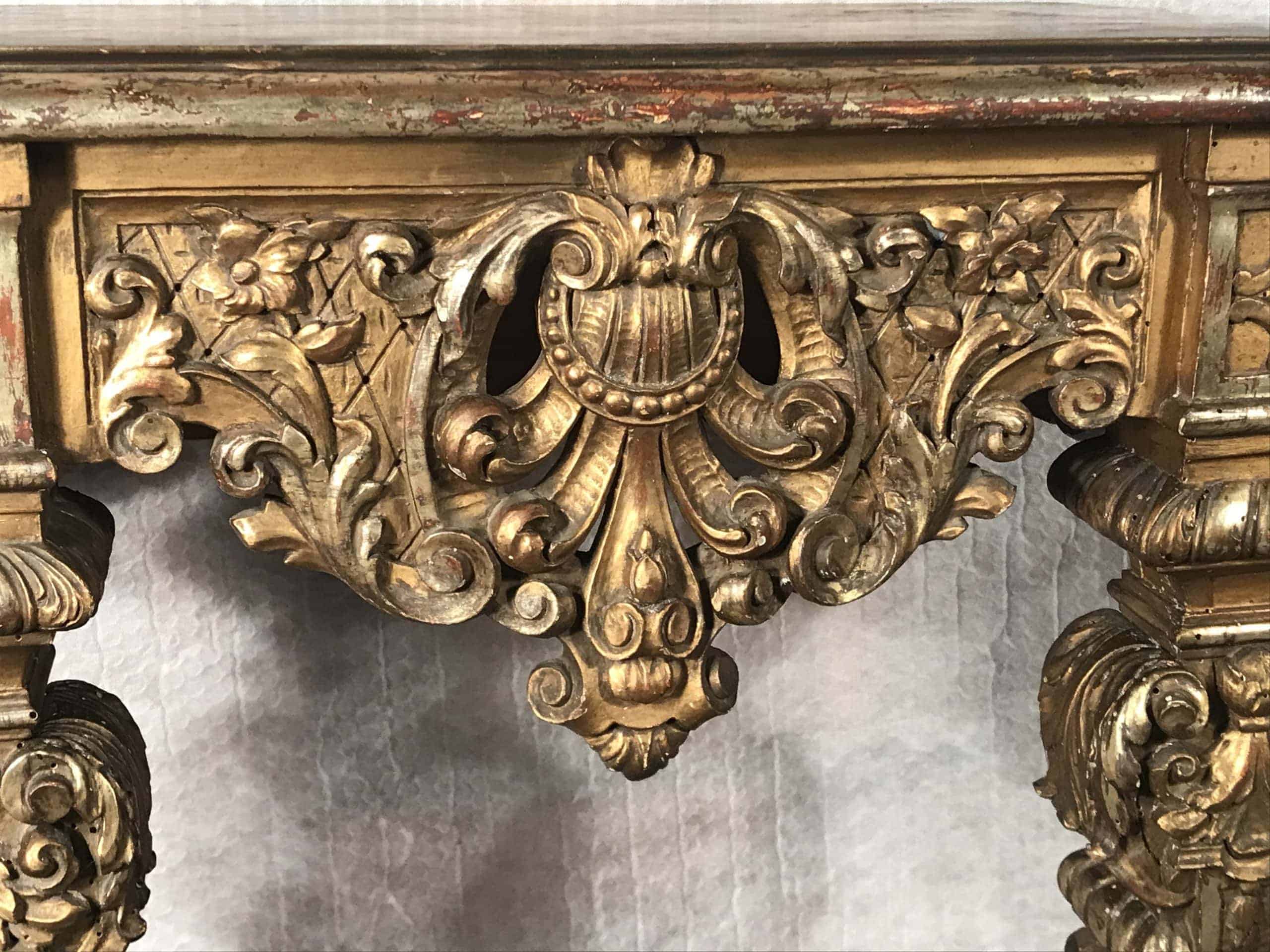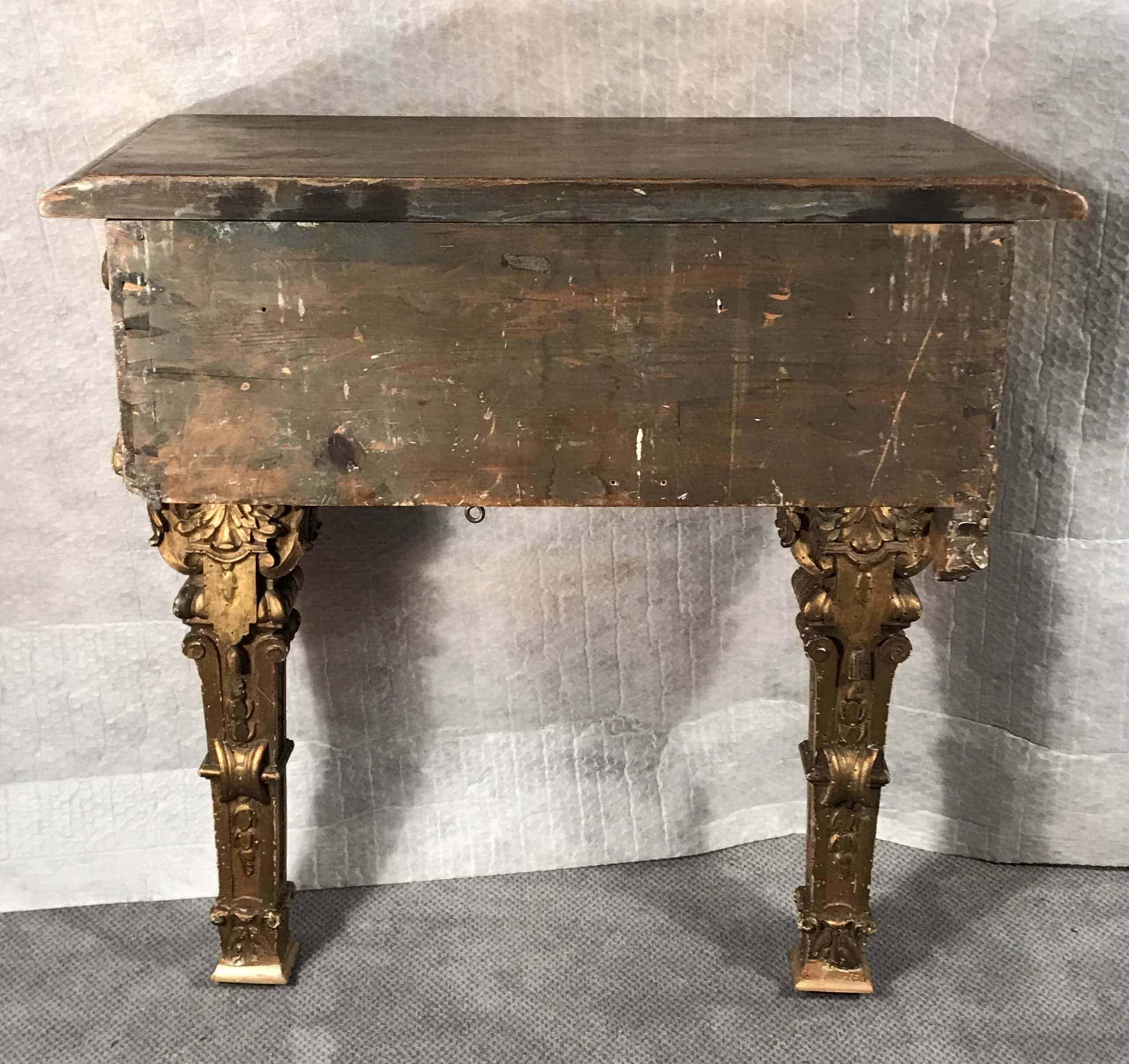The baroque console table comes in original condition with the expected wear and tear and some retouches from earlier restorations. It measures H 29.53 x W 25.99 x D 13.78 inches (H 75 cm x W 66 cm x D 35 cm).Â