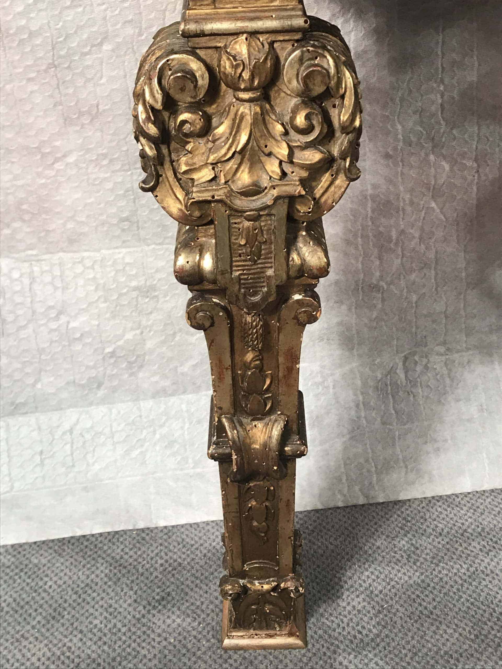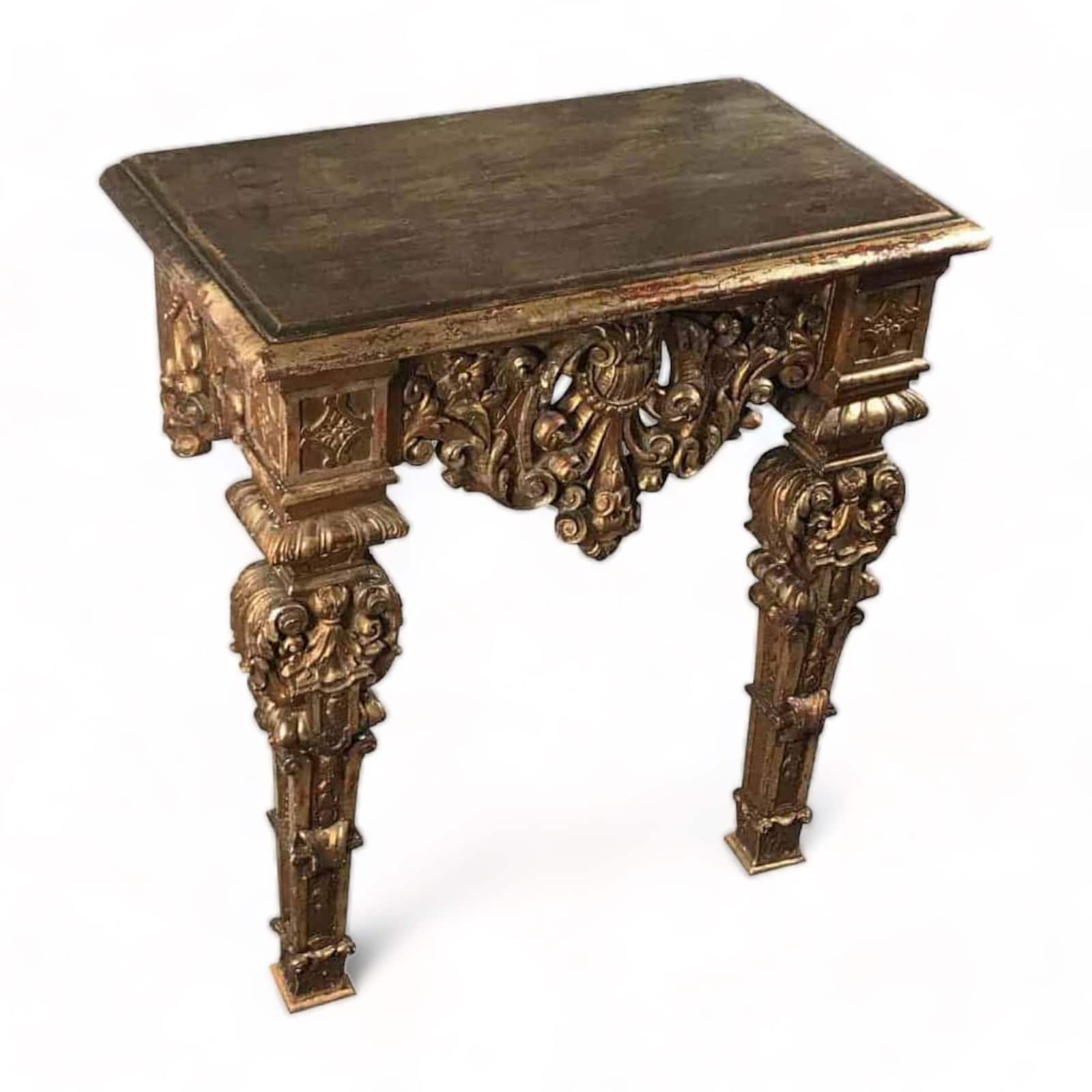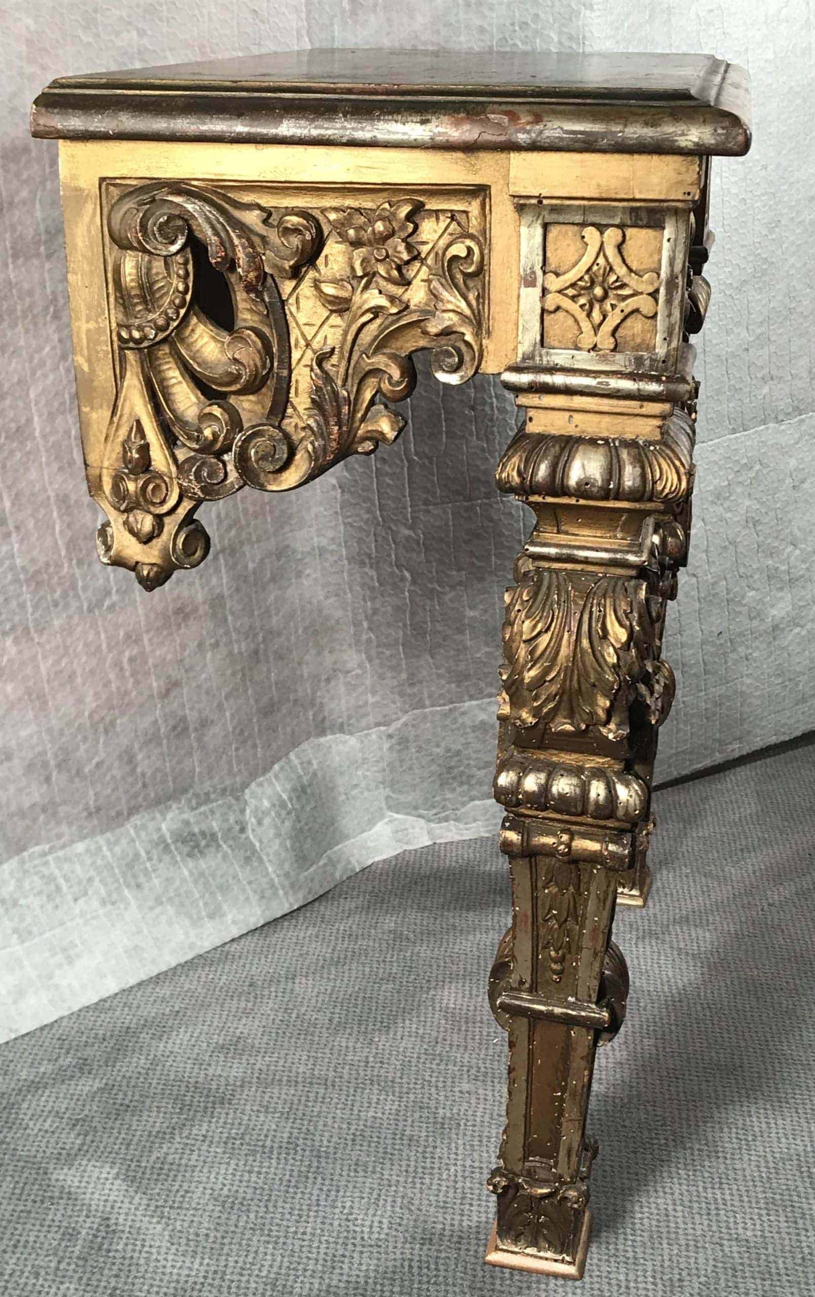 The baroque console table comes in original condition with the expected wear and tear and some retouches from earlier restorations. It measures H 29.53 x W 25.99 x D 13.78 inches (H 75 cm x W 66 cm x D 35 cm).Â