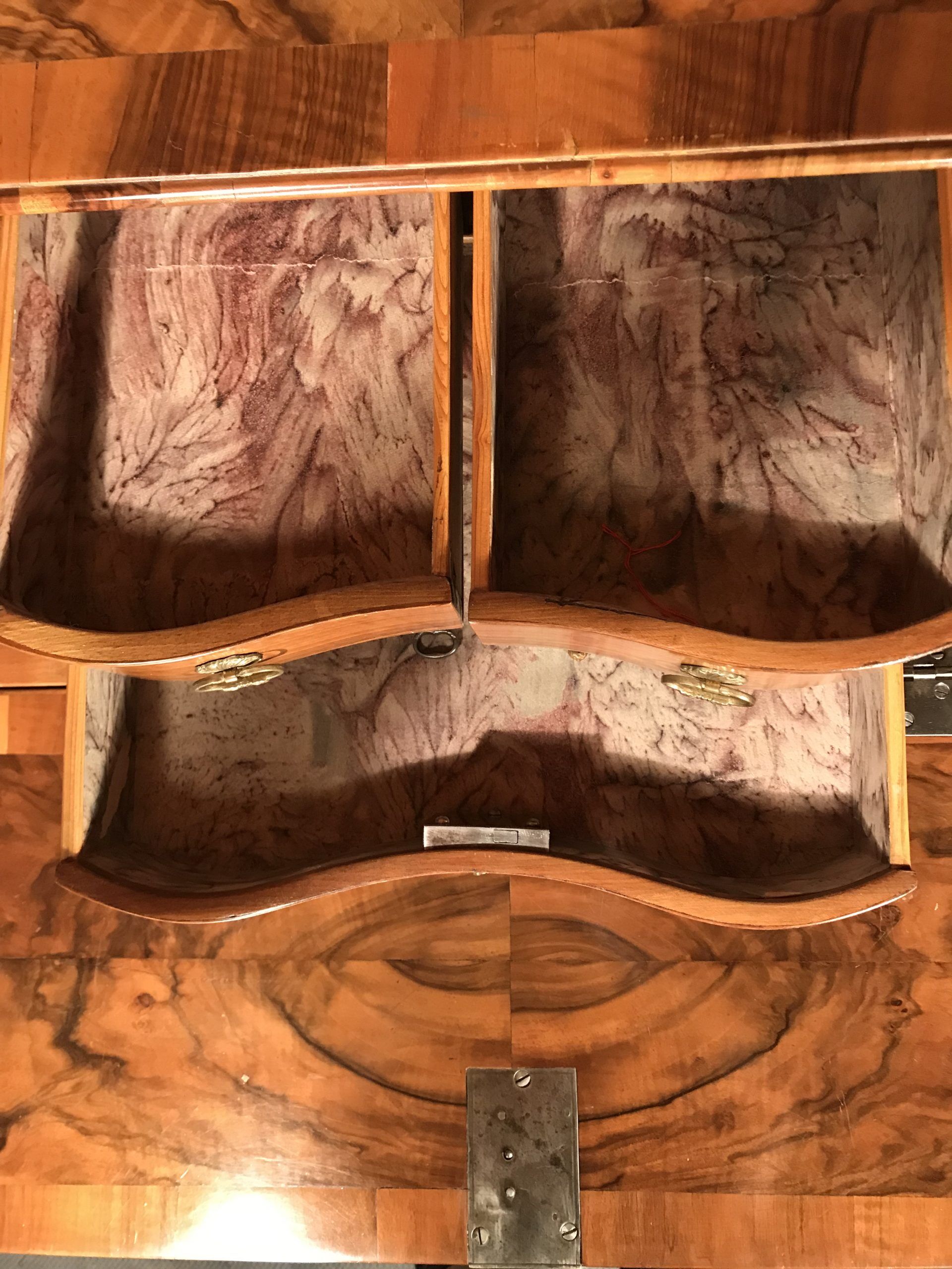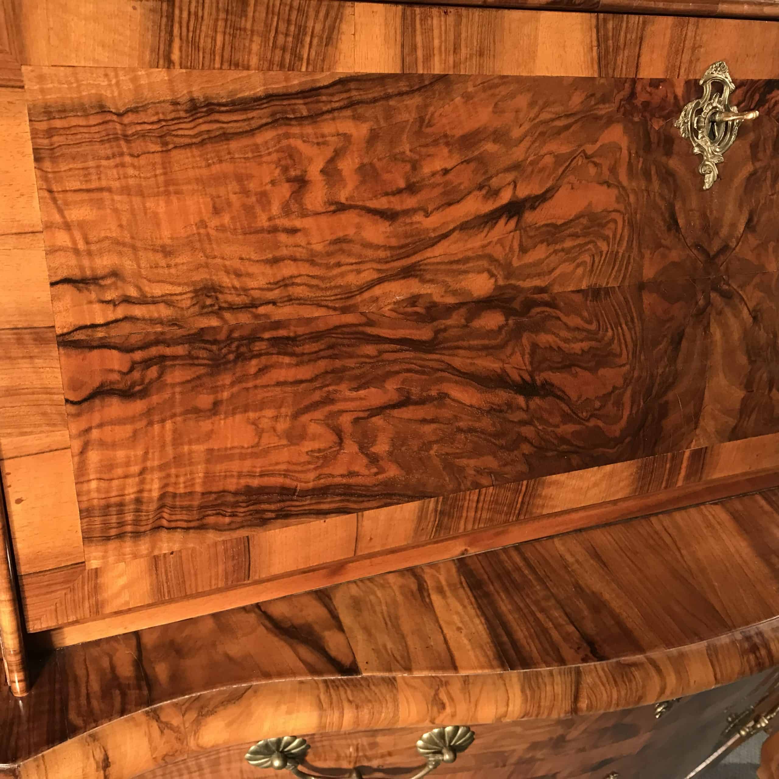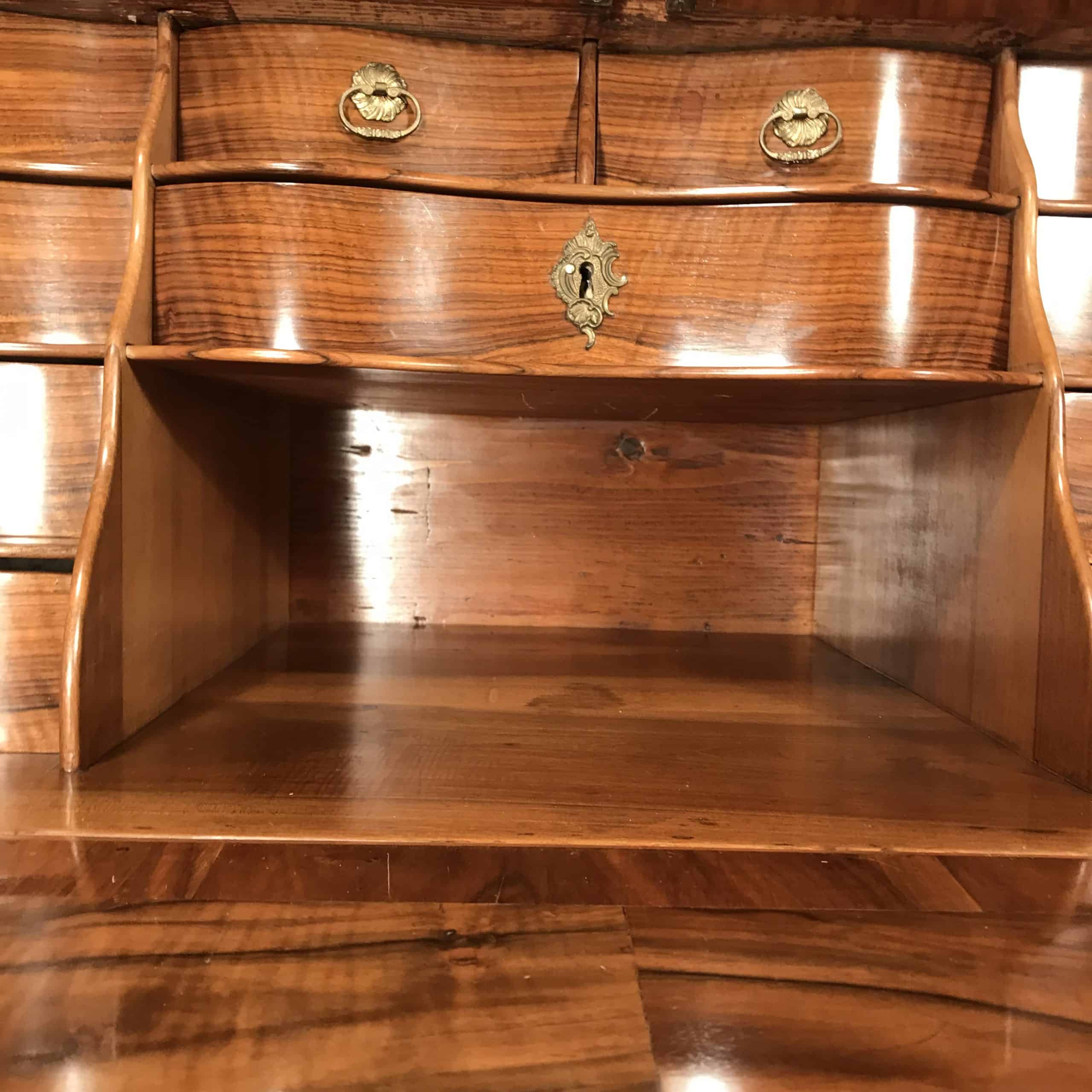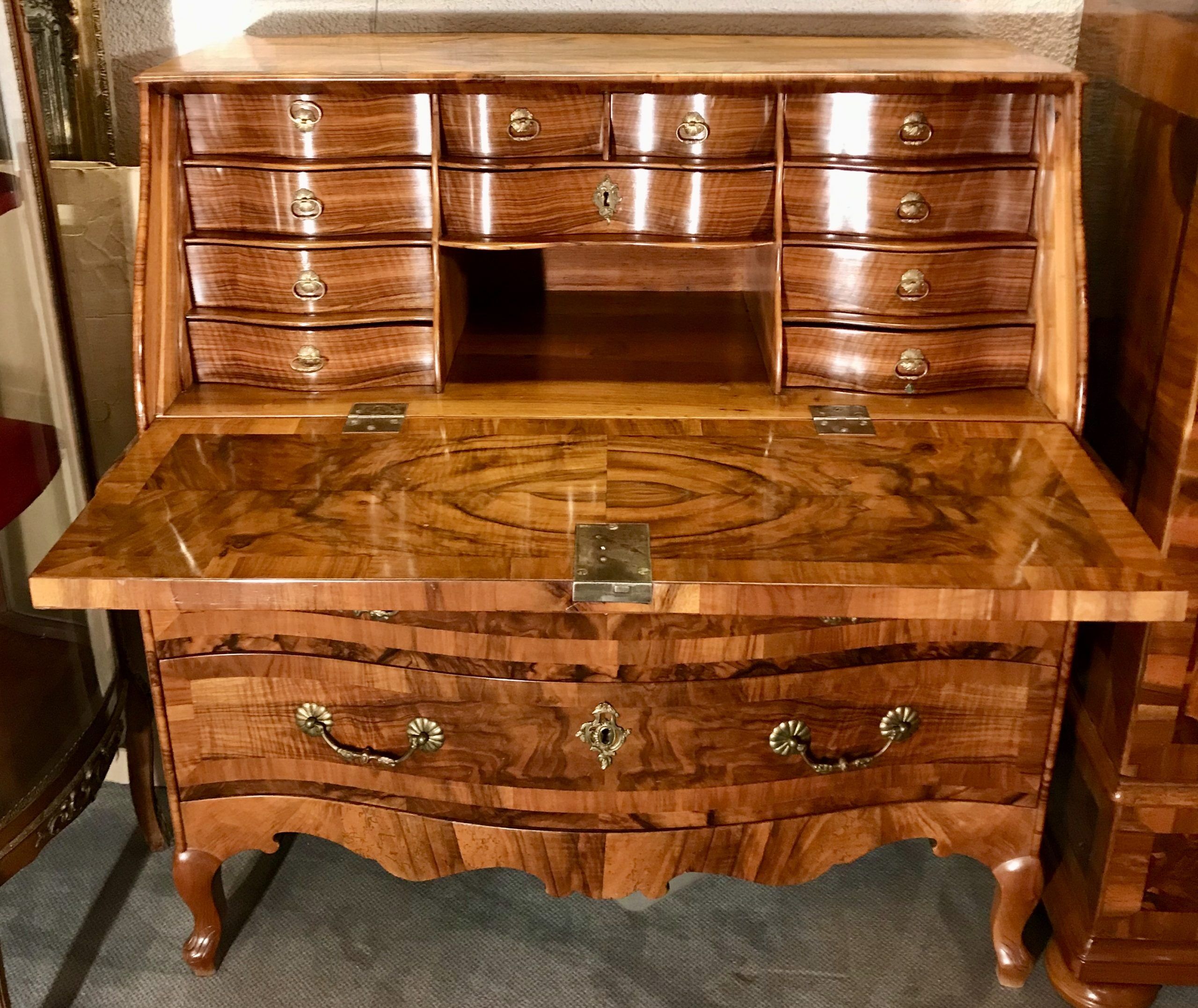 Exquisite 18th century Baroque secretary, Bern (Switzerland) 1750, attributed to Mathaeus Funk (cabinetmaker 1697-1783). The secretary has a rectangular body with two drawers and a slightly convex front. Furthermore, it has a foldable desk with eleven drawers and one compartment. The fittings and the 18th century paste paper on the inside of the drawers are original.