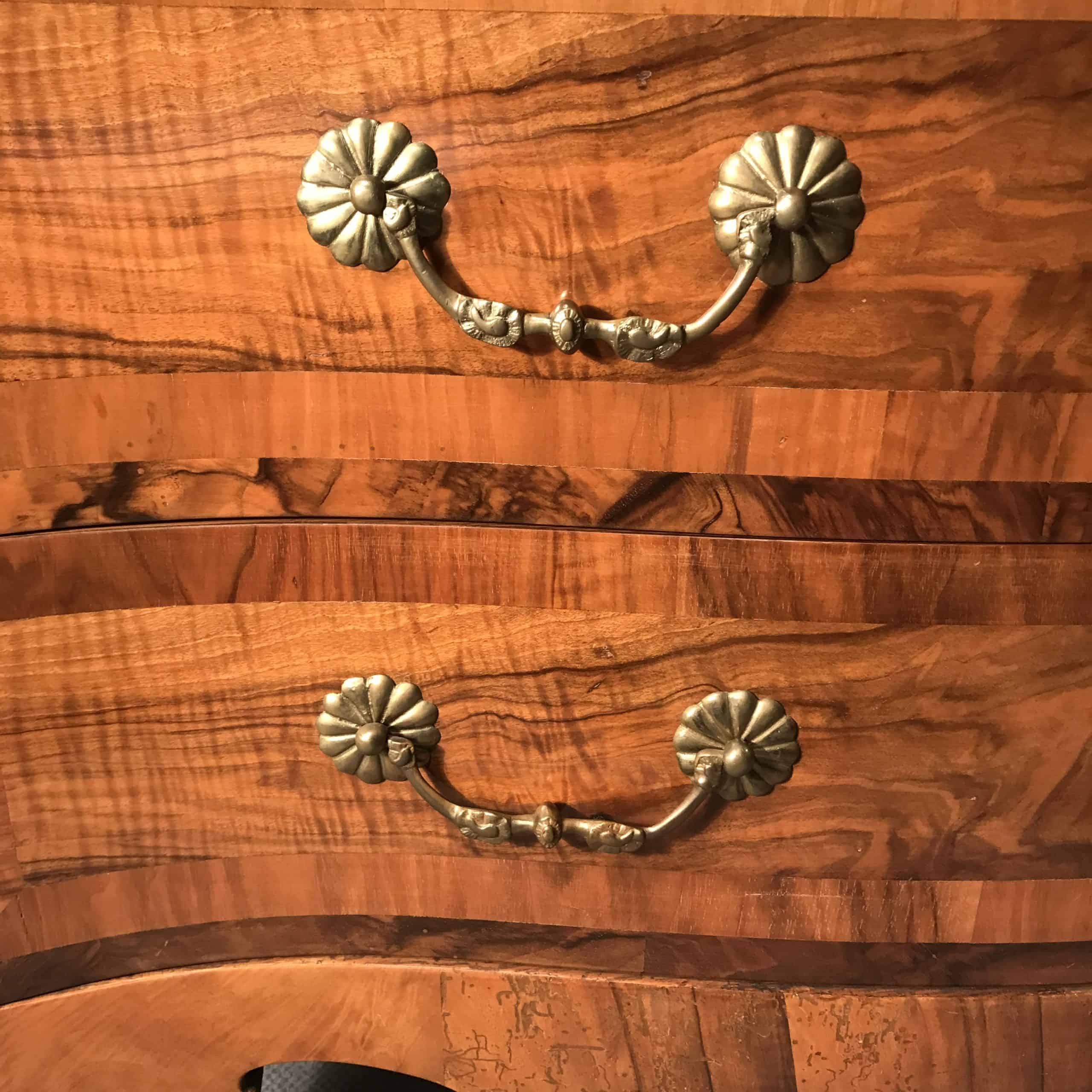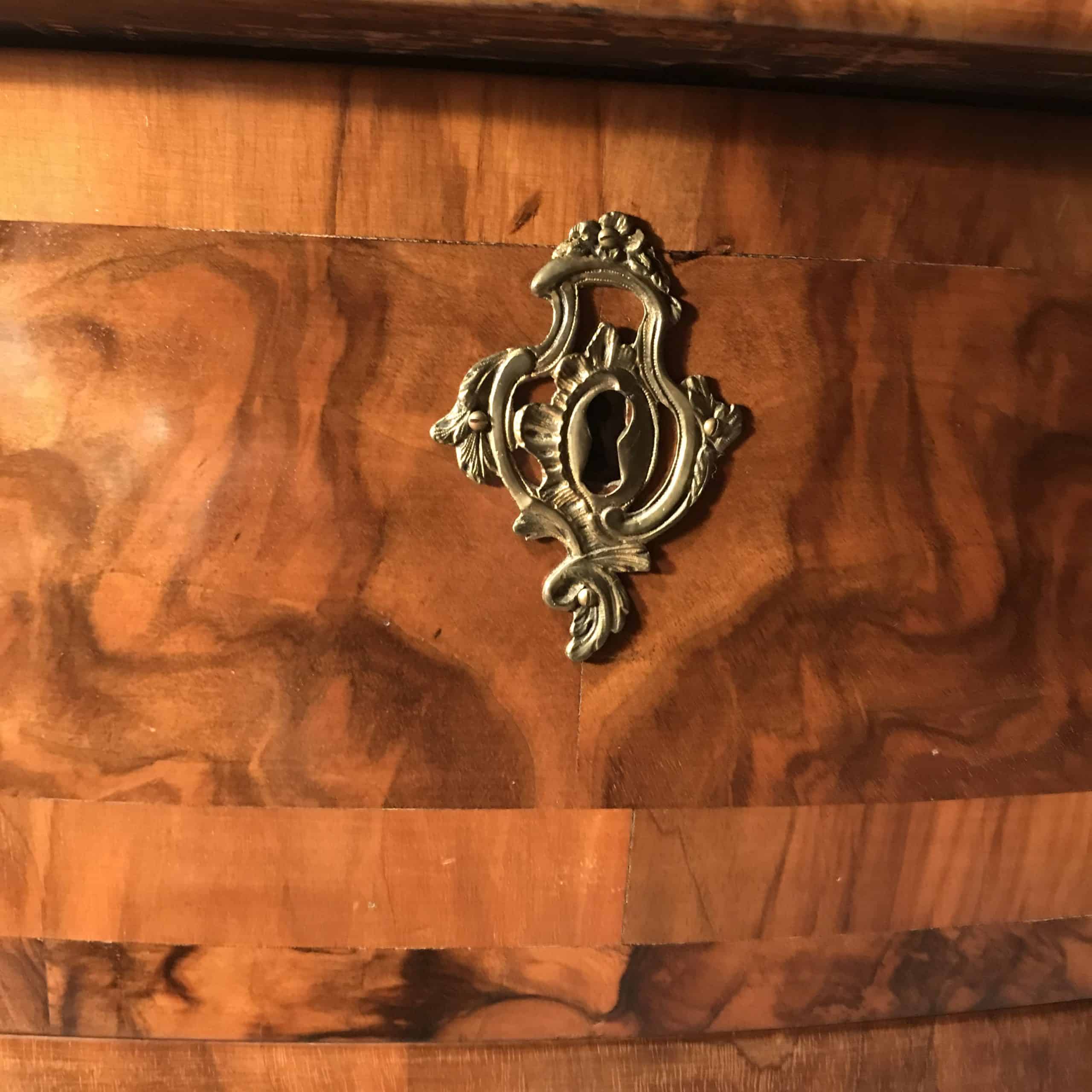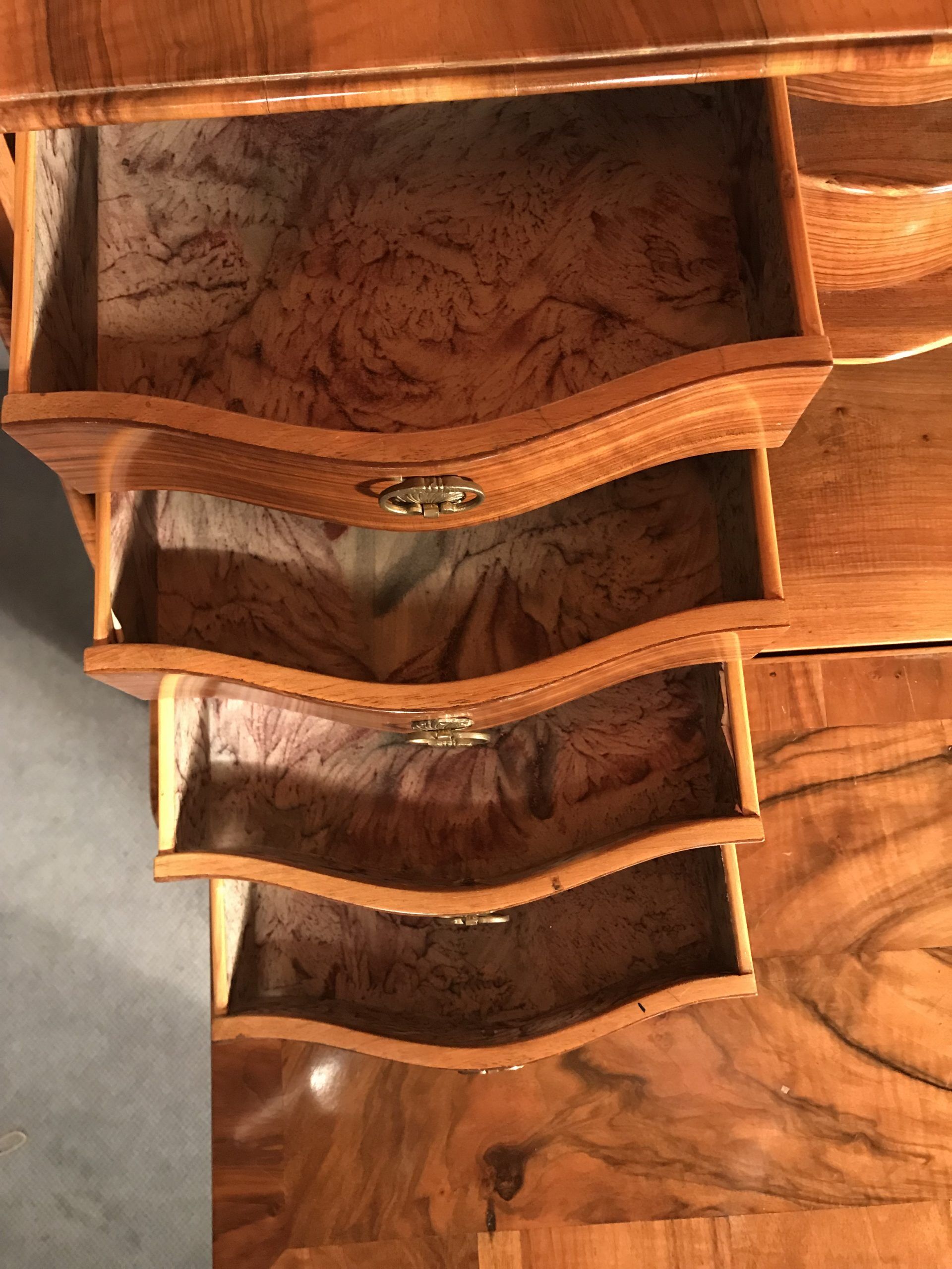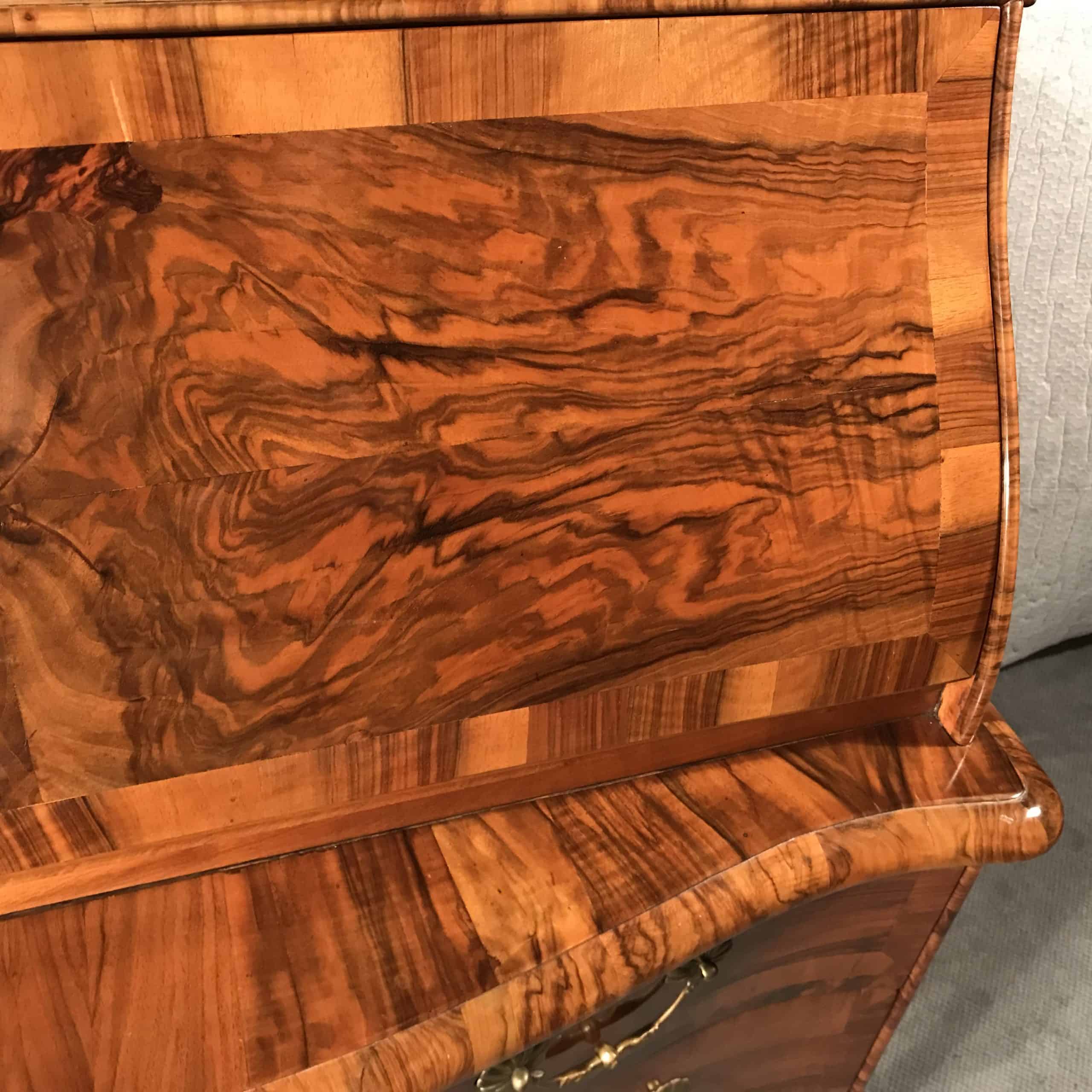 Exquisite 18th century Baroque secretary, Bern (Switzerland) 1750, attributed to Mathaeus Funk (cabinetmaker 1697-1783). The secretary has a rectangular body with two drawers and a slightly convex front. Furthermore, it has a foldable desk with eleven drawers and one compartment. The fittings and the 18th century paste paper on the inside of the drawers are original.