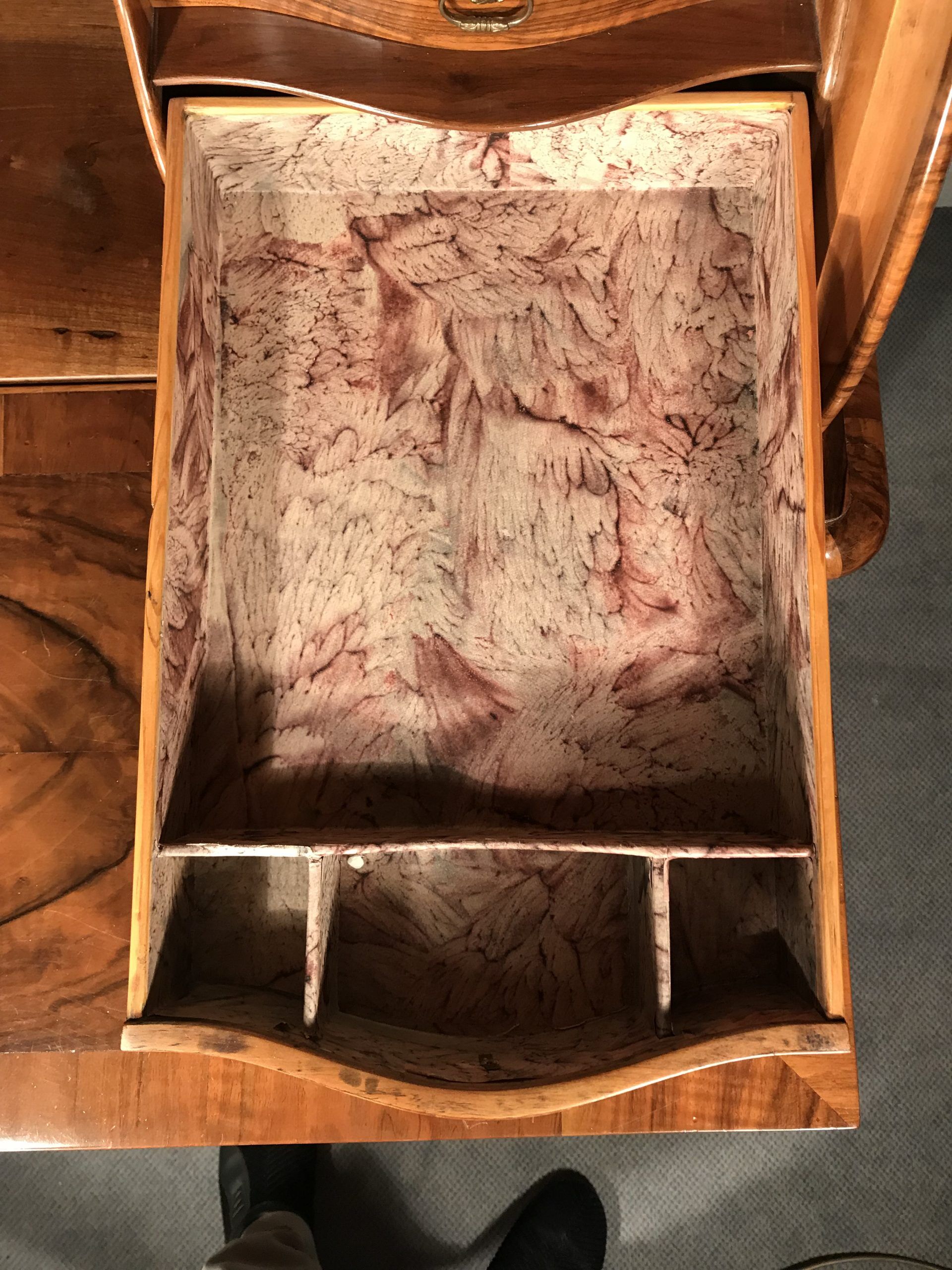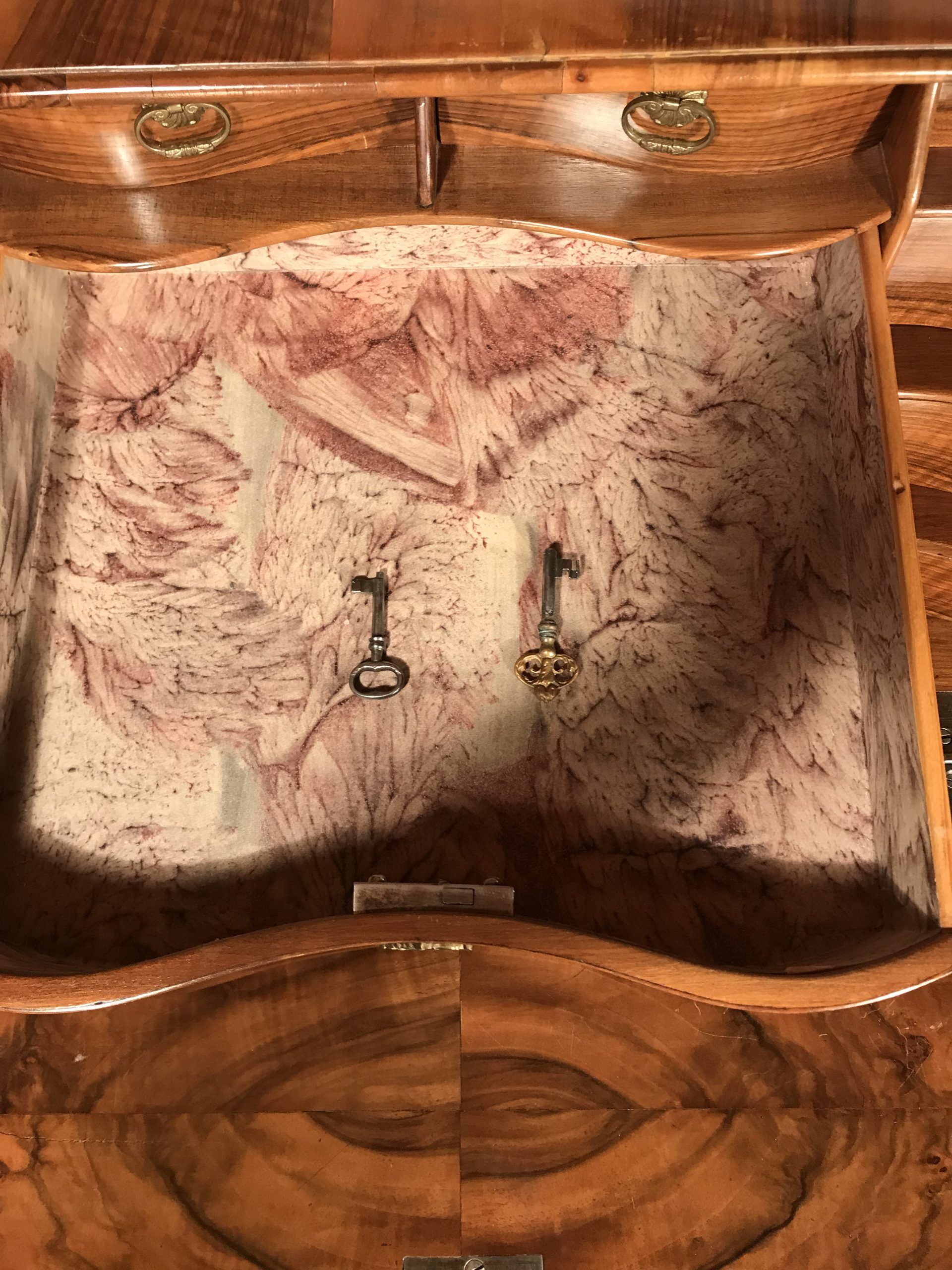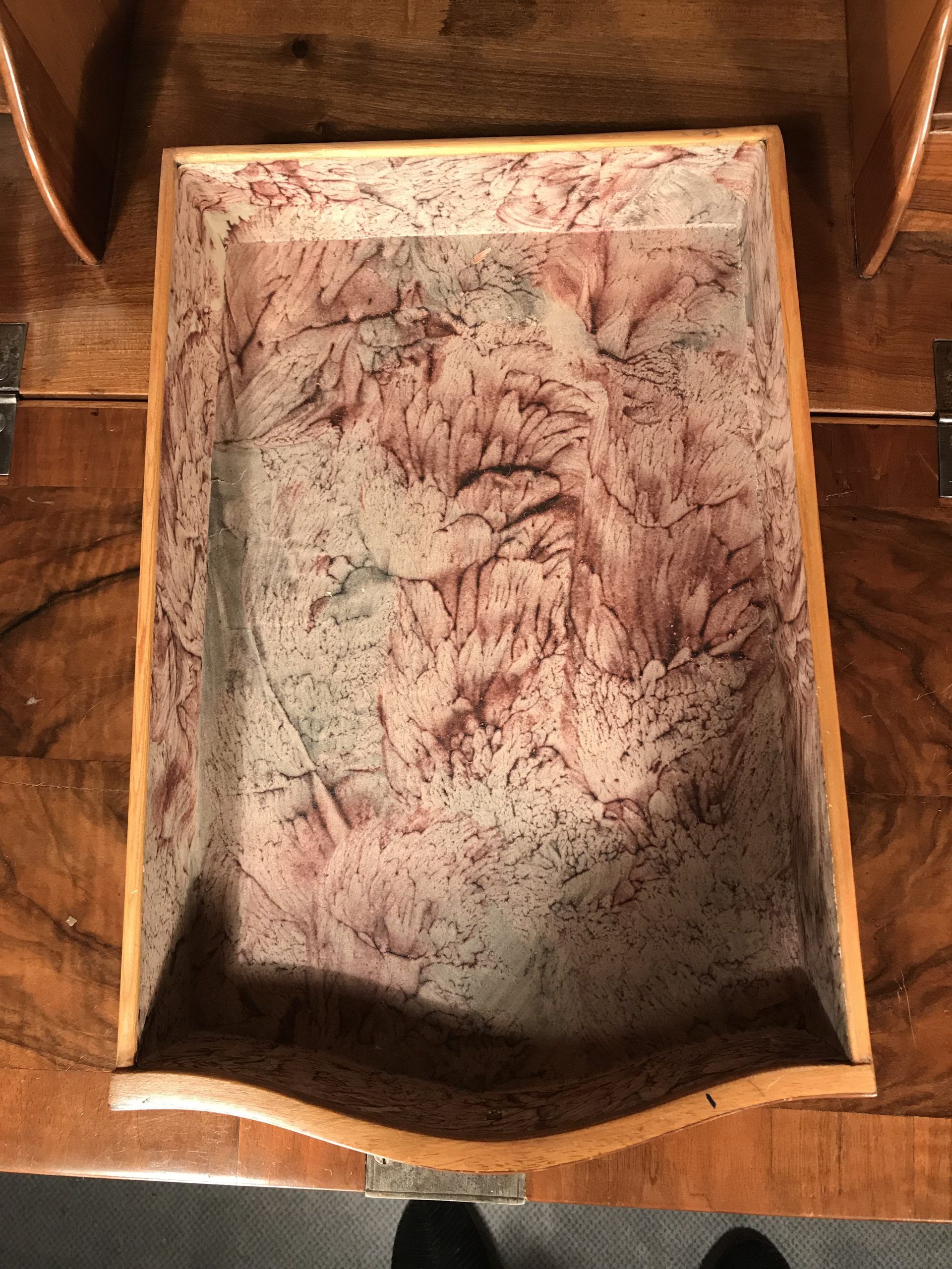 As mentioned before, Funk was known for using the so called “Herrnhuter Kleisterpapier” (paste paper) to cover the inside of the drawers of his Baroque secretary or chest of drawers. You can find various examples of that in the pieces which are today in museum collections in Switzerland or southern Germany.