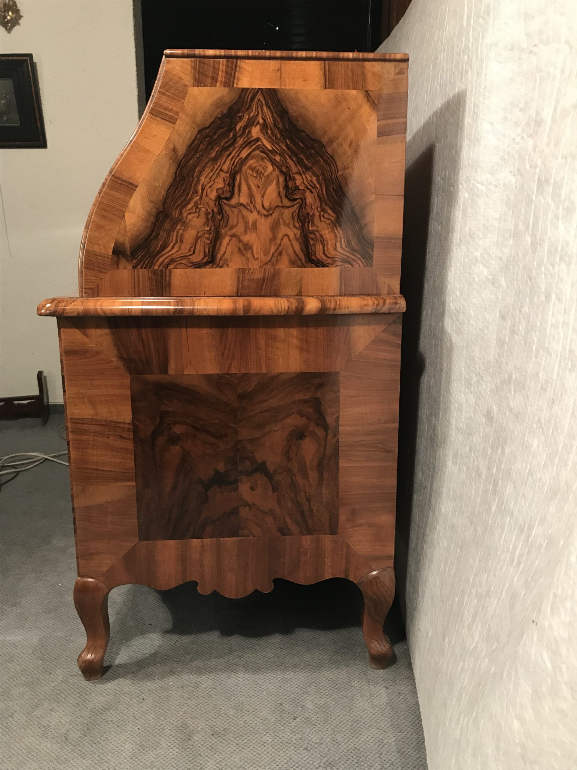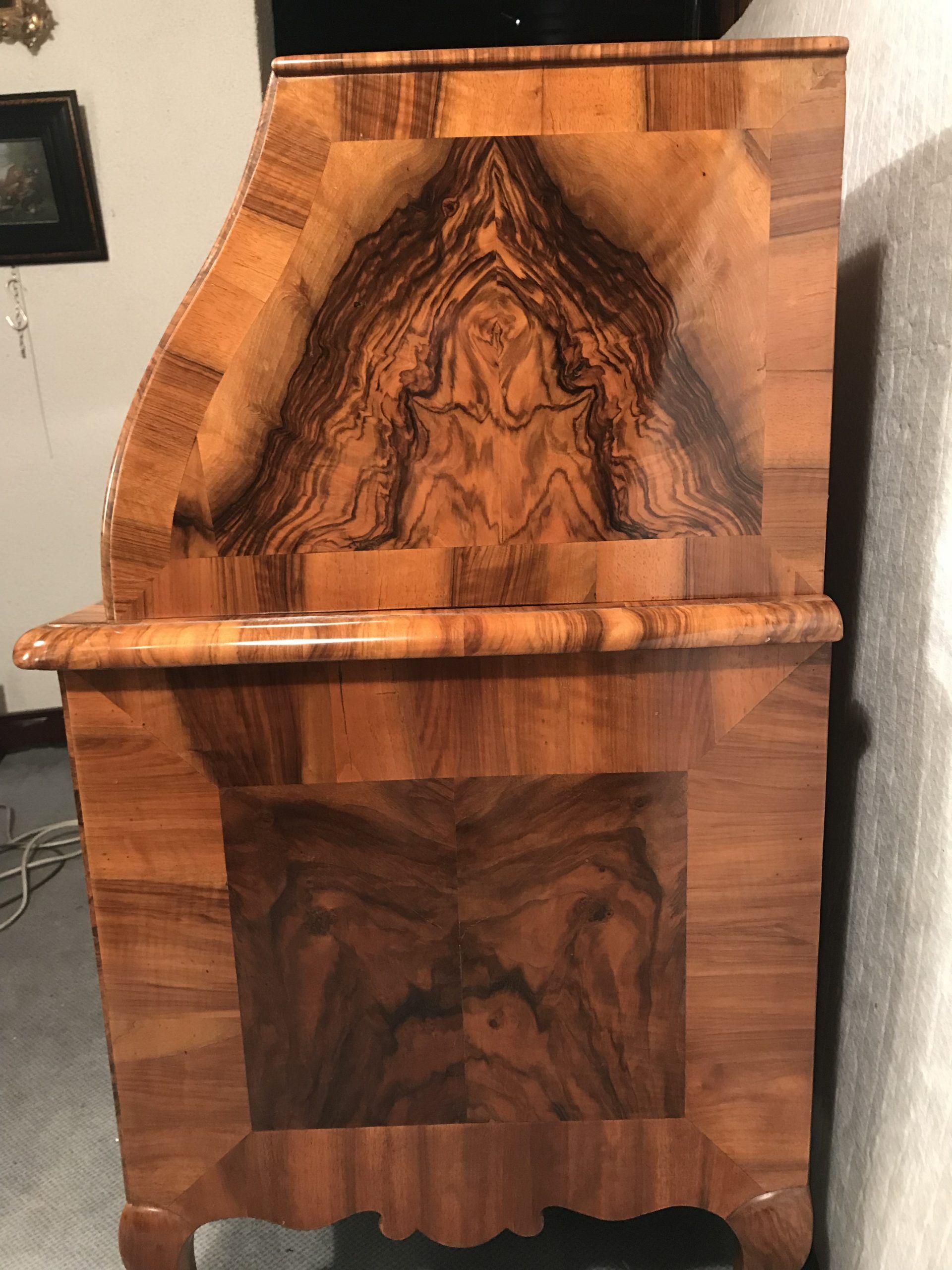 The Baroque secretary is in very good condition and has a nice original patina. It measures Height: 43.31 in. (110 cm), Width: 43.31 in. (110 cm), Depth: 25.99 in. (66 cm) and ships from Germany, and includes shipping costs to Boston.