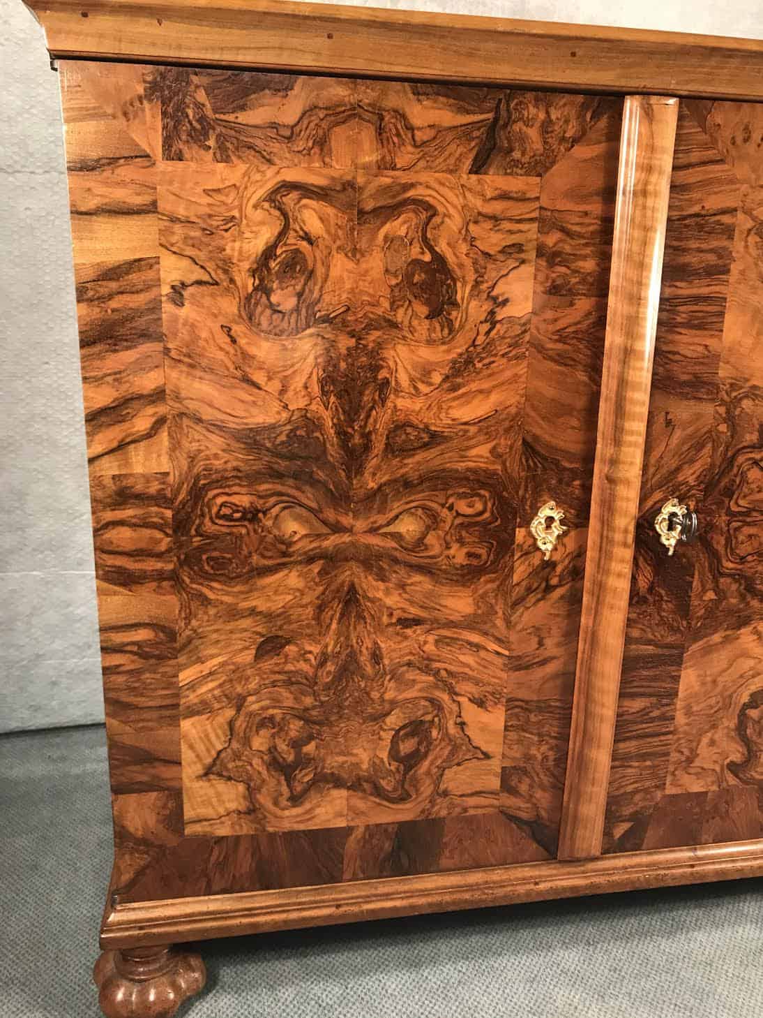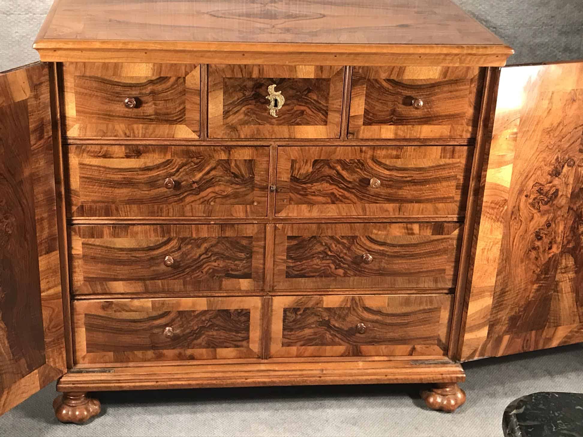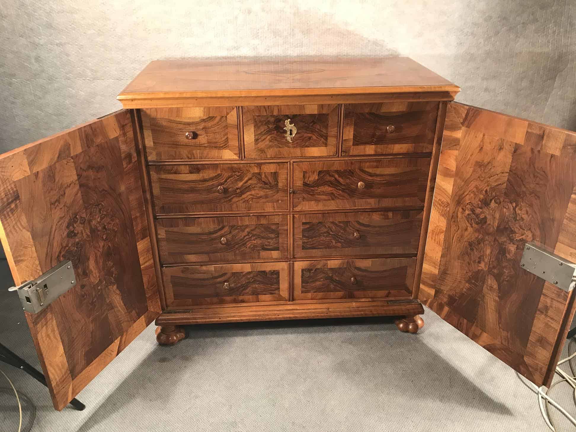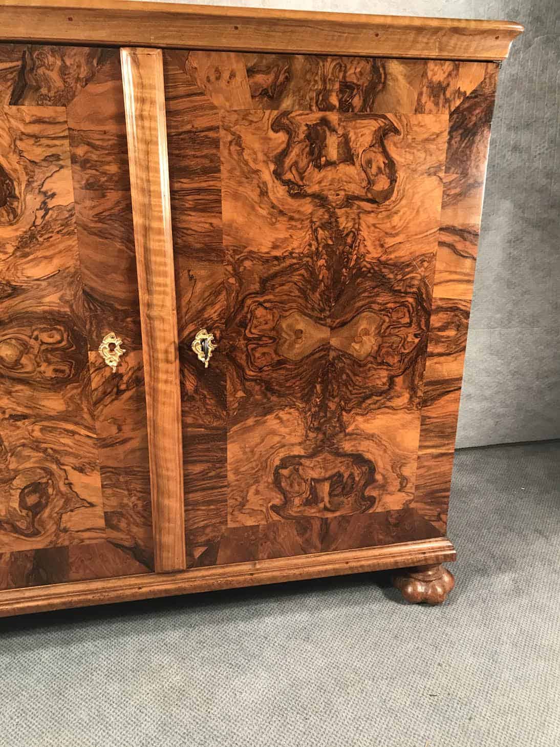 This Baroque sideboard dates back to the second half of the 18th century and comes from Switzerland. The cabinet has two doors, behind them are 9 smaller drawers. The drawers and the outside and inside of the doors have a gorgeous walnut veneer. Another special feature are the four unusual original Baroque feet. Top and sides are also embellished with walnut veneer.